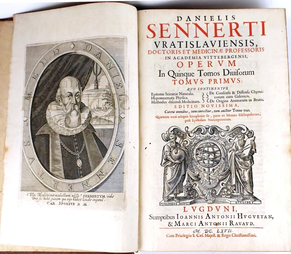 Oferowane dzieło zawiera w t.1 księgę konsensusu i niezgody chemików z Arystotelesami i Galenistami, najnowsze wydanie uosobienia nauk przyrodniczych; w t.2: Instytucje medyczne - księga piąta, O gorączce - księga czwarta; Garść leków na zarazę.