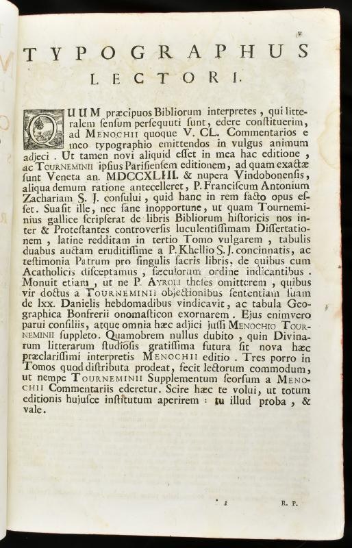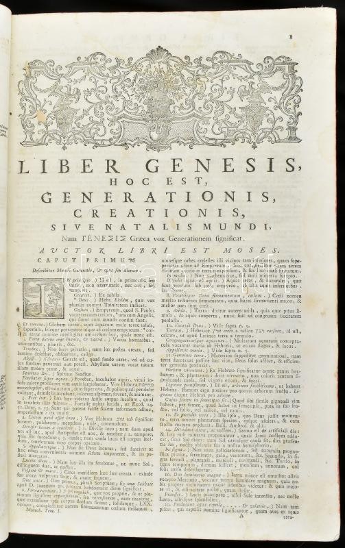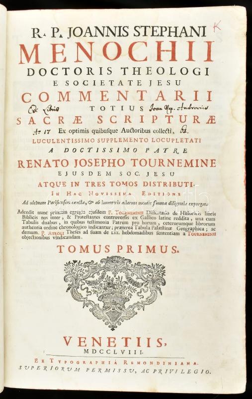 Menochio, Giovanni Stefano: Commentarii Totius Sacrae Scripturae. Tom. 1-3. (Egybe kötve) XVIII, 400, 448, 448 p. Korabeli, sérült bordázott egészbőr kötésben. / I damaged leather binding.