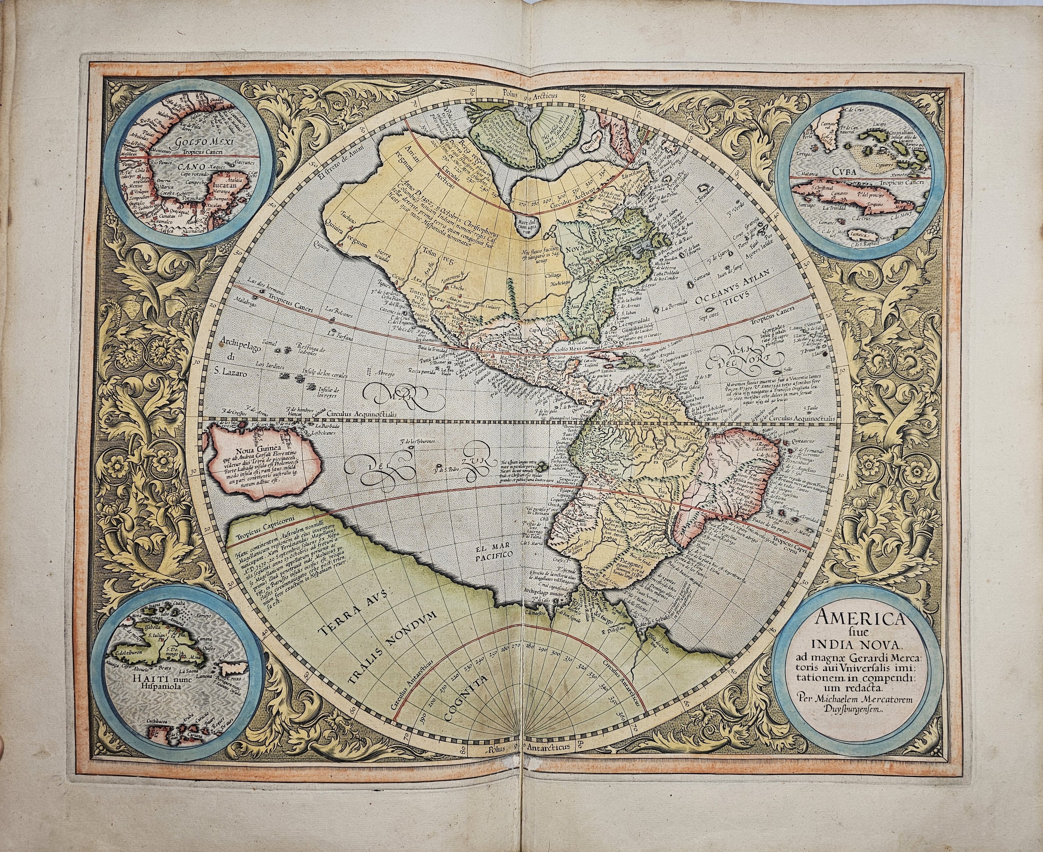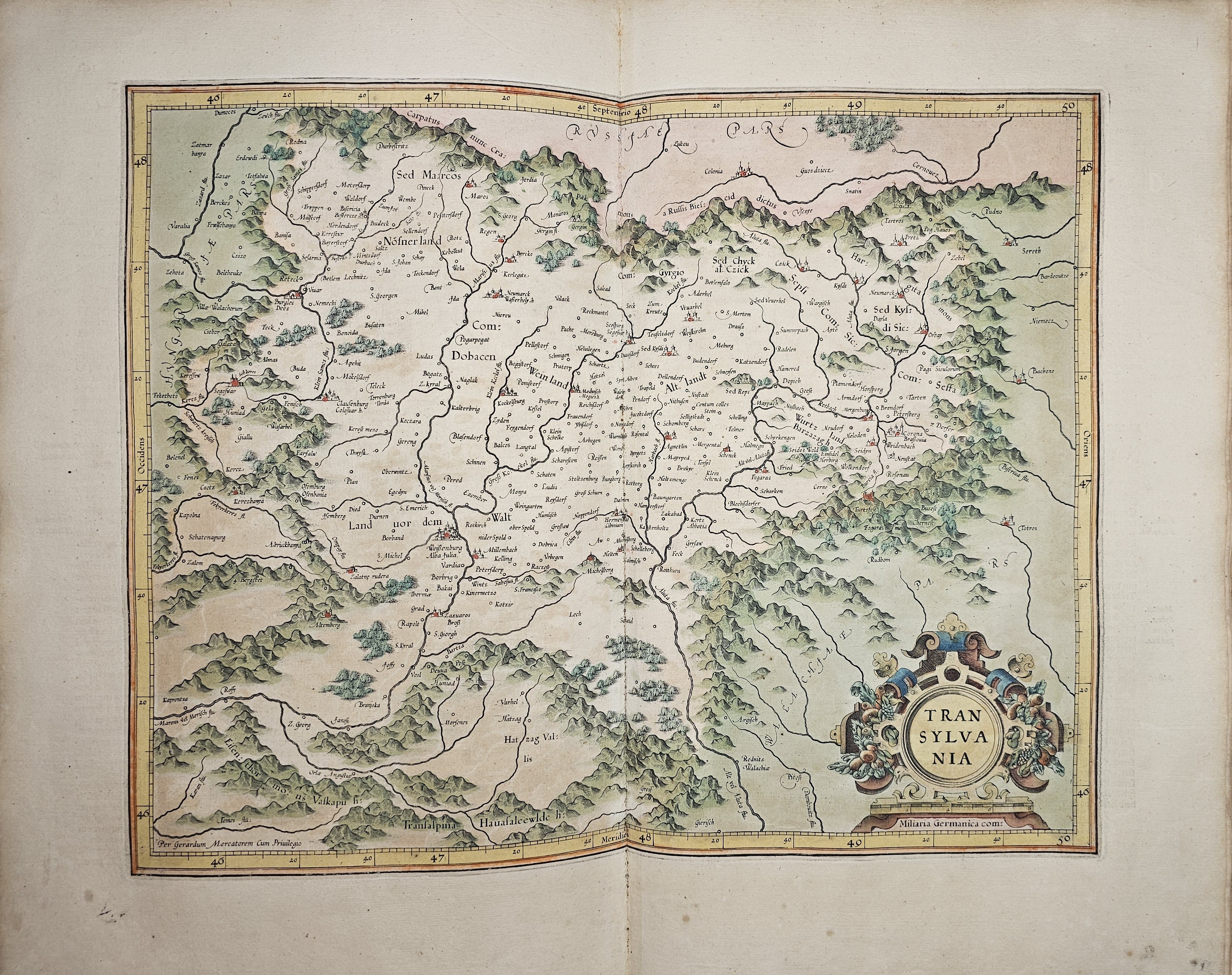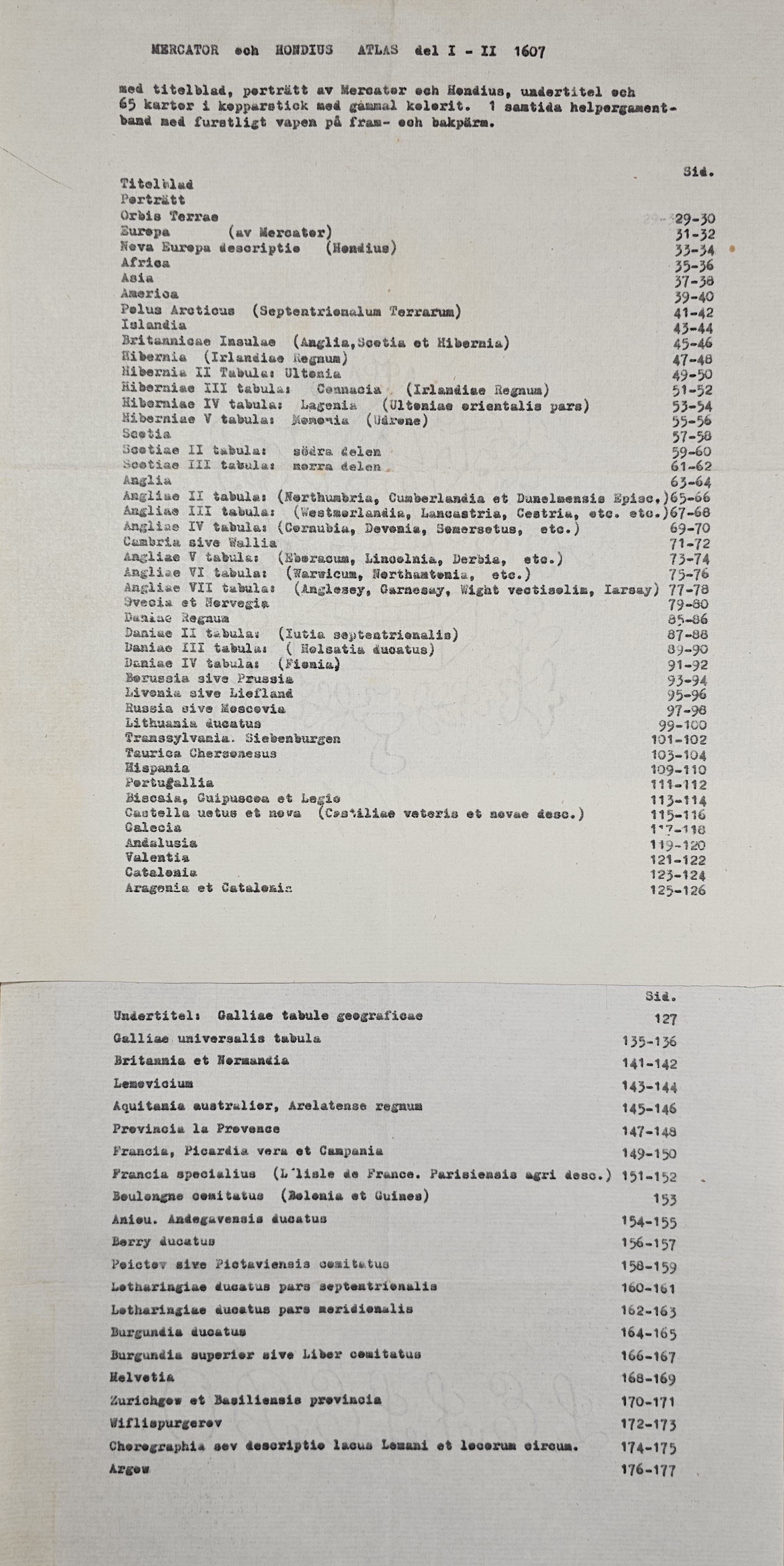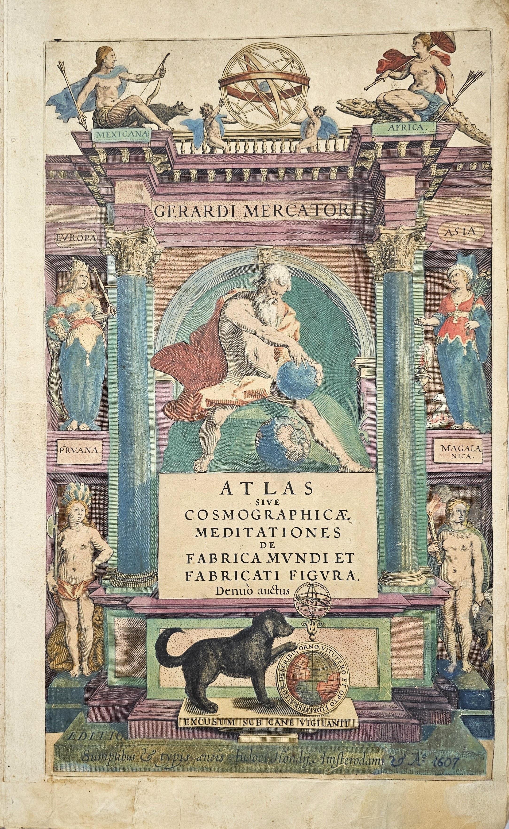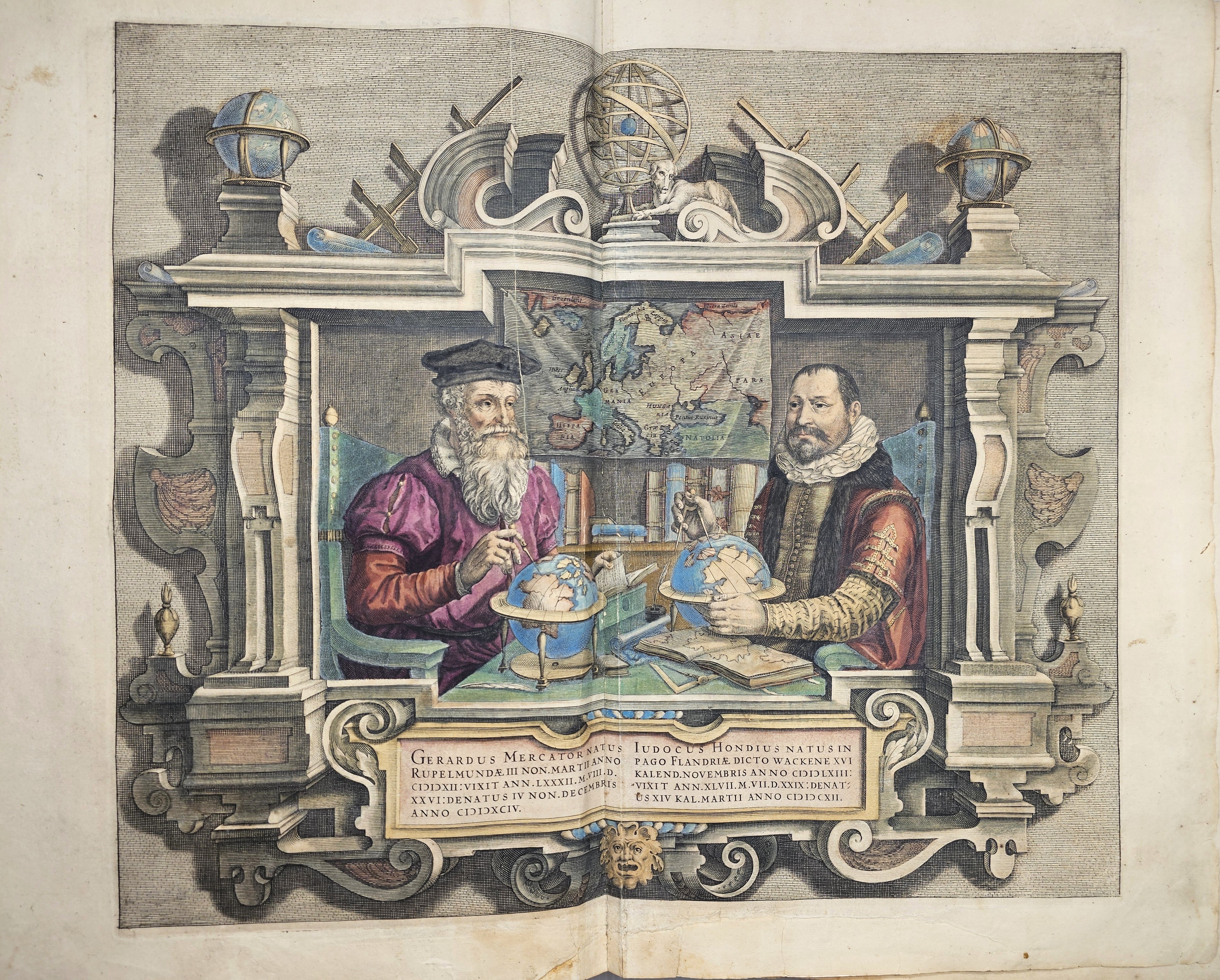 Amsterodami 1607 Exusum in aedibus Iudoci Hondij. Editio Secunda qua et ampliores descriptiones et novae Tabulaae Geographicae accesserunt. Część 1-2 [z 3-4] w 1 wol. Folio: 48 cm, karta tytuł., s. [6], 2 k: portret Mercatora i Hondiusa. Błędy w paginacji. s. [10], s. 177 (w tym 65 map: miedzioryty kolorowane), s. [12]: Indeks. Oprawa renesansowa, radełkowa, pergaminowa: grzbiet sześciopolowy, zwięzy wypukłe, w 1 polu odręczna tytulatura; na licu i tyle opr. książęcy superexlibris Victris Patientia Duris. Anno 1599. Oprawa i mapy w stanie dobrym. Ładny, kompletny egzemplarz. Holenderskie, drugie wydanie. Rzadko spotykane na rynku antykwarycznym.