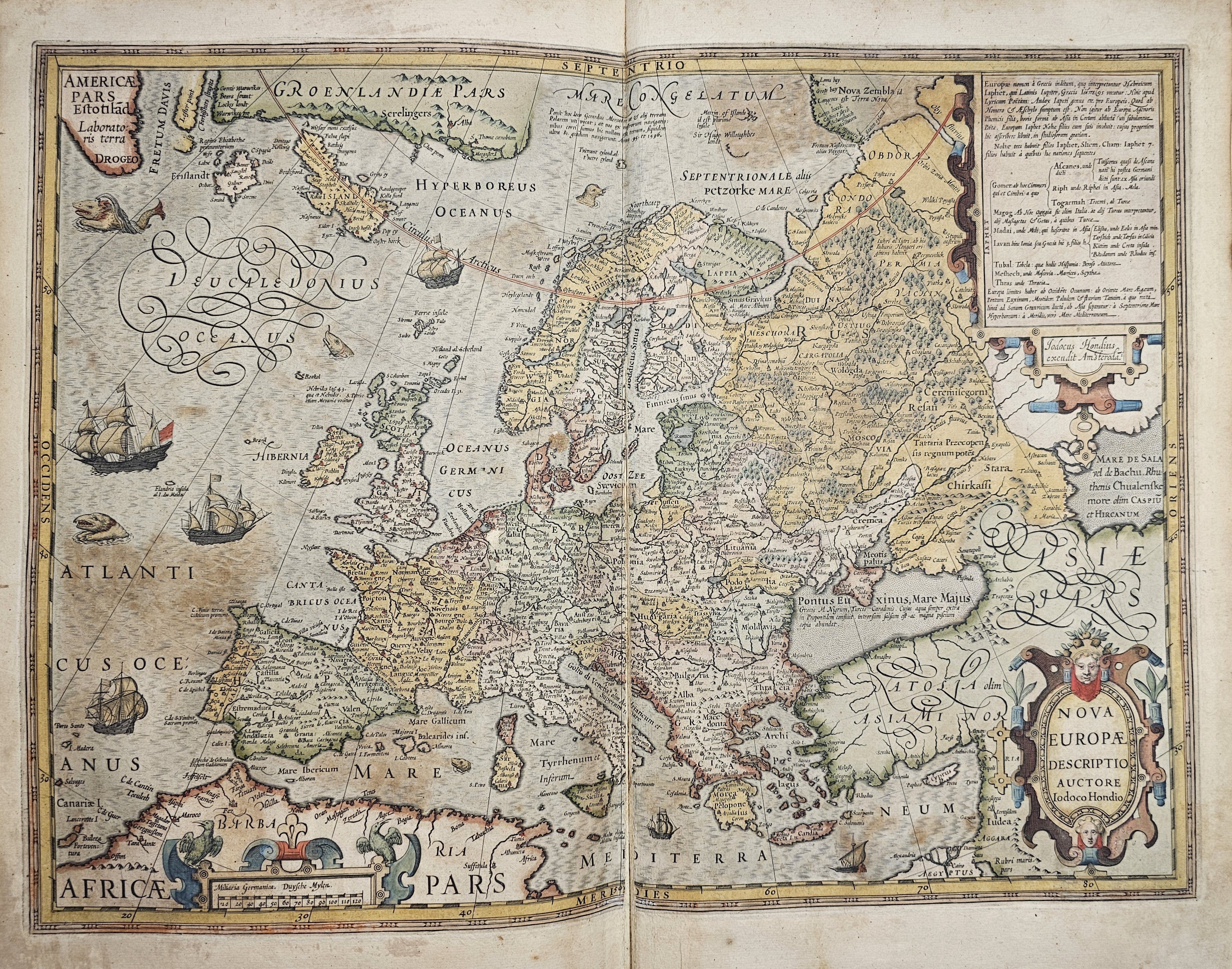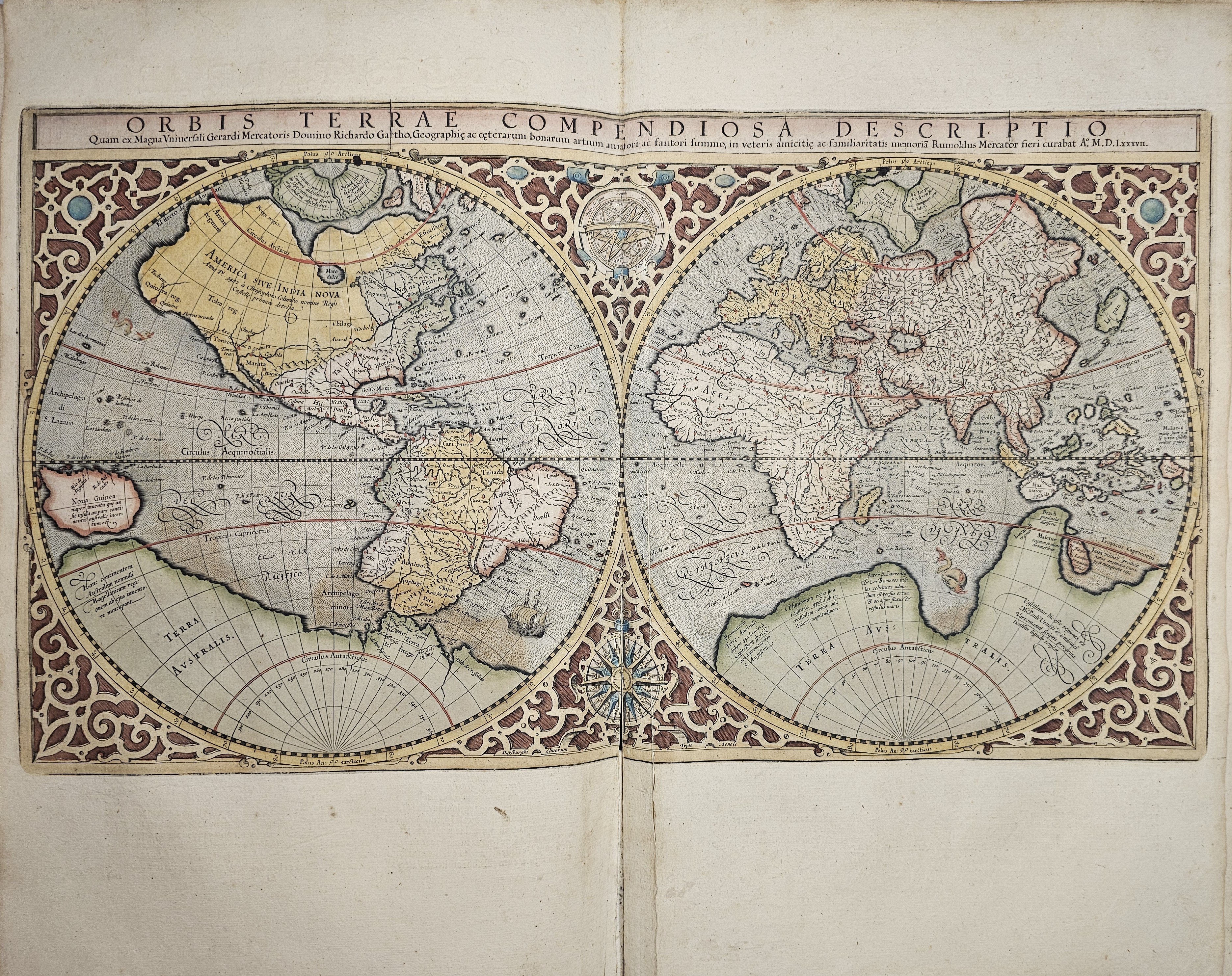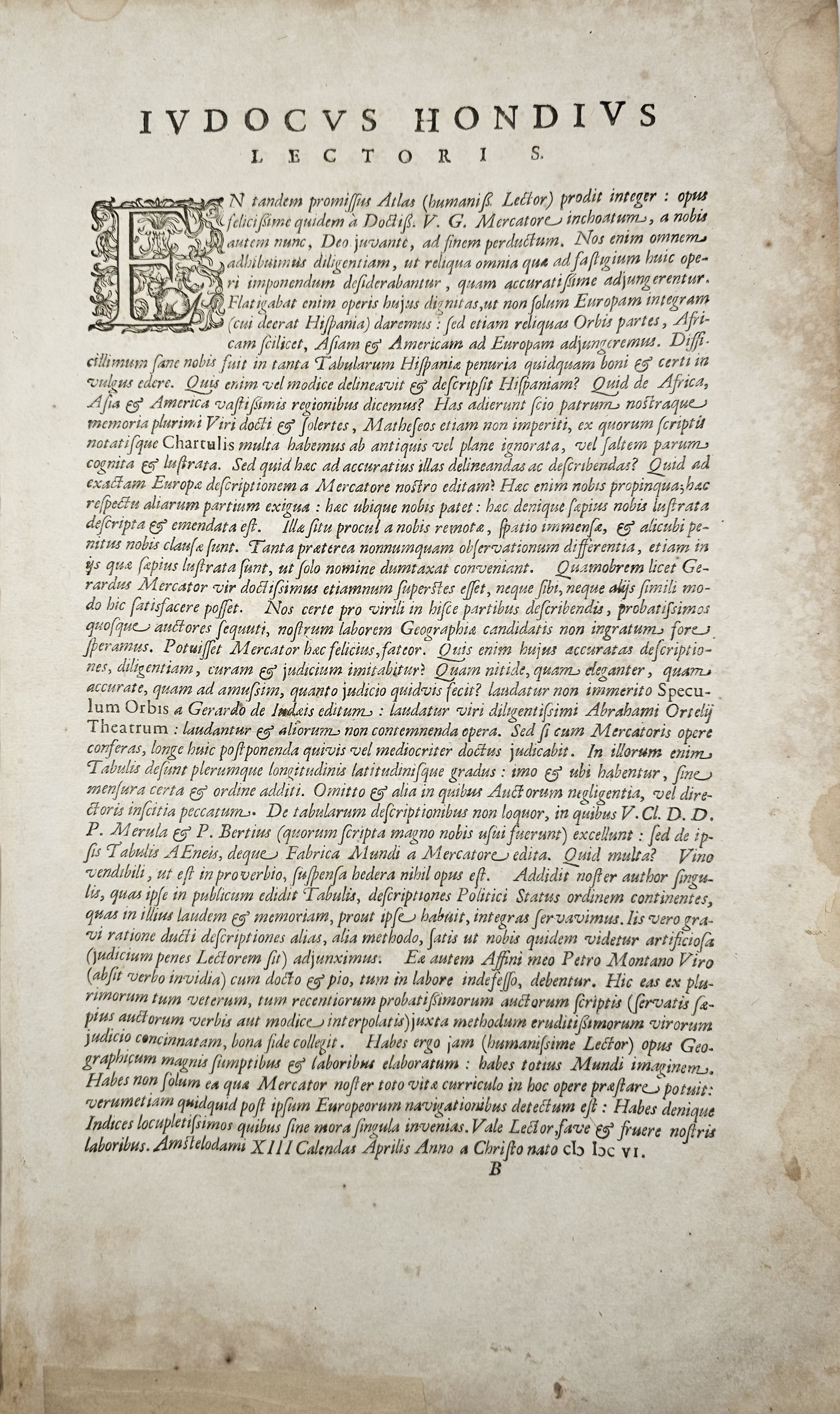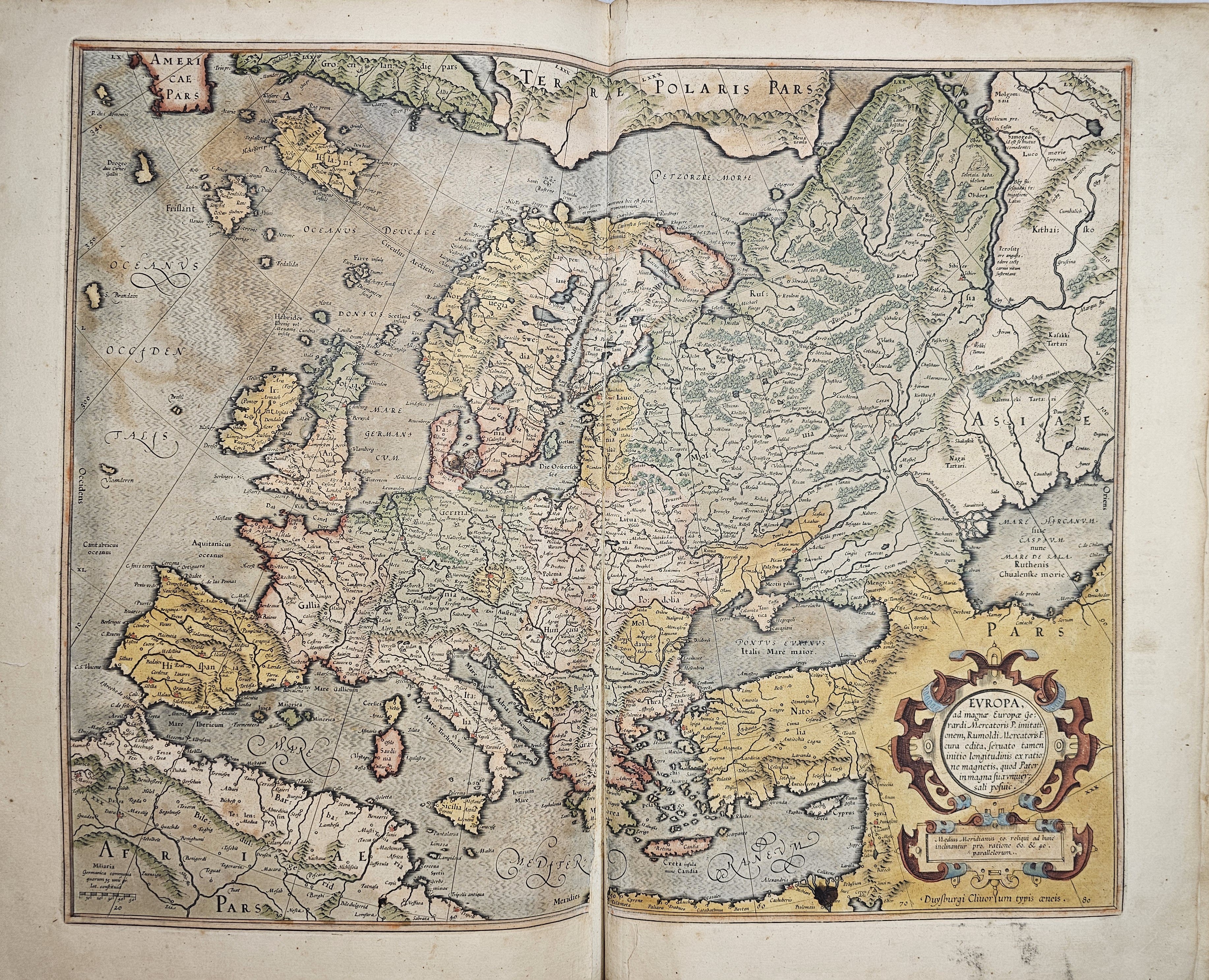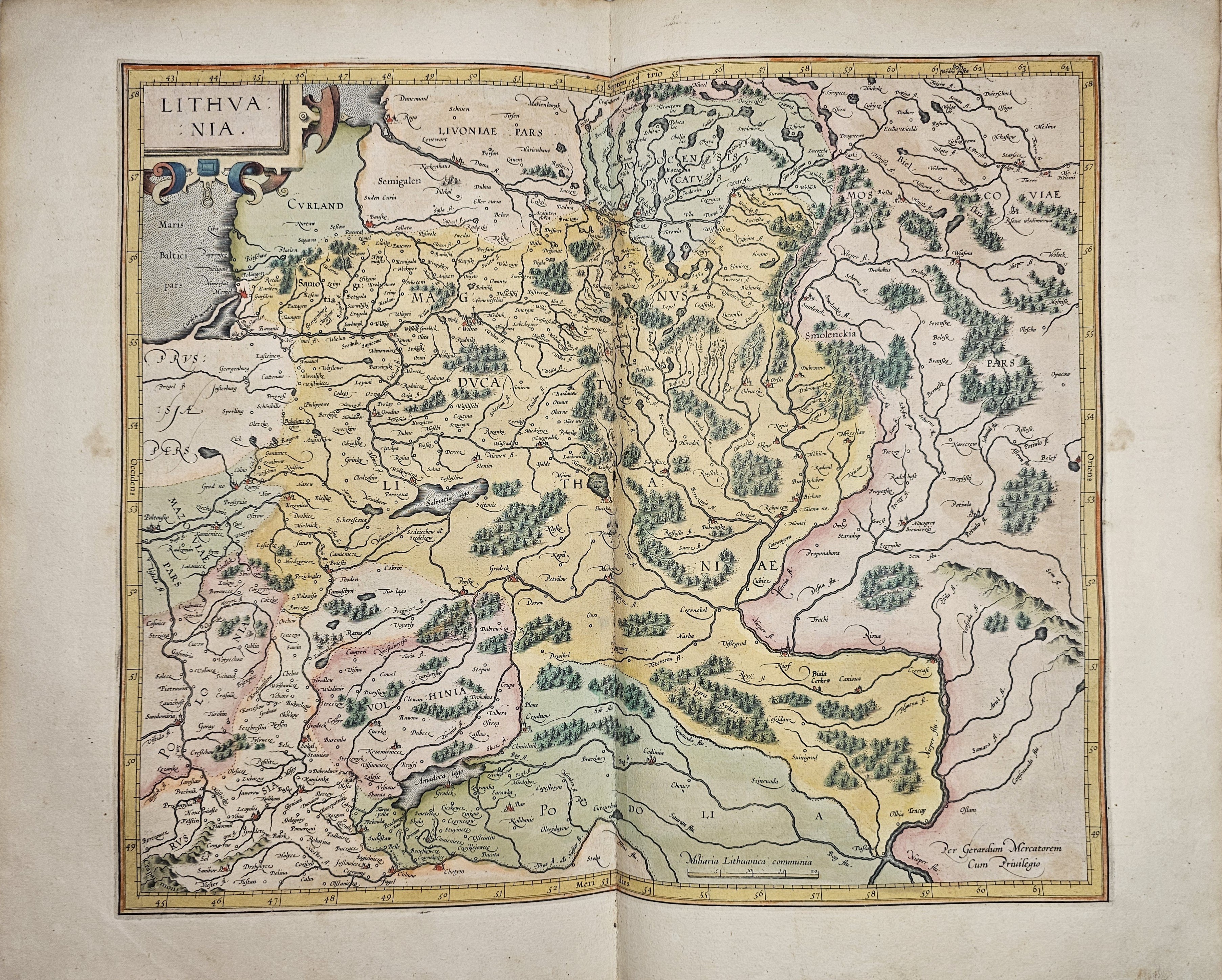 Amsterodami 1607 Exusum in aedibus Iudoci Hondij. Editio Secunda qua et ampliores descriptiones et novae Tabulaae Geographicae accesserunt. Część 1-2 [z 3-4] w 1 wol. Folio: 48 cm, karta tytuł., s. [6], 2 k: portret Mercatora i Hondiusa. Błędy w paginacji. s. [10], s. 177 (w tym 65 map: miedzioryty kolorowane), s. [12]: Indeks. Oprawa renesansowa, radełkowa, pergaminowa: grzbiet sześciopolowy, zwięzy wypukłe, w 1 polu odręczna tytulatura; na licu i tyle opr. książęcy superexlibris Victris Patientia Duris. Anno 1599. Oprawa i mapy w stanie dobrym. Ładny, kompletny egzemplarz. Holenderskie, drugie wydanie. Rzadko spotykane na rynku antykwarycznym.
