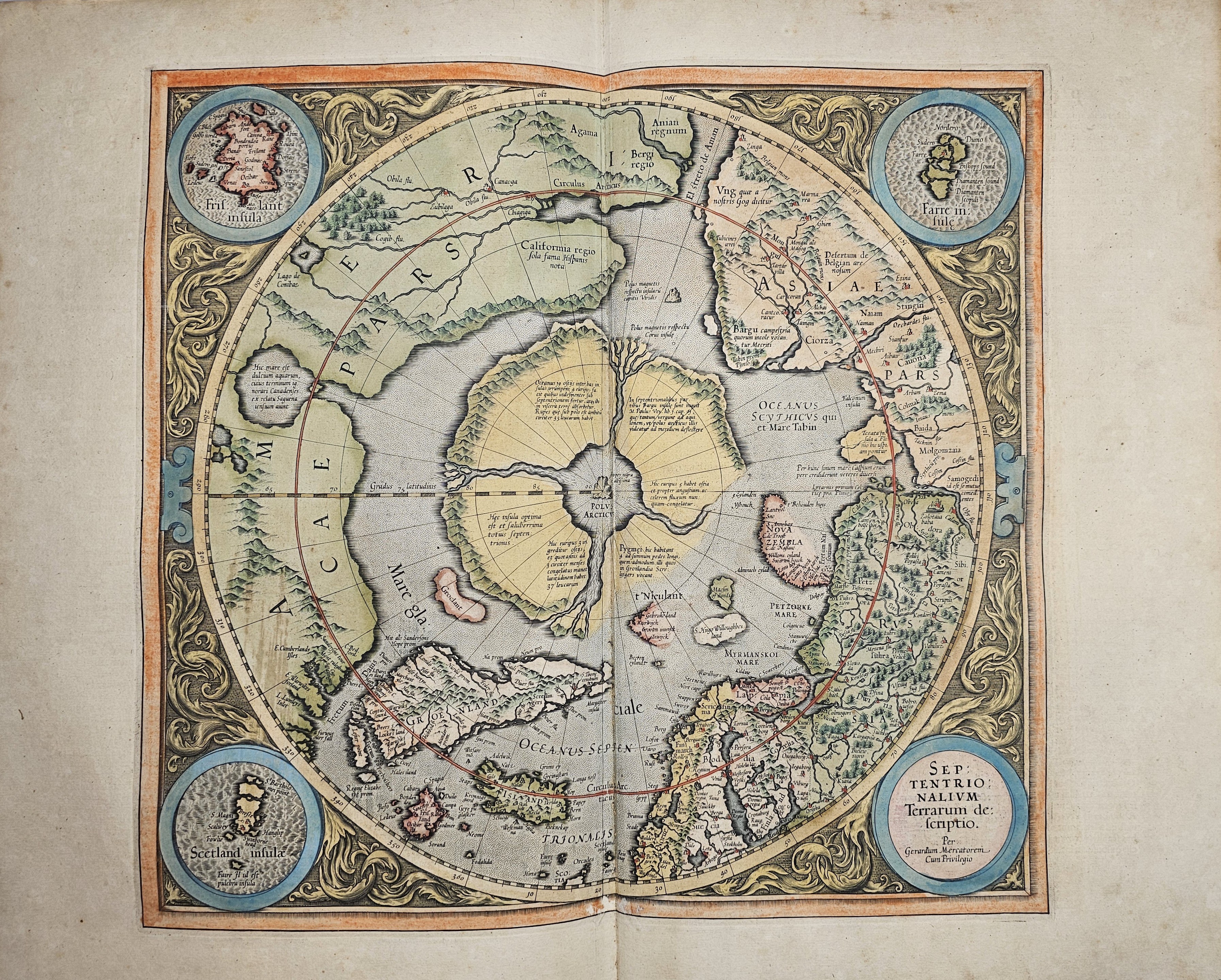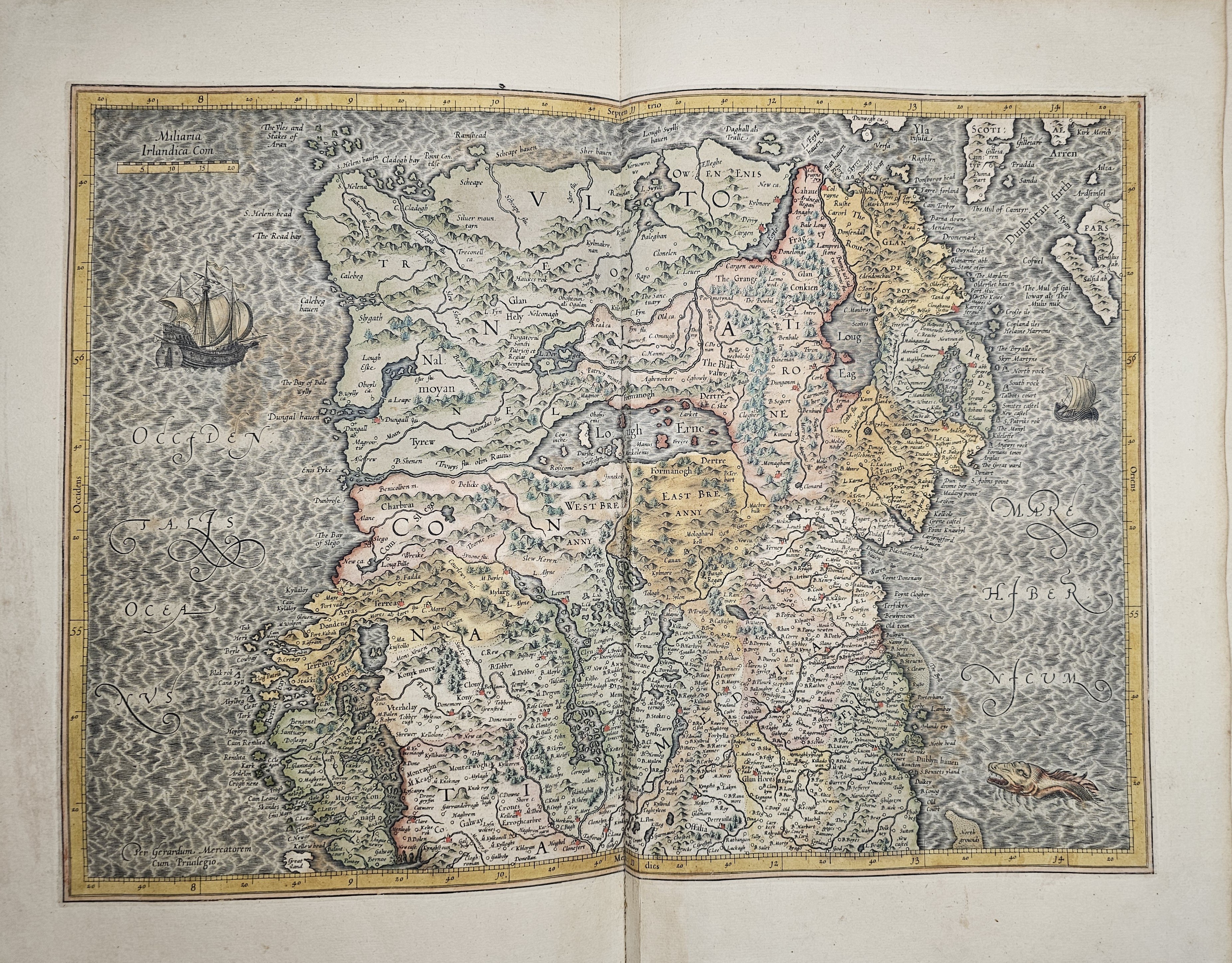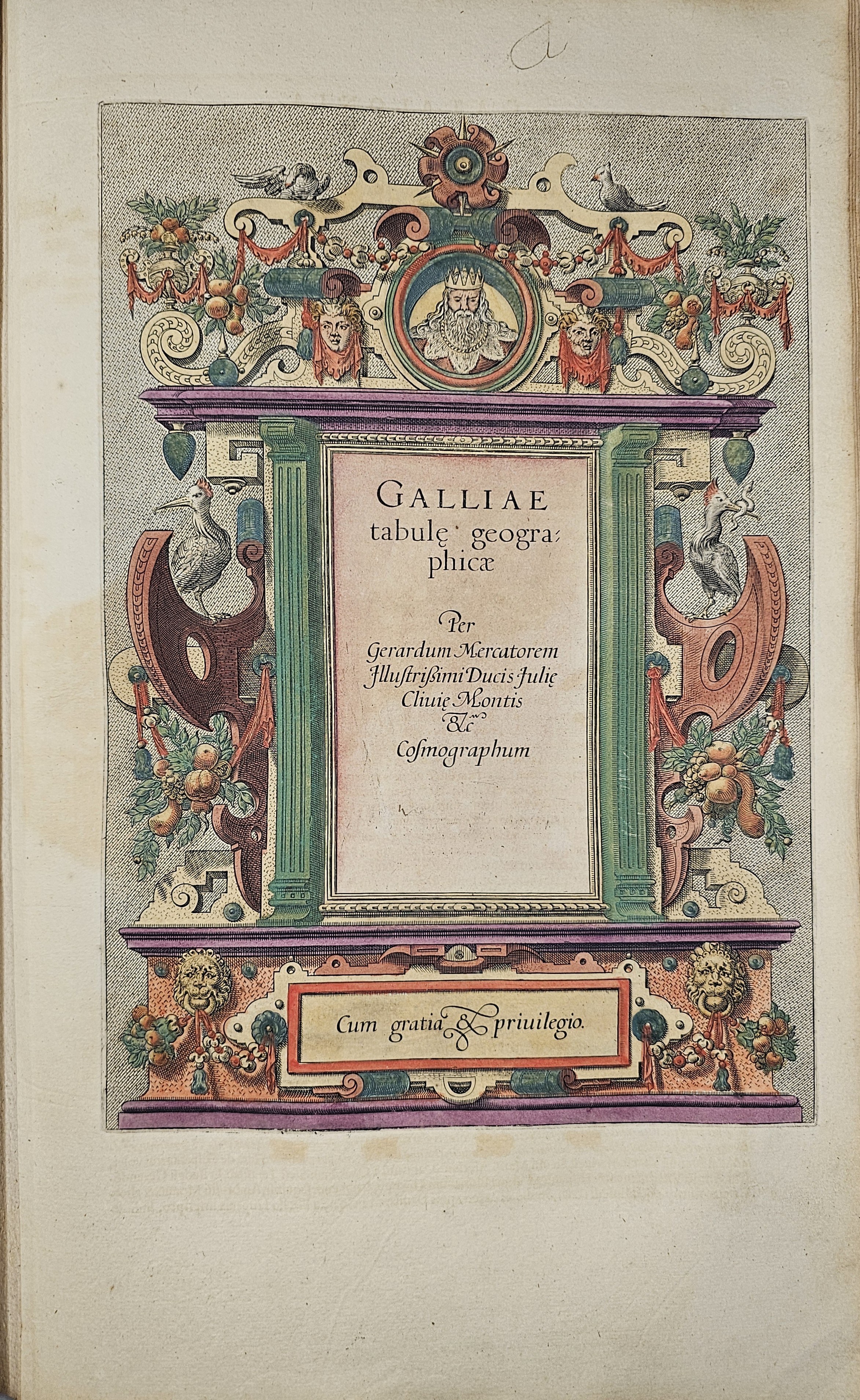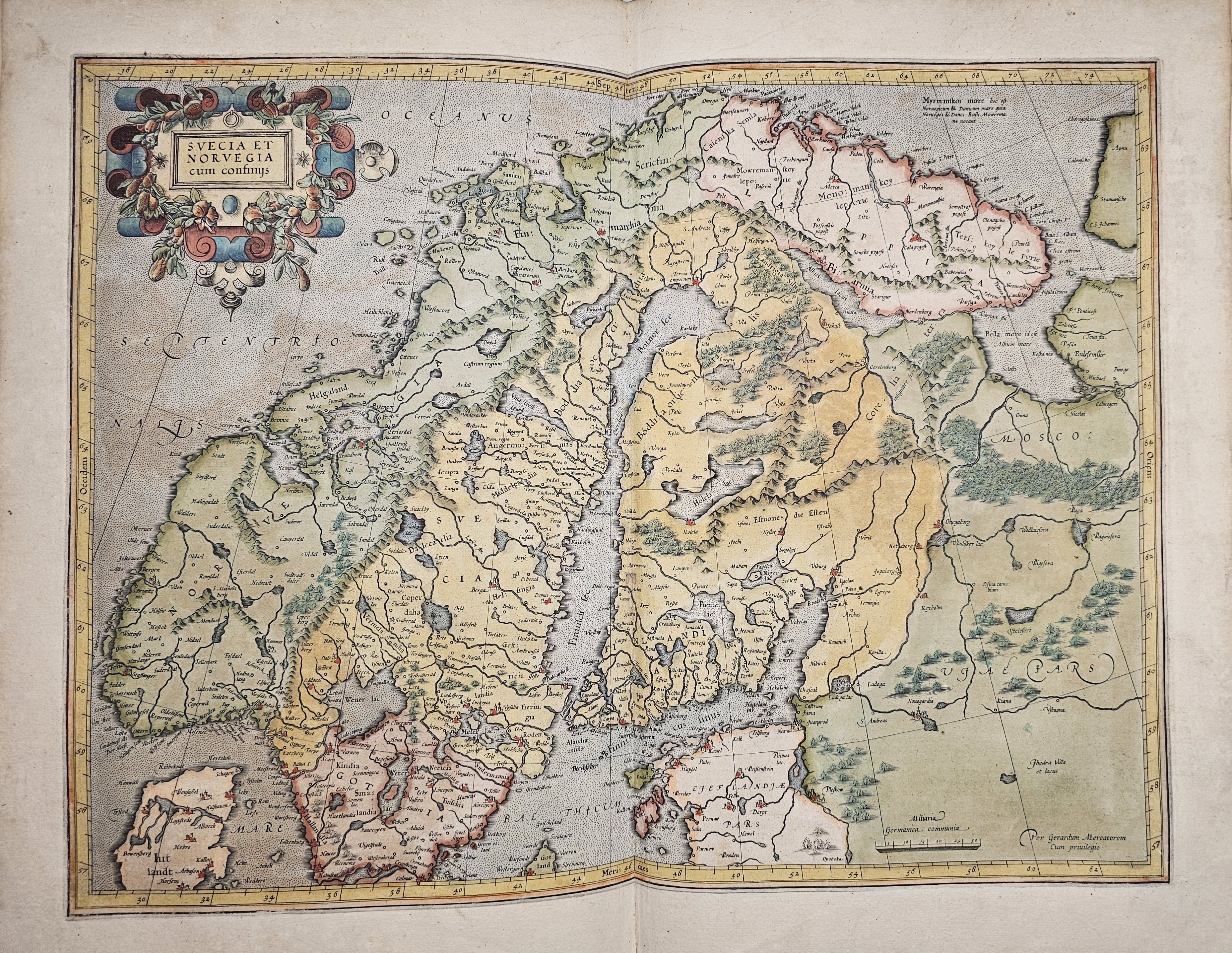 Amsterodami 1607 Exusum in aedibus Iudoci Hondij. Editio Secunda qua et ampliores descriptiones et novae Tabulaae Geographicae accesserunt. Część 1-2 [z 3-4] w 1 wol. Folio: 48 cm, karta tytuł., s. [6], 2 k: portret Mercatora i Hondiusa. Błędy w paginacji. s. [10], s. 177 (w tym 65 map: miedzioryty kolorowane), s. [12]: Indeks. Oprawa renesansowa, radełkowa, pergaminowa: grzbiet sześciopolowy, zwięzy wypukłe, w 1 polu odręczna tytulatura; na licu i tyle opr. książęcy superexlibris Victris Patientia Duris. Anno 1599. Oprawa i mapy w stanie dobrym. Ładny, kompletny egzemplarz. Holenderskie, drugie wydanie. Rzadko spotykane na rynku antykwarycznym.
