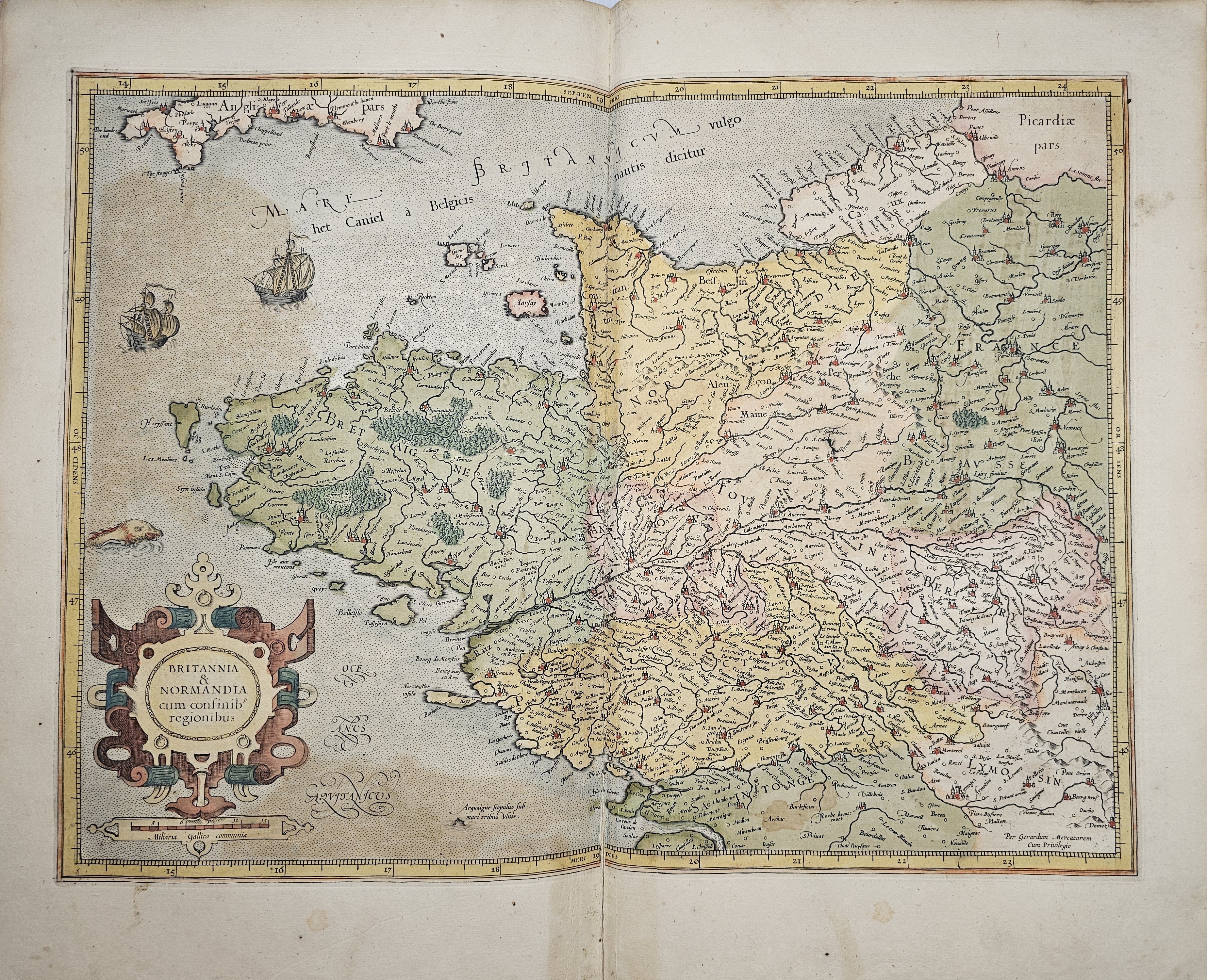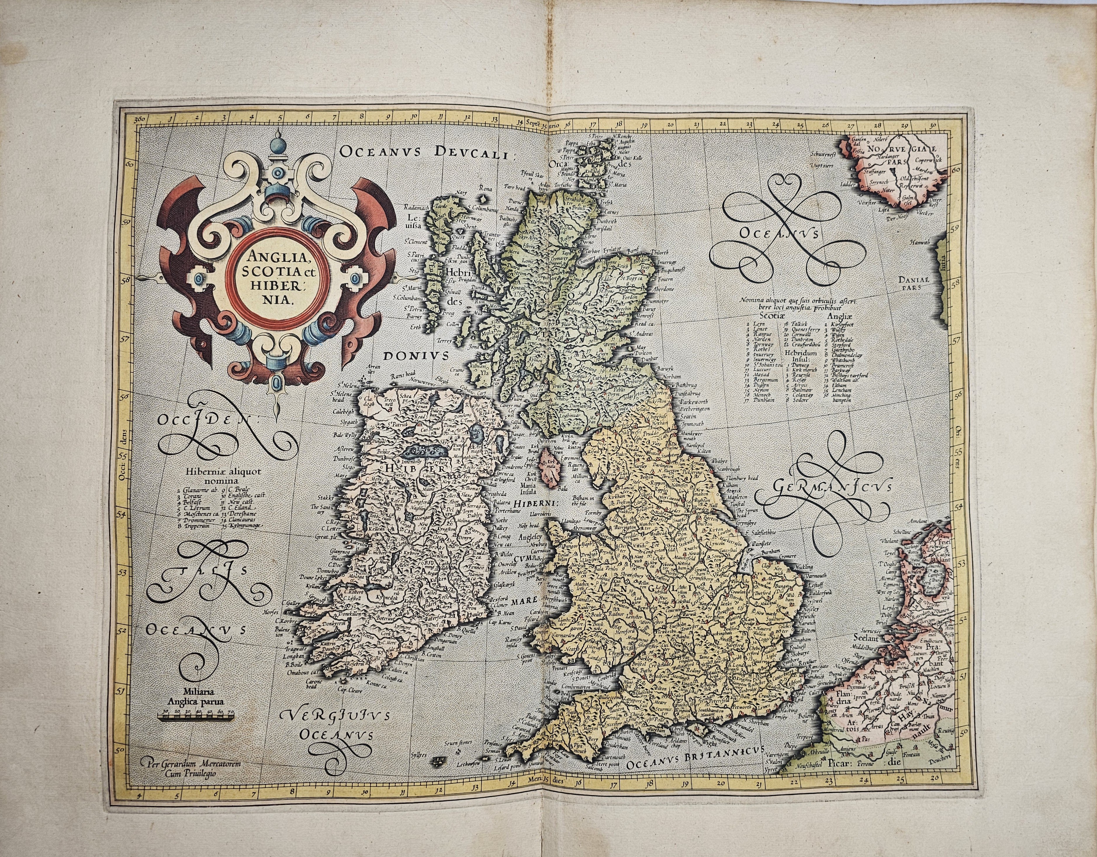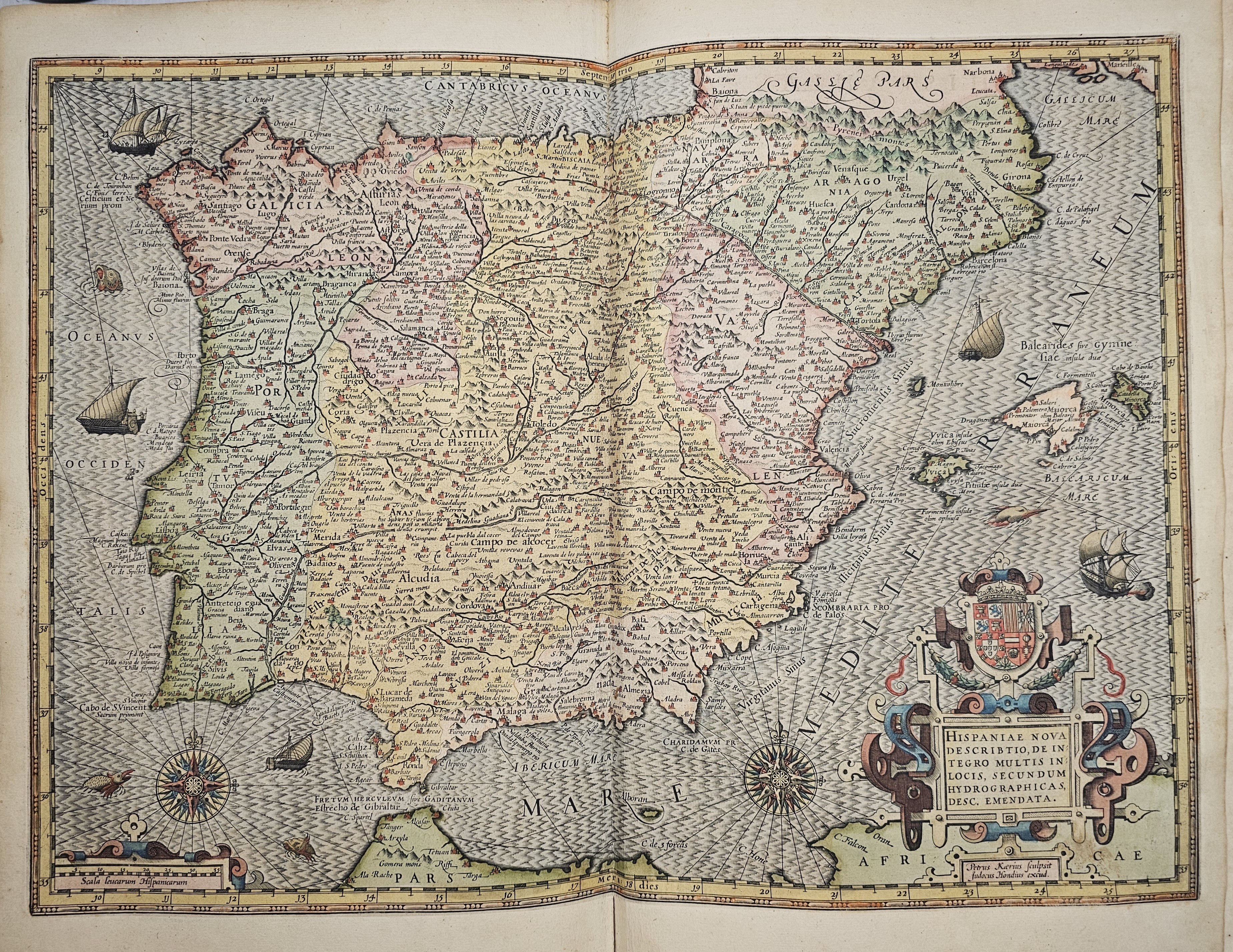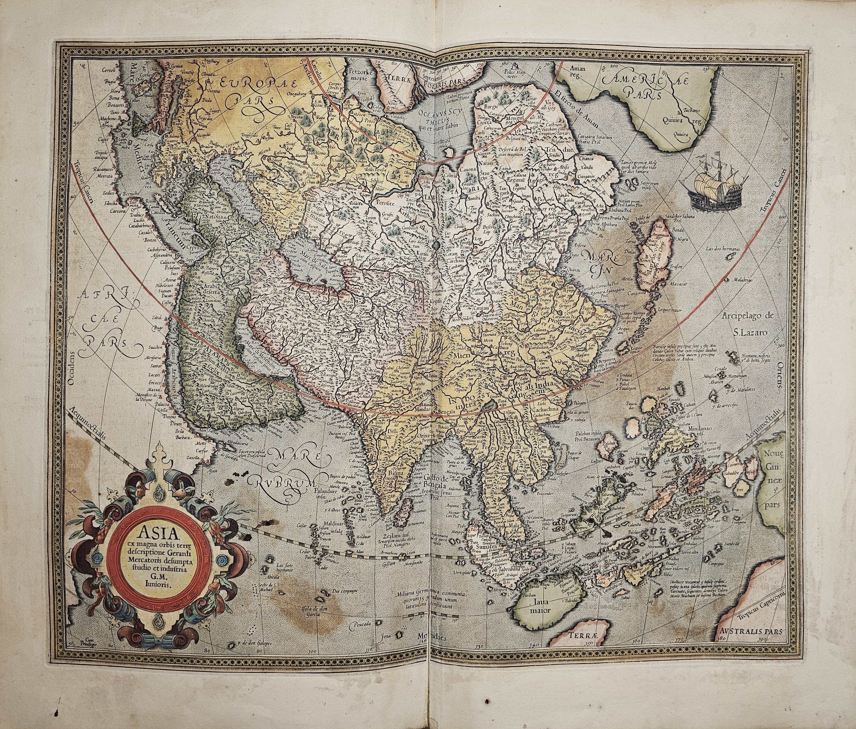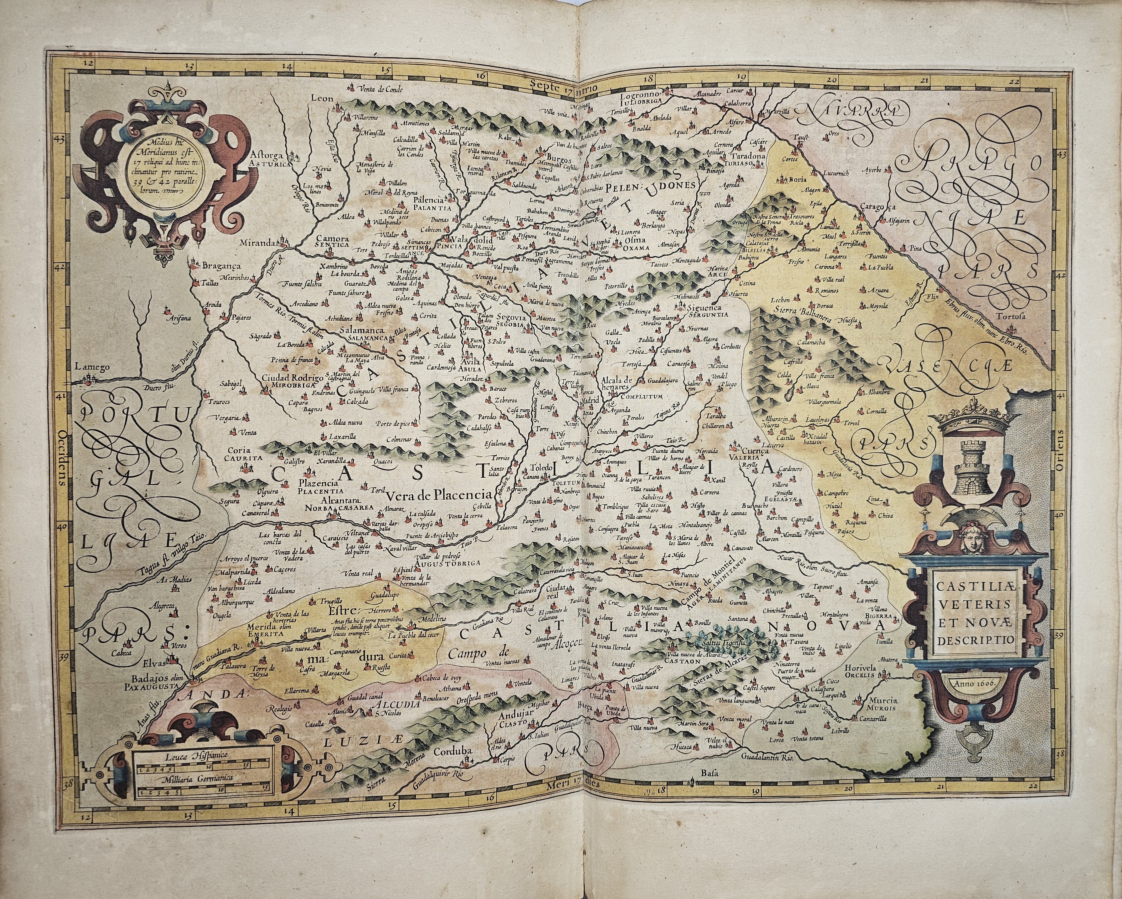 Amsterodami 1607 Exusum in aedibus Iudoci Hondij. Editio Secunda qua et ampliores descriptiones et novae Tabulaae Geographicae accesserunt. Część 1-2 [z 3-4] w 1 wol. Folio: 48 cm, karta tytuł., s. [6], 2 k: portret Mercatora i Hondiusa. Błędy w paginacji. s. [10], s. 177 (w tym 65 map: miedzioryty kolorowane), s. [12]: Indeks. Oprawa renesansowa, radełkowa, pergaminowa: grzbiet sześciopolowy, zwięzy wypukłe, w 1 polu odręczna tytulatura; na licu i tyle opr. książęcy superexlibris Victris Patientia Duris. Anno 1599. Oprawa i mapy w stanie dobrym. Ładny, kompletny egzemplarz. Holenderskie, drugie wydanie. Rzadko spotykane na rynku antykwarycznym.