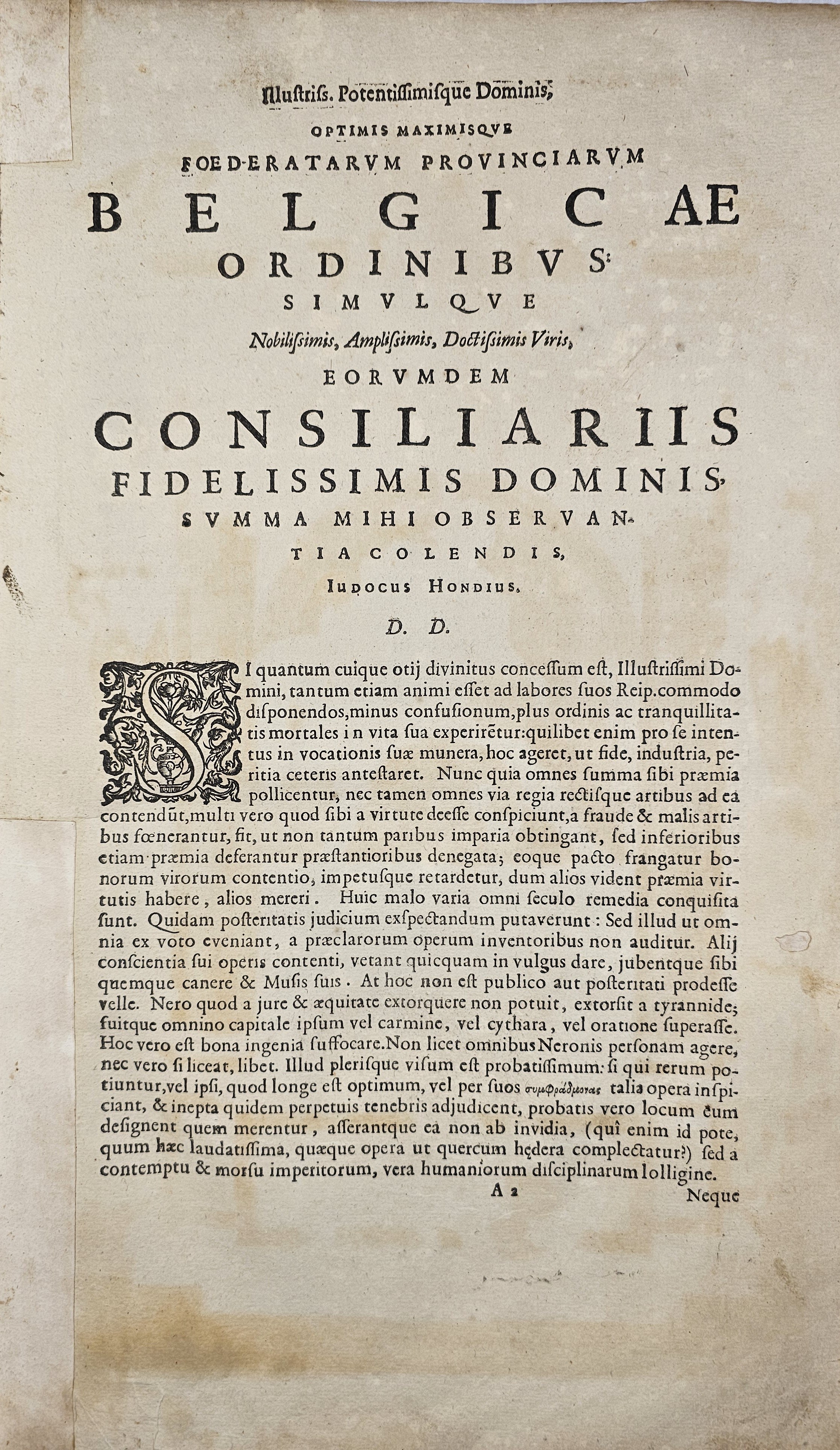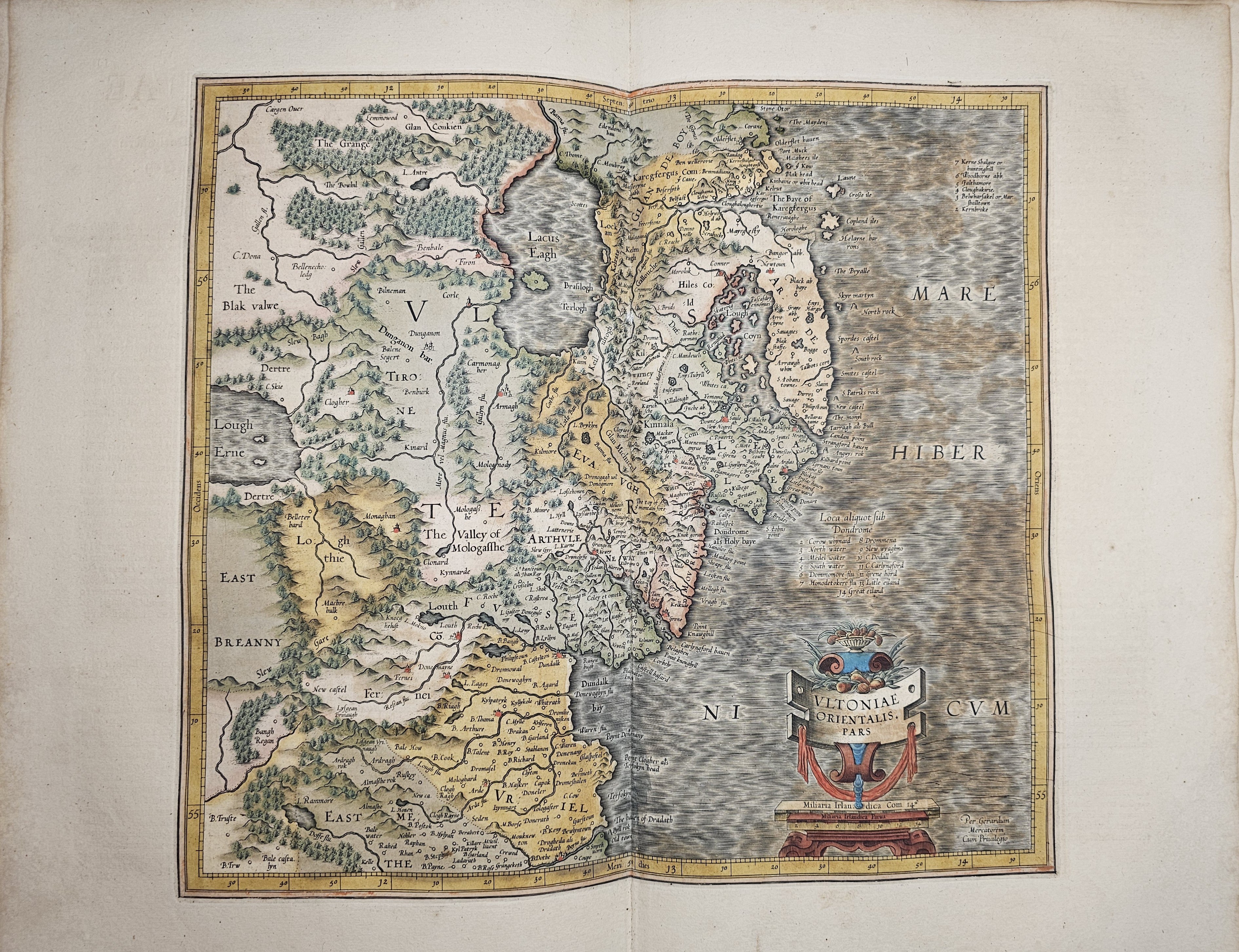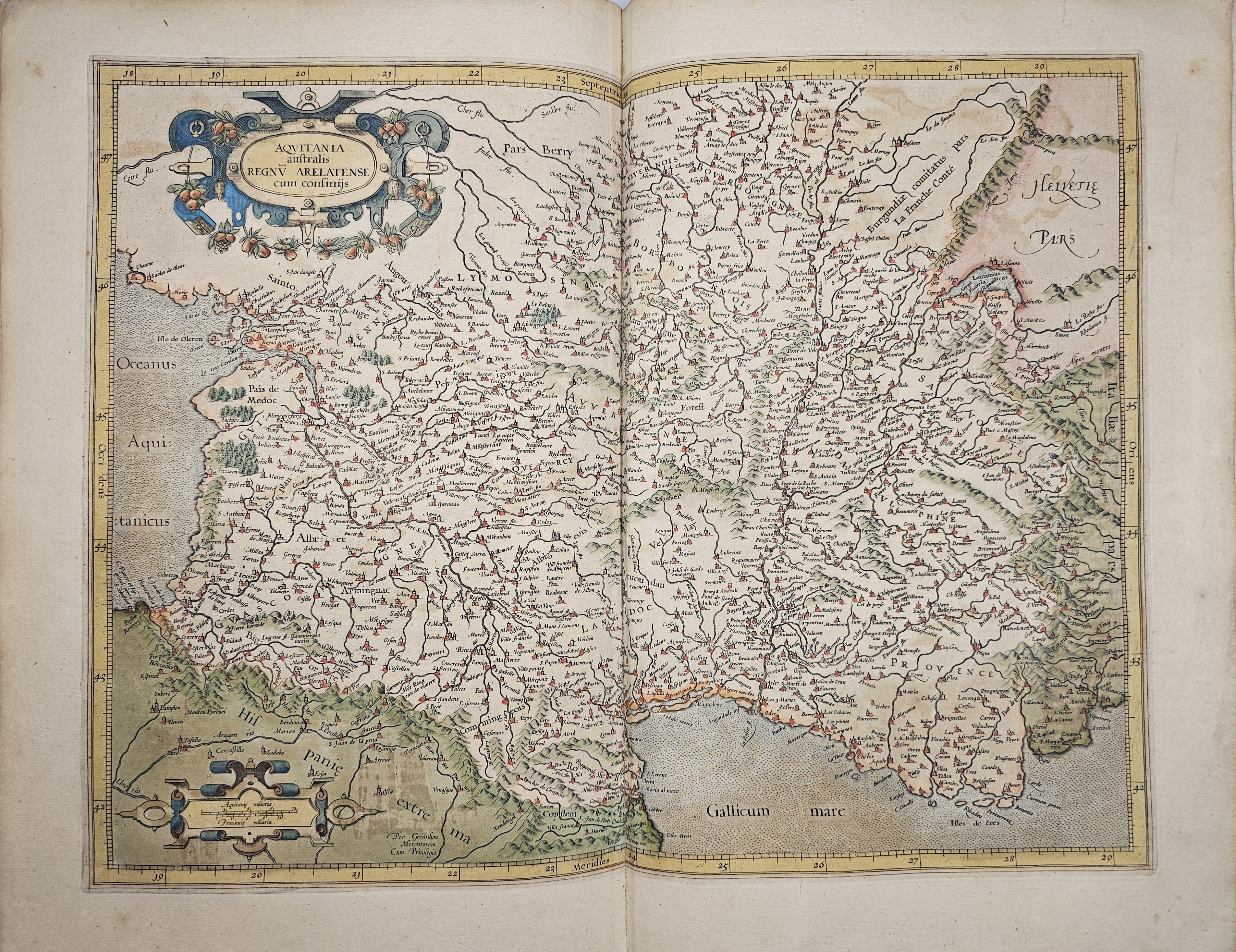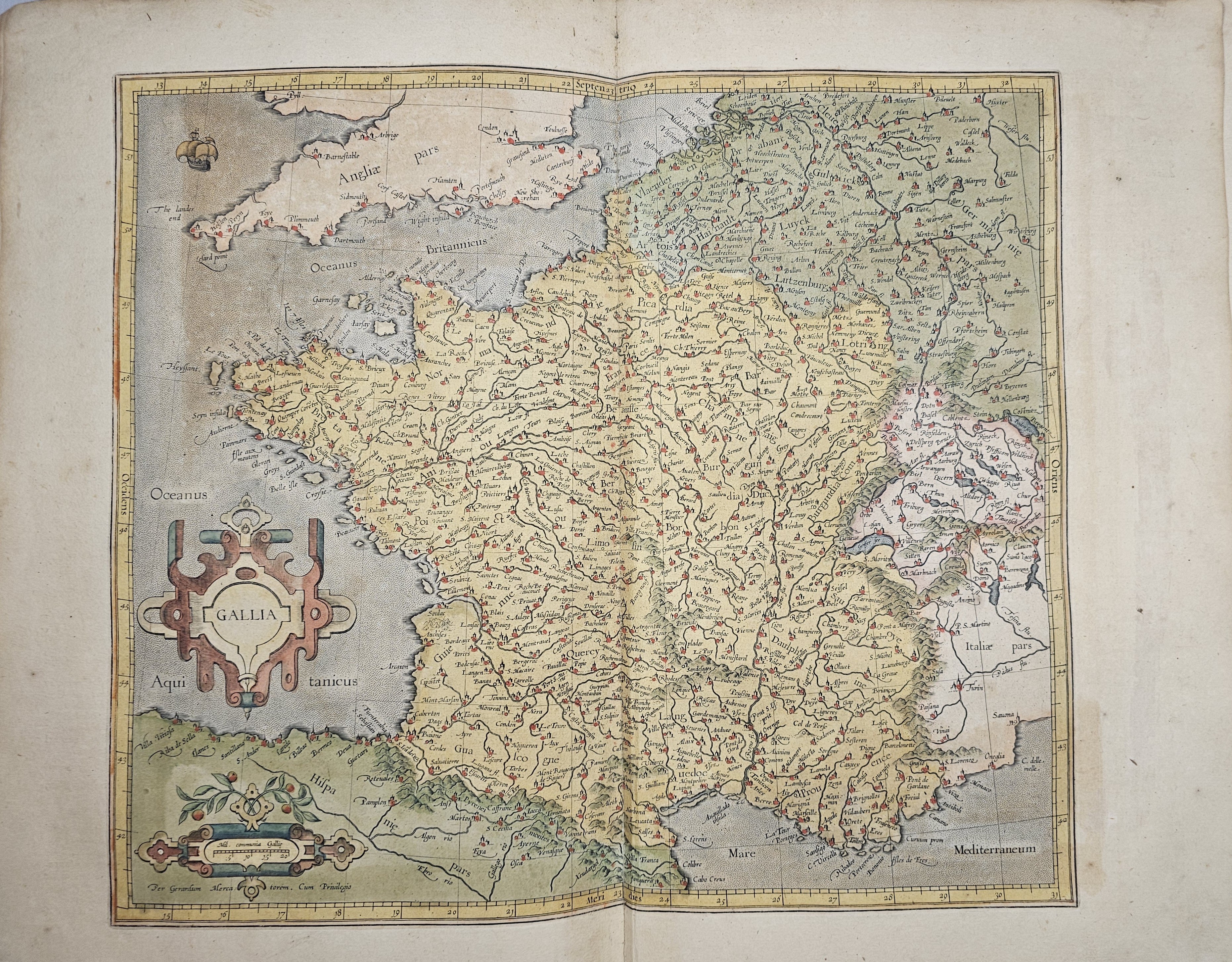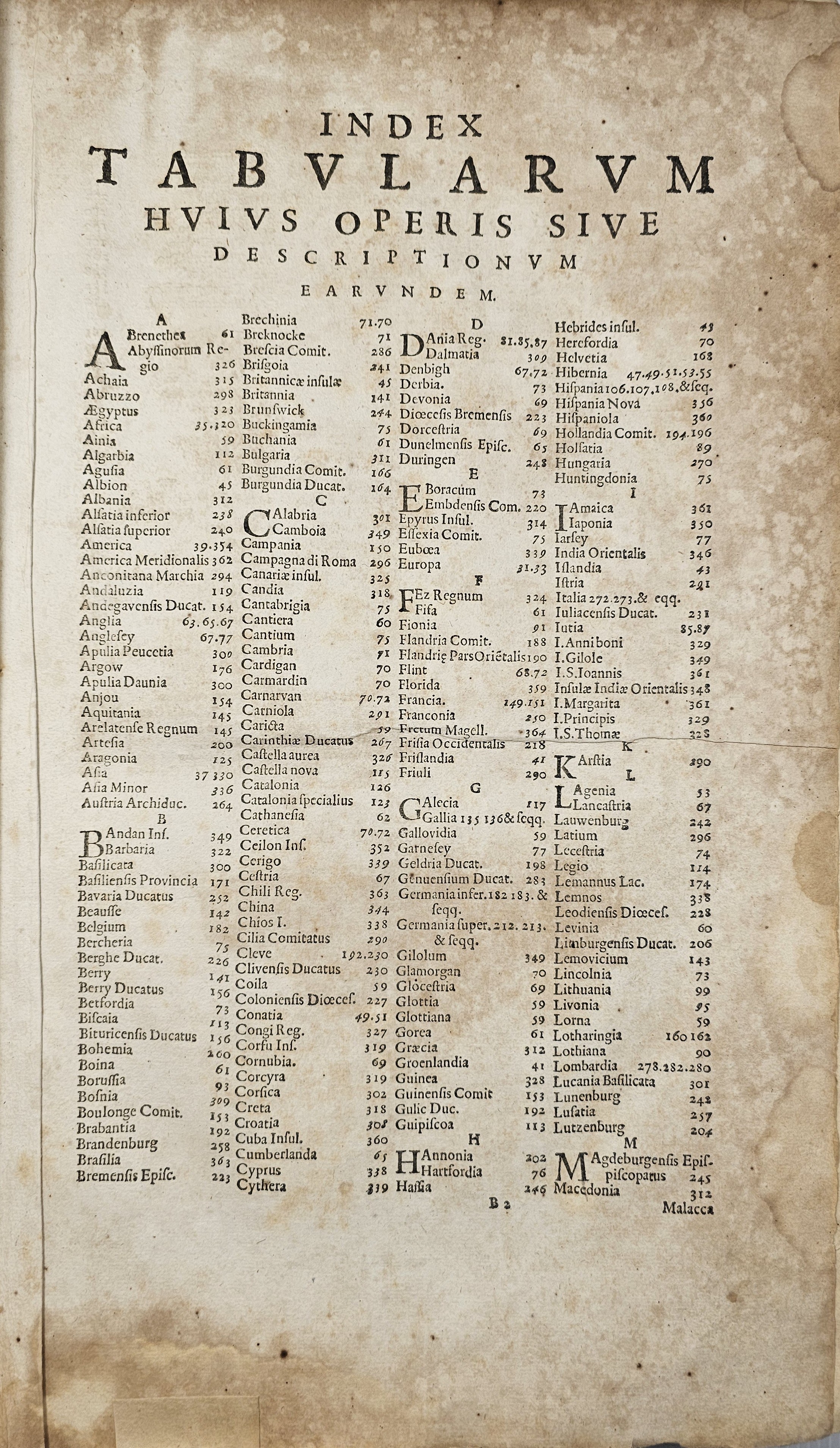 Amsterodami 1607 Exusum in aedibus Iudoci Hondij. Editio Secunda qua et ampliores descriptiones et novae Tabulaae Geographicae accesserunt. Część 1-2 [z 3-4] w 1 wol. Folio: 48 cm, karta tytuł., s. [6], 2 k: portret Mercatora i Hondiusa. Błędy w paginacji. s. [10], s. 177 (w tym 65 map: miedzioryty kolorowane), s. [12]: Indeks. Oprawa renesansowa, radełkowa, pergaminowa: grzbiet sześciopolowy, zwięzy wypukłe, w 1 polu odręczna tytulatura; na licu i tyle opr. książęcy superexlibris Victris Patientia Duris. Anno 1599. Oprawa i mapy w stanie dobrym. Ładny, kompletny egzemplarz. Holenderskie, drugie wydanie. Rzadko spotykane na rynku antykwarycznym.