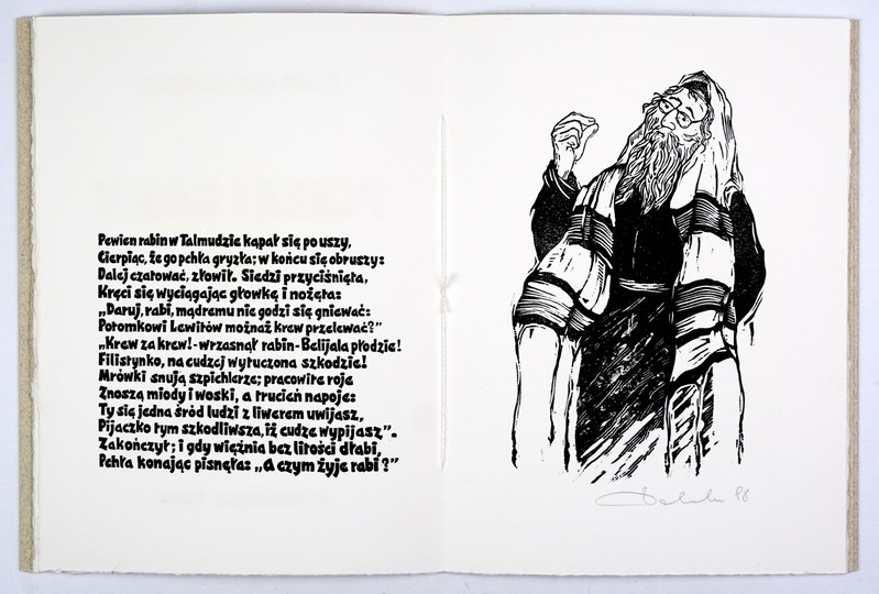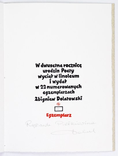 Stan bardzo dobry. "W dwusetną rocznicę urodzin Poety wyciął w linoleum i wydał w 22 numerowanych egzemplarzach Zbigniew Dolatowski". Ten egzemplarz numer 12 przypisany odręcznie przez wydawcę Ryszardowi Pietkiewiczowi. Druk bibliofilski z oryg. całostronicową grafiką Z. Dolatowskiego (1927-2001) - artysty samouka, tworzącego grafiki (głównie linoryty i drzeworyty) od lat 50. XX w., bibliofila, cenionego twórcy ekslibrisów.