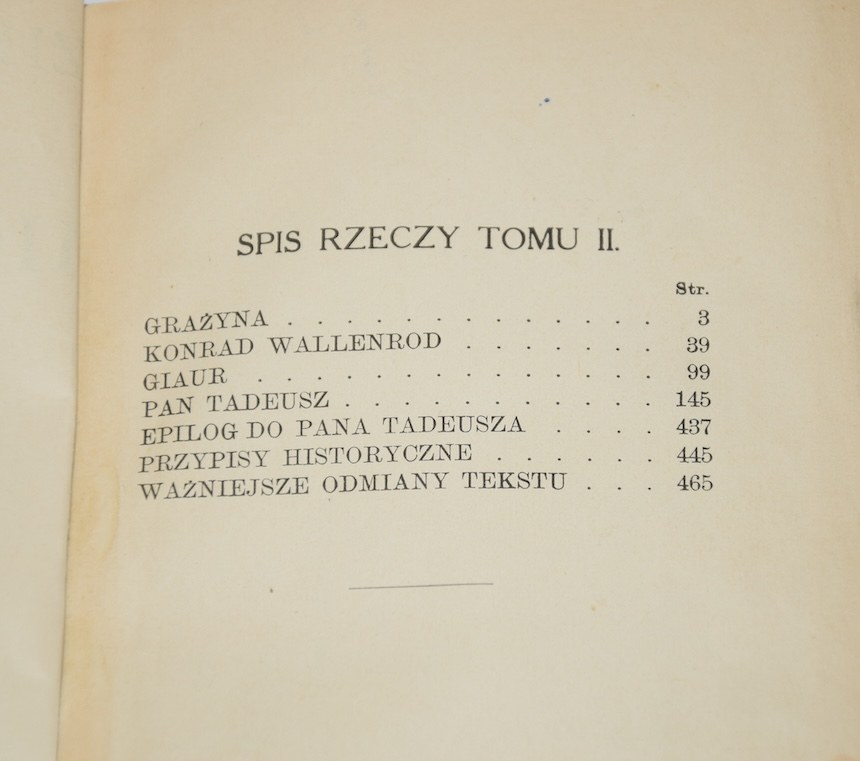 Zawiera: Grażyna; Konrad Wallenrod; Giaur; Pan Tadeusz; Epilog do Pana Tadeusza; Przypisy historyczne; Ważniejsze odmiany tekstu.