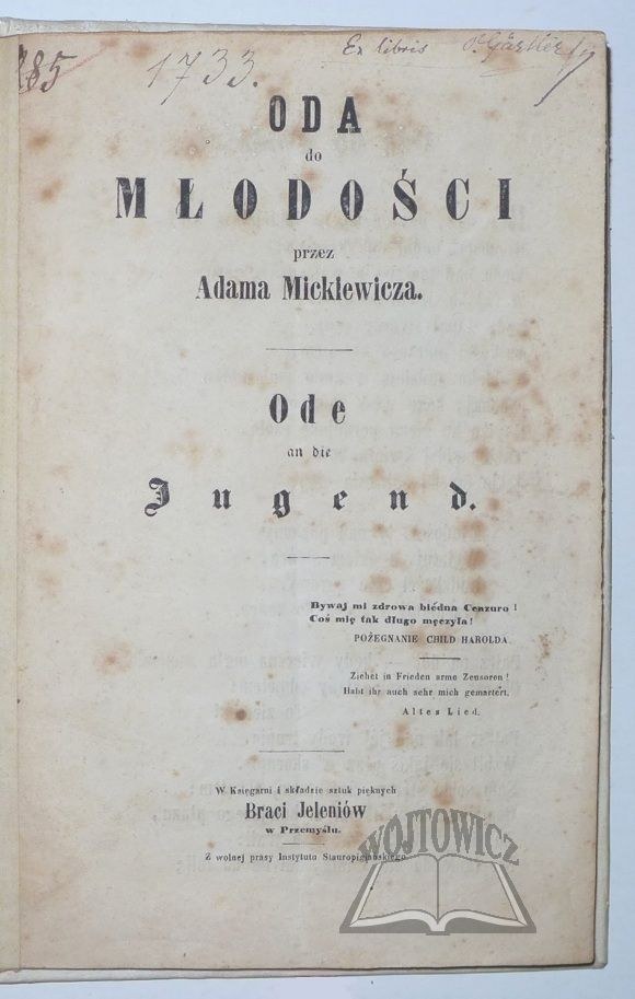 Oda do młodości. Ode an die Jugend. (Lwów 1848). W Księgarni i składzie sztuk pięknych Braci Jeleniów w Przemyślu. Z wolnej prasy Instytutu Stauropigiańskiego. 8, s. [8], opr. perg. wtórna, wyklejki w...