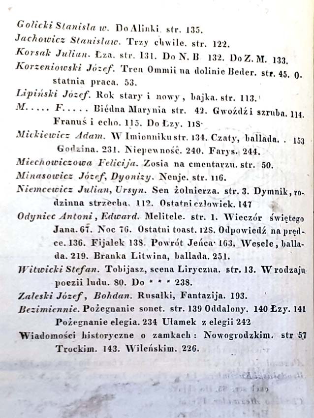 - pierwodruki wierszy Adama Mickiewicza: W imionniku S. B., Czatów i Farysa oraz przedruki jego Godziny i Niepewności.