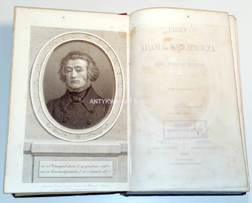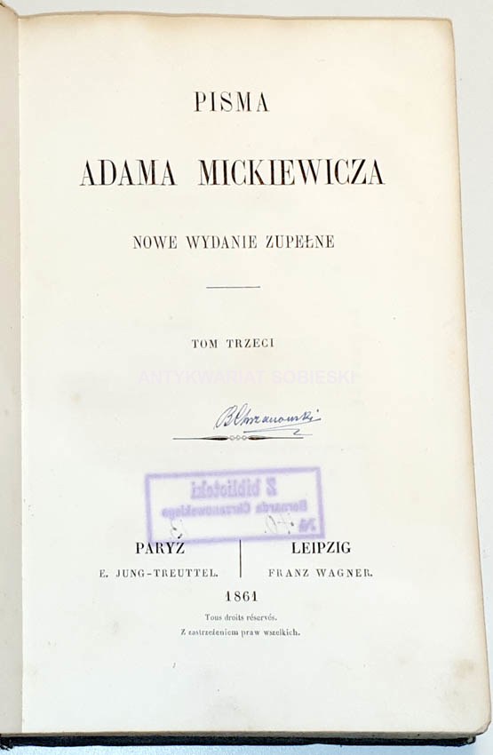 T. I Paryż, E. Jung- Treuttel/ Leipzig, Franz Wagner 1861 [z zastrzeżeniem praw wszelkich], str. V, 505, na frontispisie oddzielona od karty tyt. bibułką litografowana podobizna medalionu z wieszczem wykonana w Imp. F. Chardon ainc.; format 14x21 cm;