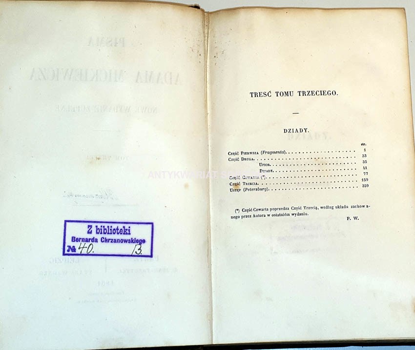 zawartość: DZIADY, część pierwsza, druga, czwarta, trzecia; Część czwarta poprzedza część trzecią , według układu zachowanego przez autora w ostatnim wydaniu.