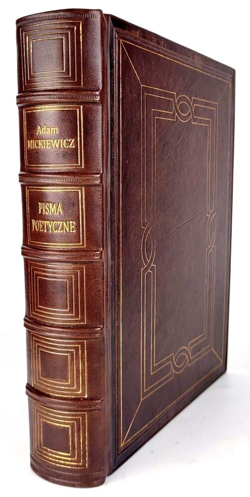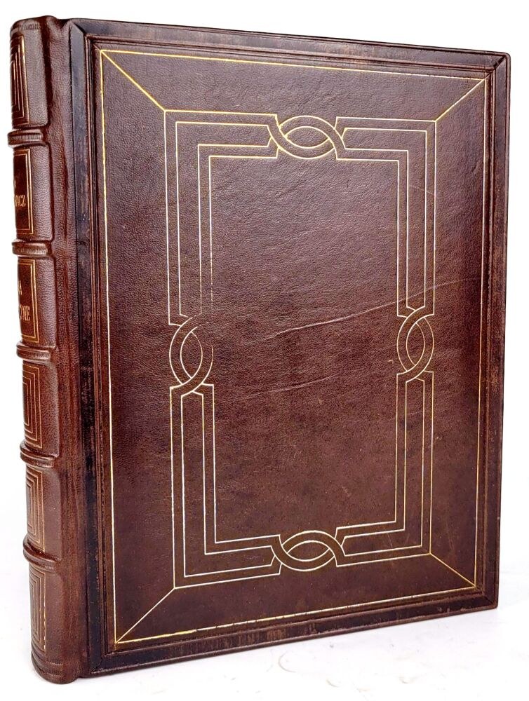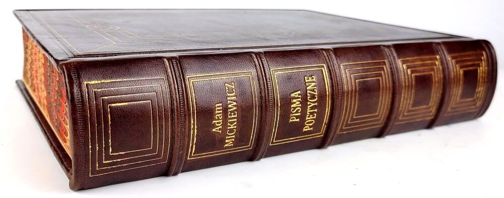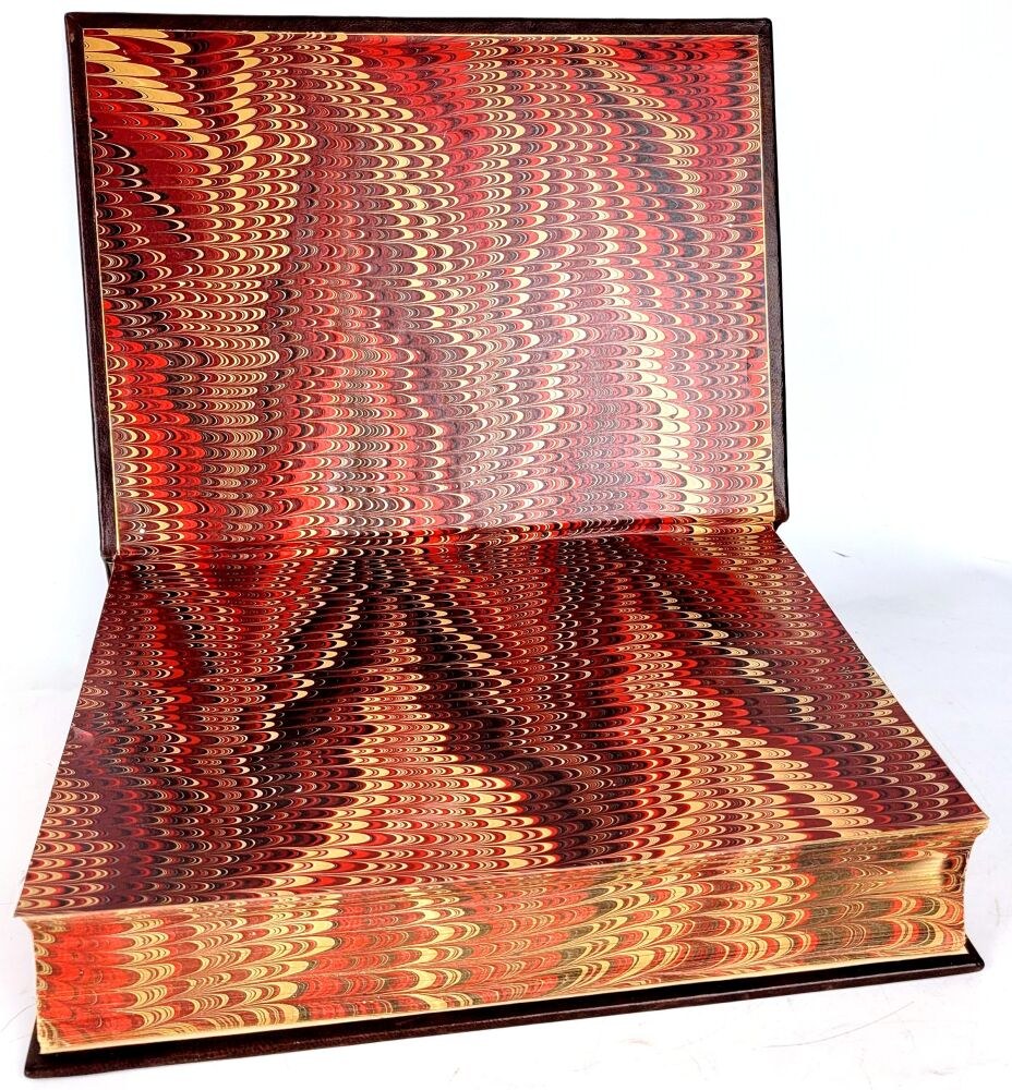 TWARDA OPRAWA PEŁNA SKÓRA WSPÓŁCZESNA Z BOGATYMI ZŁOCENIAMI NA OBU LICACH,, GRZBIET Z WYPUKŁYMI ZWIĘZAMI, TŁOCZENIAMI I ZŁOCENIAMI. WYKLEJKI Z RĘCZNIE BARWIONEGO W MASIE PAPIERU MARMORYZOWANEGO, OBCIĘCIA KART ZDOBIIONE TYM SAMYM WZOREM.