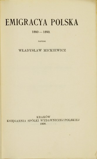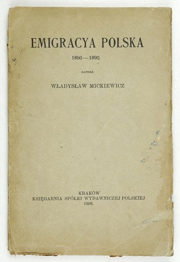 MICKIEWICZ Władysław - Emigracya polska 1860-1890. Kraków 1908. Księg. Spółki Wydawniczej Pol. 8, s. [6], 172. brosz.