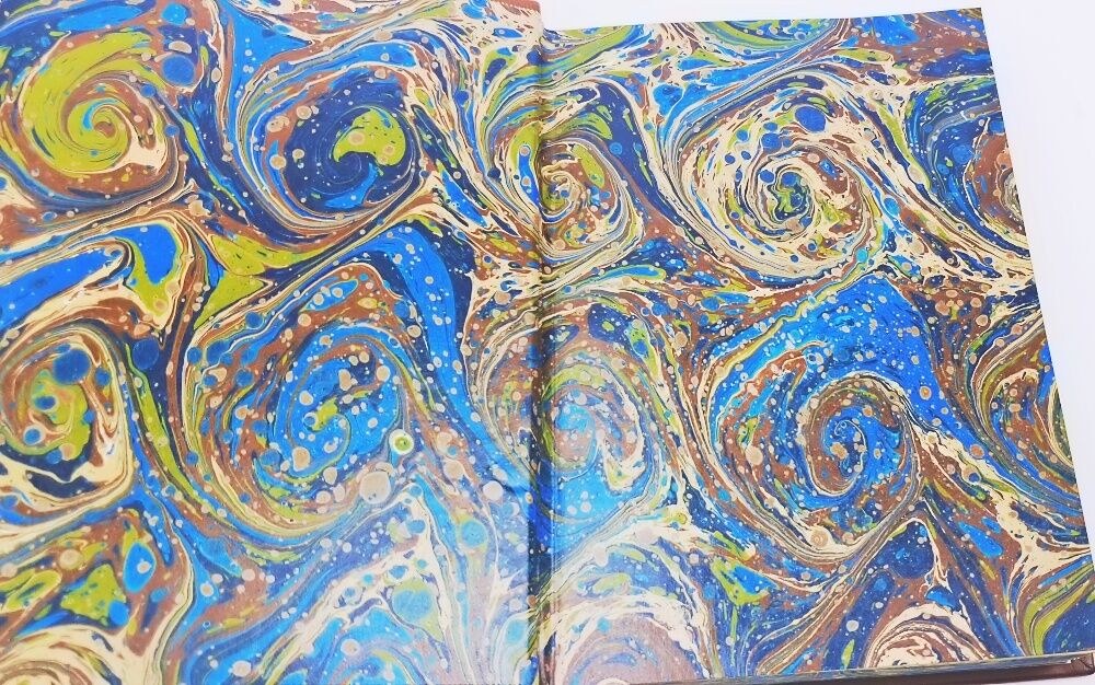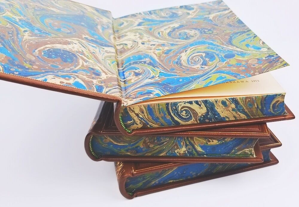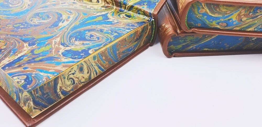 TWARDA OPRAWA PEŁNA SKÓRA WSPÓŁCZESNA, GRZBIETY PŁASKIE Z OZDOBNYMI ZŁOCENIAMI, OKŁADKI OKOLONE TŁOCZONĄ NA ZŁOTO I ŚLEPO RAMKĄ, WYKLEJKI MARMORYZOWANE, OBCIĘCIA KART MARMORYZOWANE.