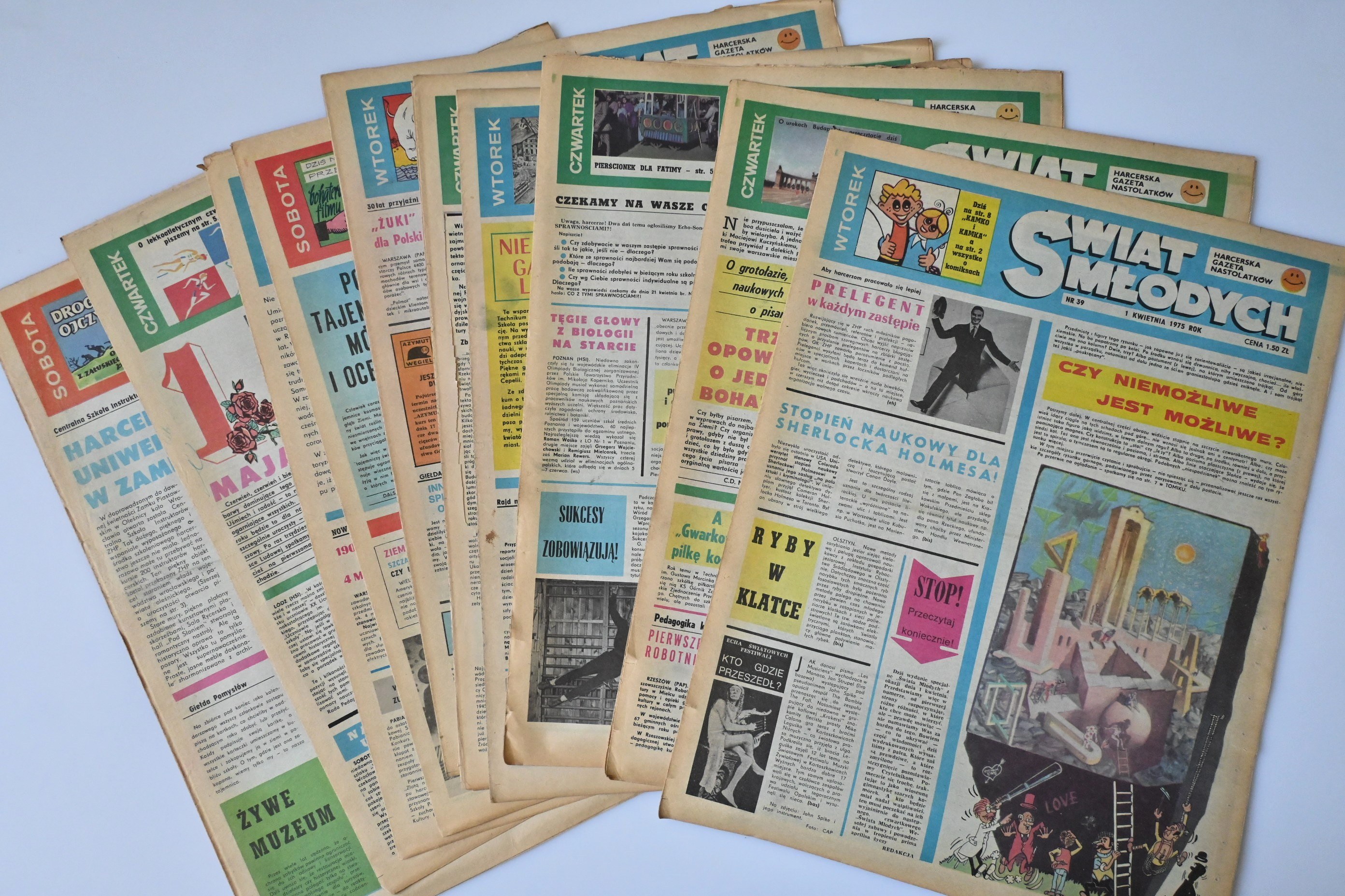 15 numerów Świata Młodych z kompletnym komiksem, gazety bez zagięcia, komiks czysty, strony poszarzałe. Wewnątrz numerów gazety wycinki (cyklu Gwiazdozbiór, Świat samochodów, Świat muzyki, inne); zdarzają się wycinki z przedniej okładki. Egzemplarze nieznacznie zakurzone na krawędziach.