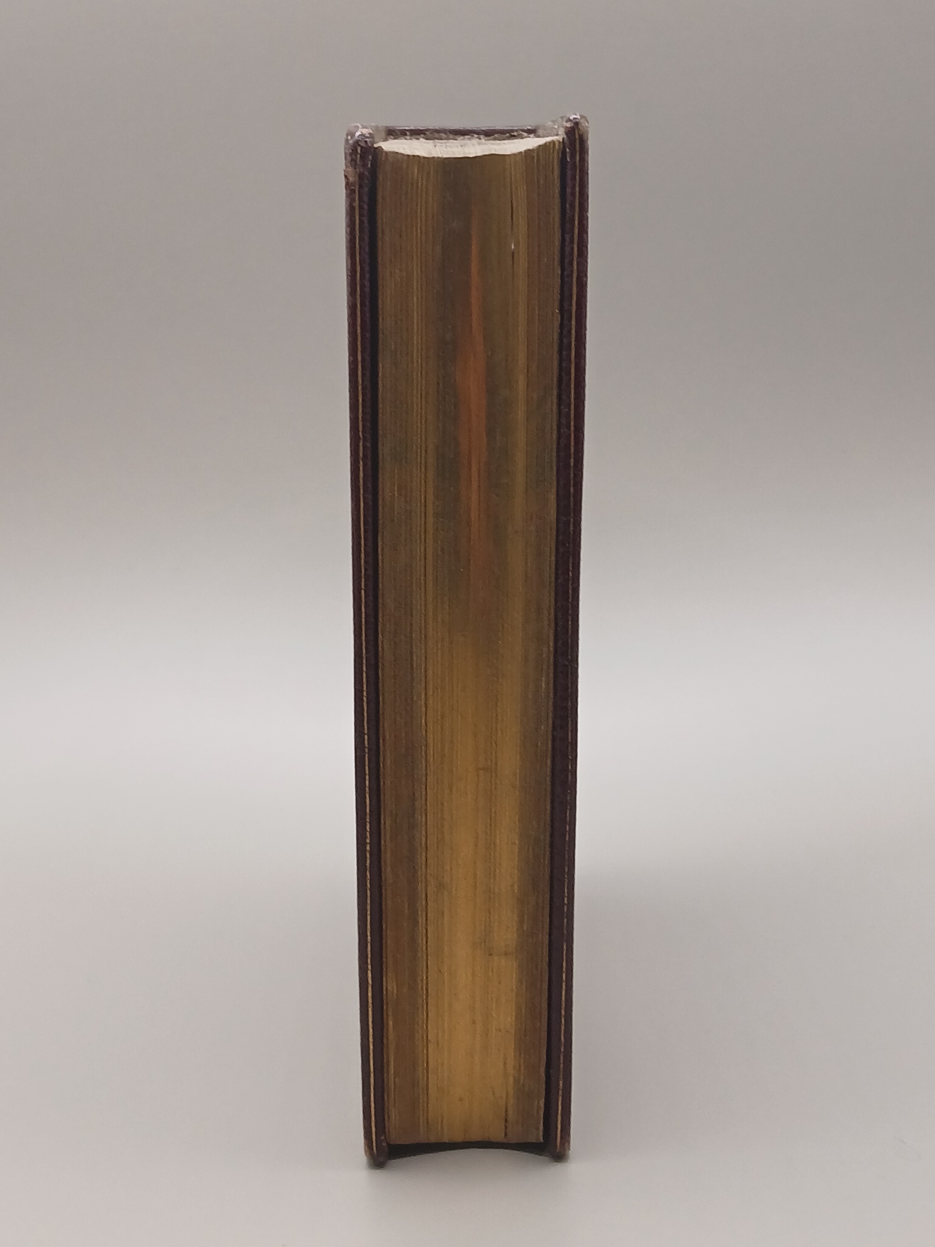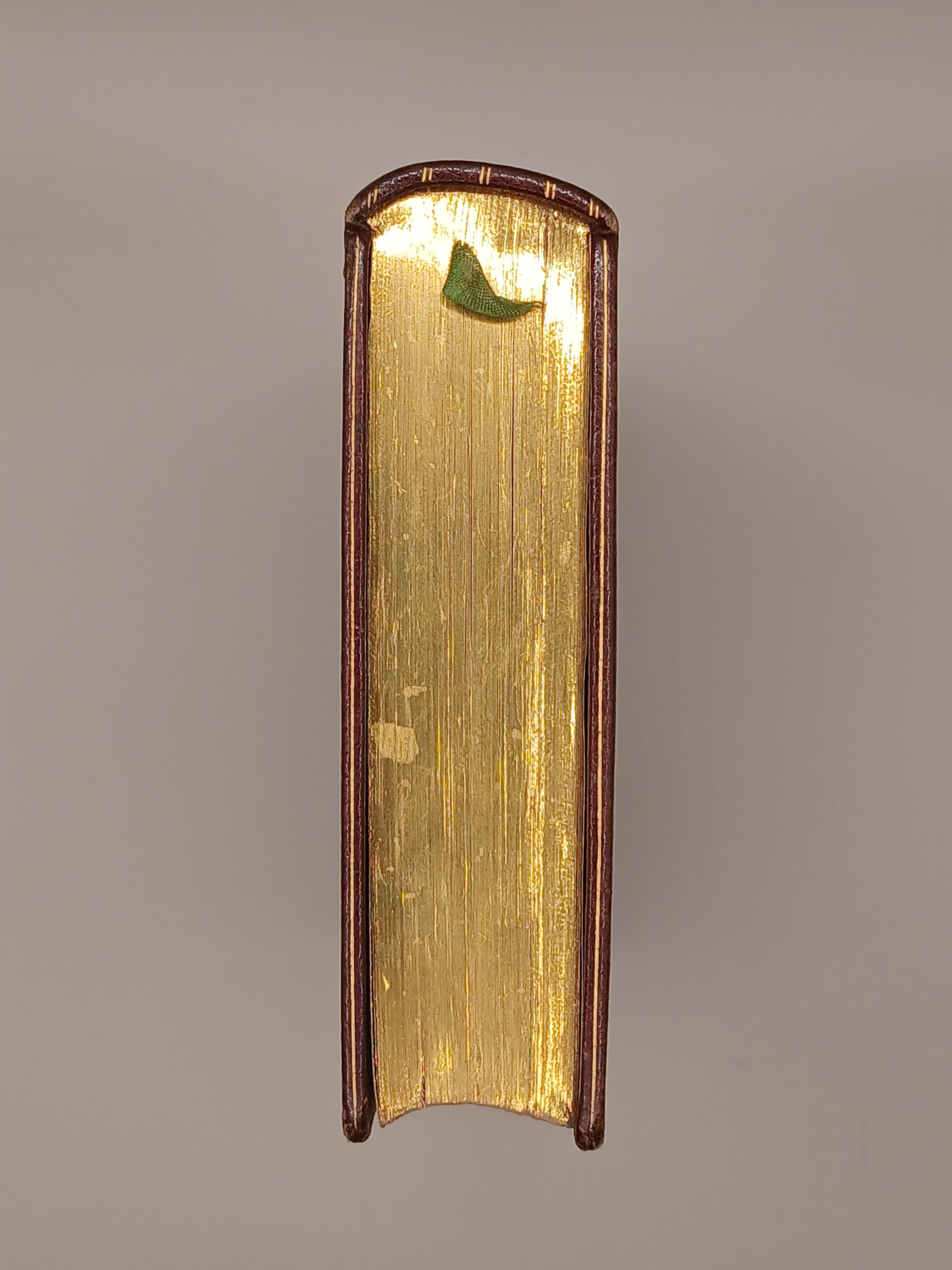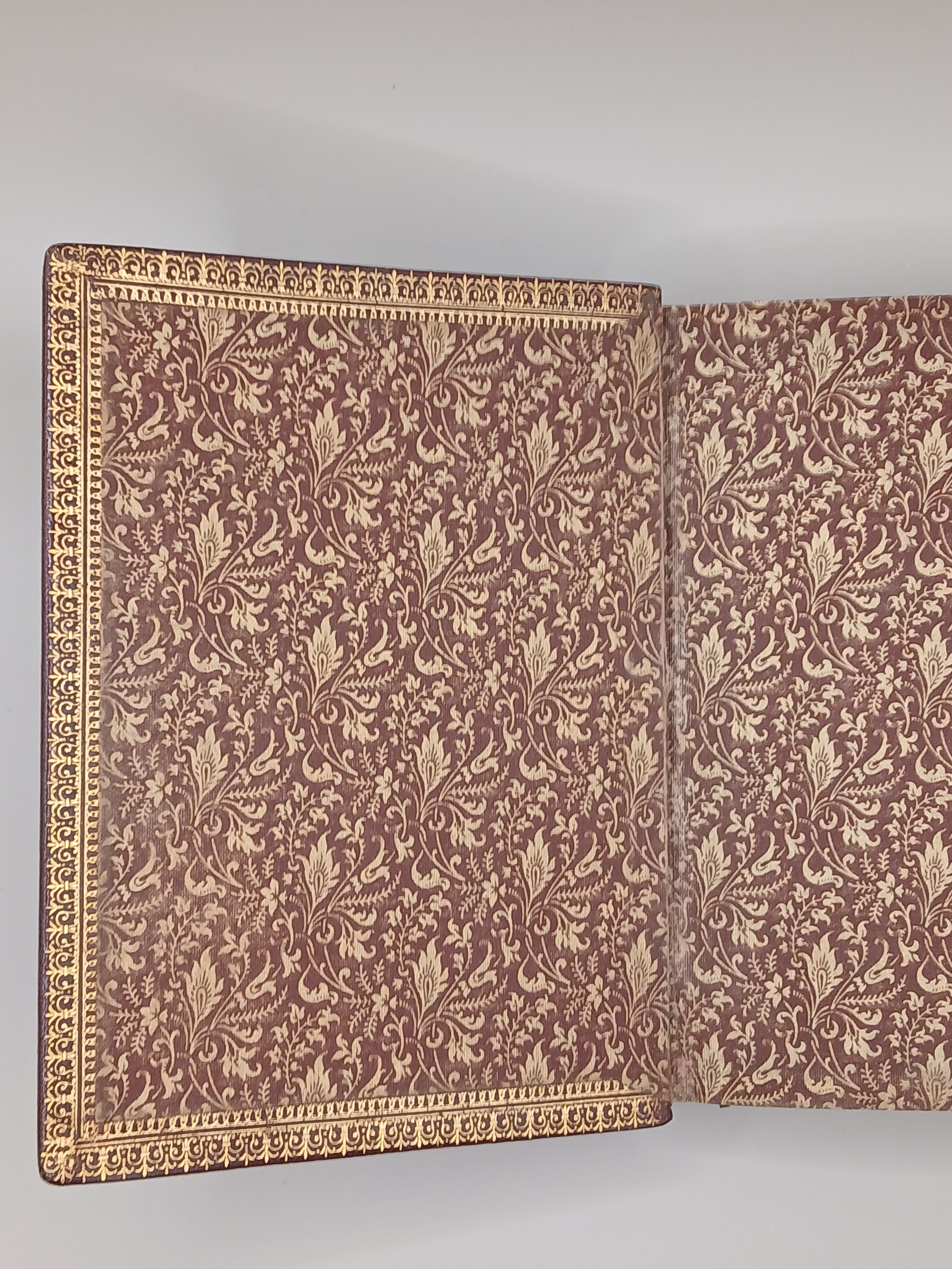 oprawa pełna skóra z tłoczeniami i złoceniami, superekslibris w postaci metalowego (srebrnego?) monogramy, wyklejki materiałowe, wewnętrzne strony okładek również z tłoczeniami i złoceniami.