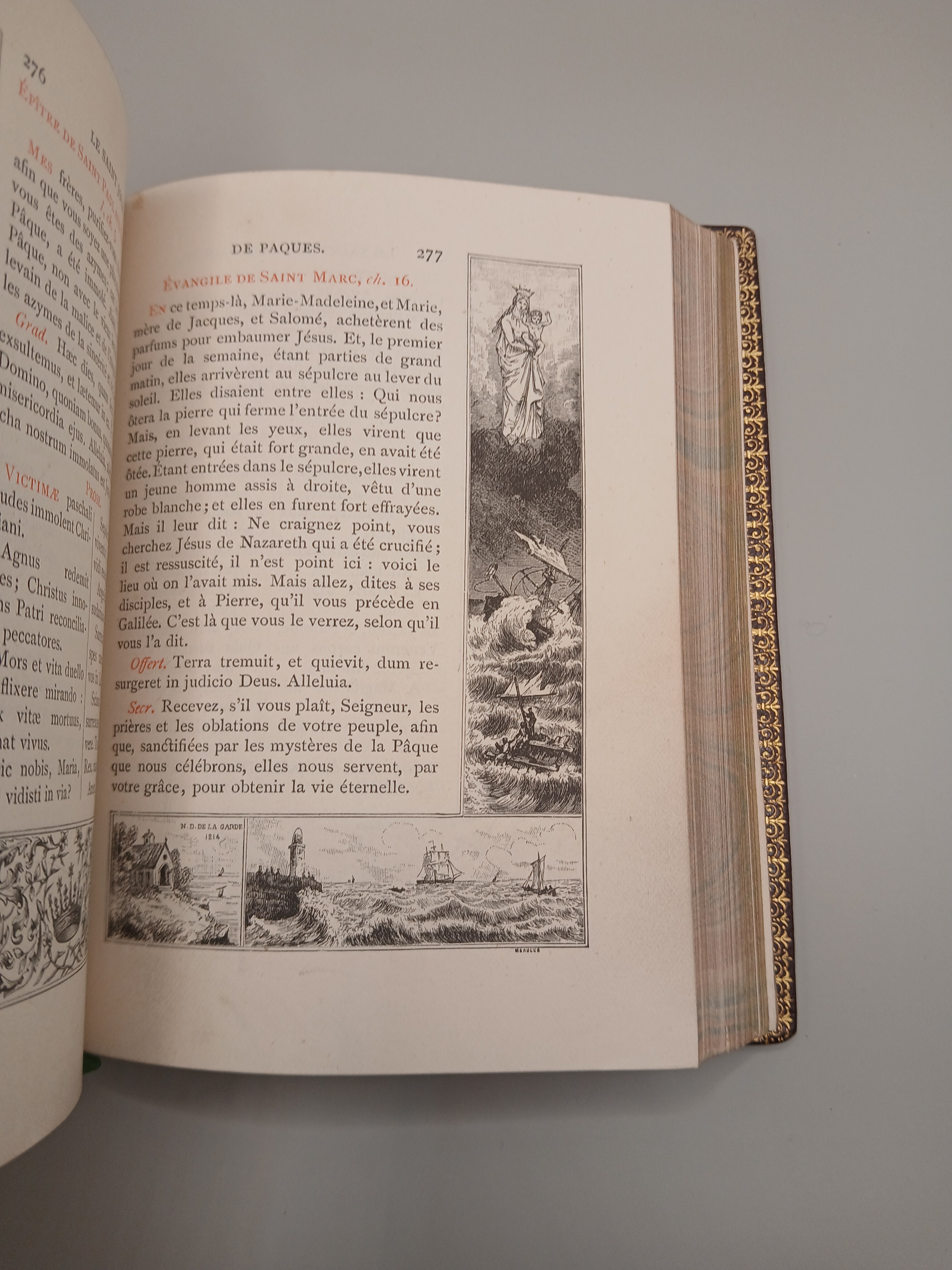 Liczne ilustracje w tekście, tekst w bogatych bordiurach. Brzegi kart złocone.