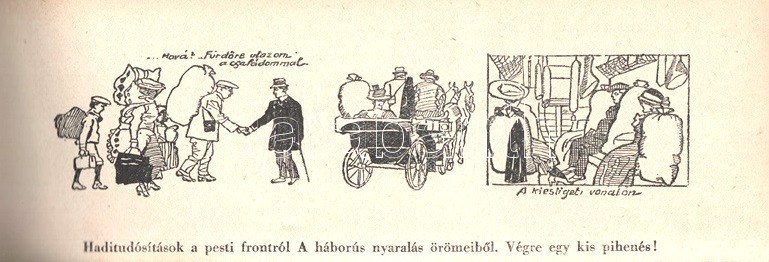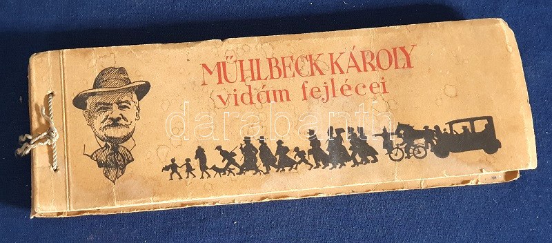 Mühlbeck Károly: Mühlbeck Károly vidám fejlécei. [Budapest], (1935). Uj Idők Szerkesztősége [4] p. + 78 t. (kétoldalas). Haránt alakú album. Mühlbeck Károly (1869-1943) grafikusművész, karikaturista a századforduló és a századforduló utáni évek meghatározó grafikusművésze. Ifjúsági könyvek illusztrációi mellett hetilapoknak is készített szatirikus rajzokat. Az Uj Idők képes családi folyóirat az 1910-es évektől közölt a lap felső ötödében vidám karikatúrákat, mely a kor visszásságait, társadalmi jelenségeit örökítette meg. Karikatúra-albumunkhoz Herczeg Ferenc főszerkesztő írt előszót. Néhány oldalon apró foltosság. Zsinórral fűzött, színes, illusztrált, enyhén foltos kiadói borítóban. Jó példány.