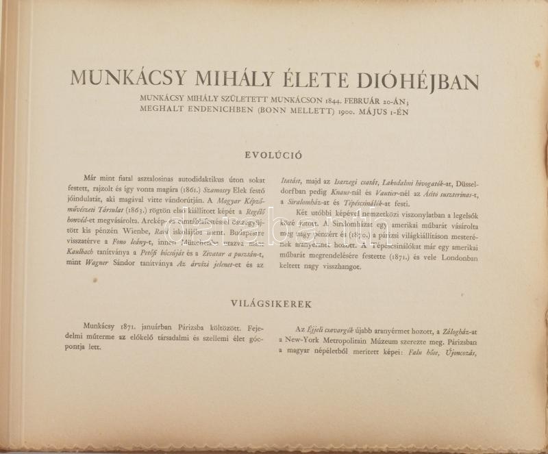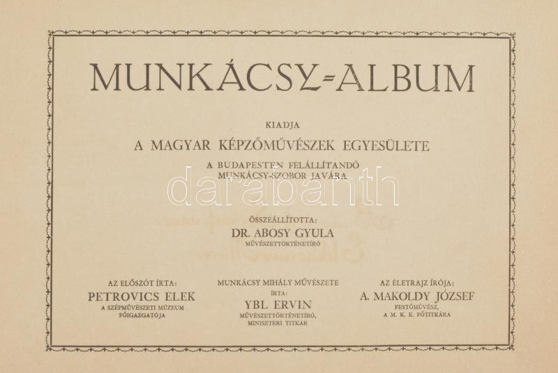 Munkácsy-album. Kiadja a Magyar Képzőművészek Egyesülete a Budapesten felállítandó Munkácsy szobor javára. Előszó: Petrovics Elek. Életrajz: Á. Makoldy József. Összeáll. Abosy Gyula. : (Bp., 1927, Hornyánszky.) 4 lev., 11 t., 11 lev. Kiadói, zsinórfűzésű, vászon borítású, haránt alakú, albumban. Budapest Főváros Elektromos Művei részére névre szóló,96. sz. sorszámozott példány. Kopott borítóval