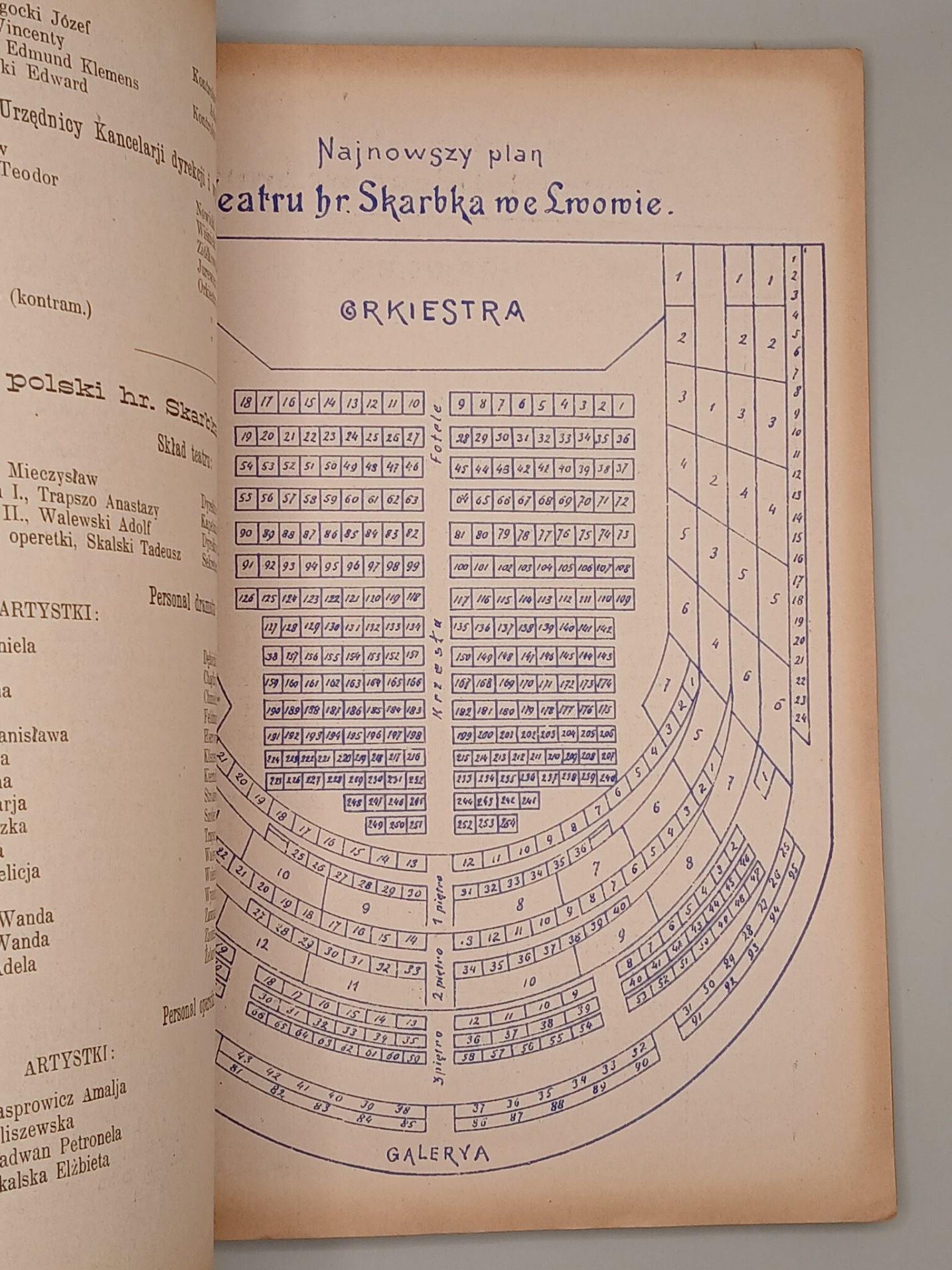 Ilustrowany Kalendarz Teatralny Muza na rok 1893, nakładem "Towarzystwa wzajemnej pomocy artystów teatru hr. Skarbka". 25,5 x 19 cm; około 140 nienumerowanych stron.