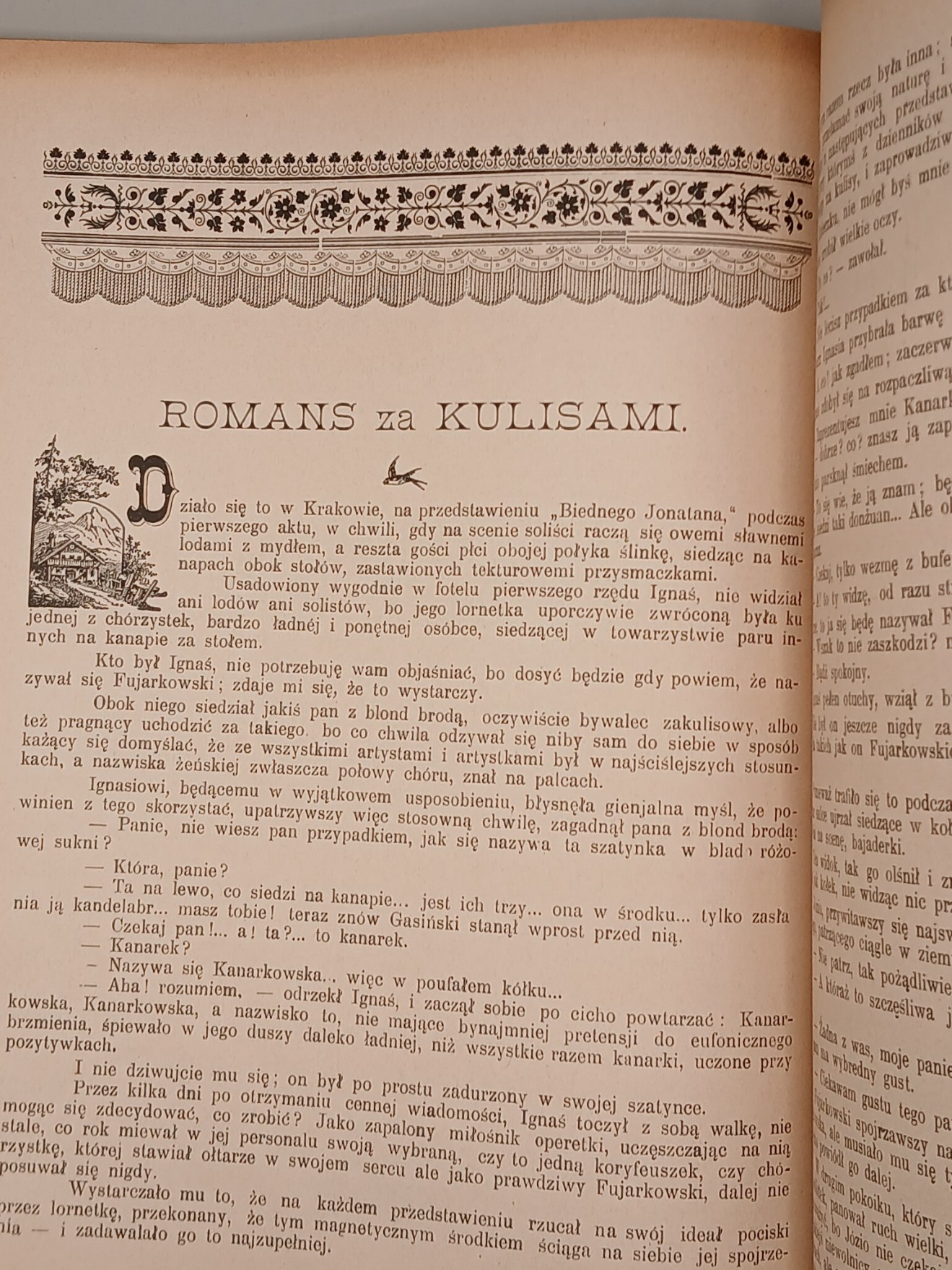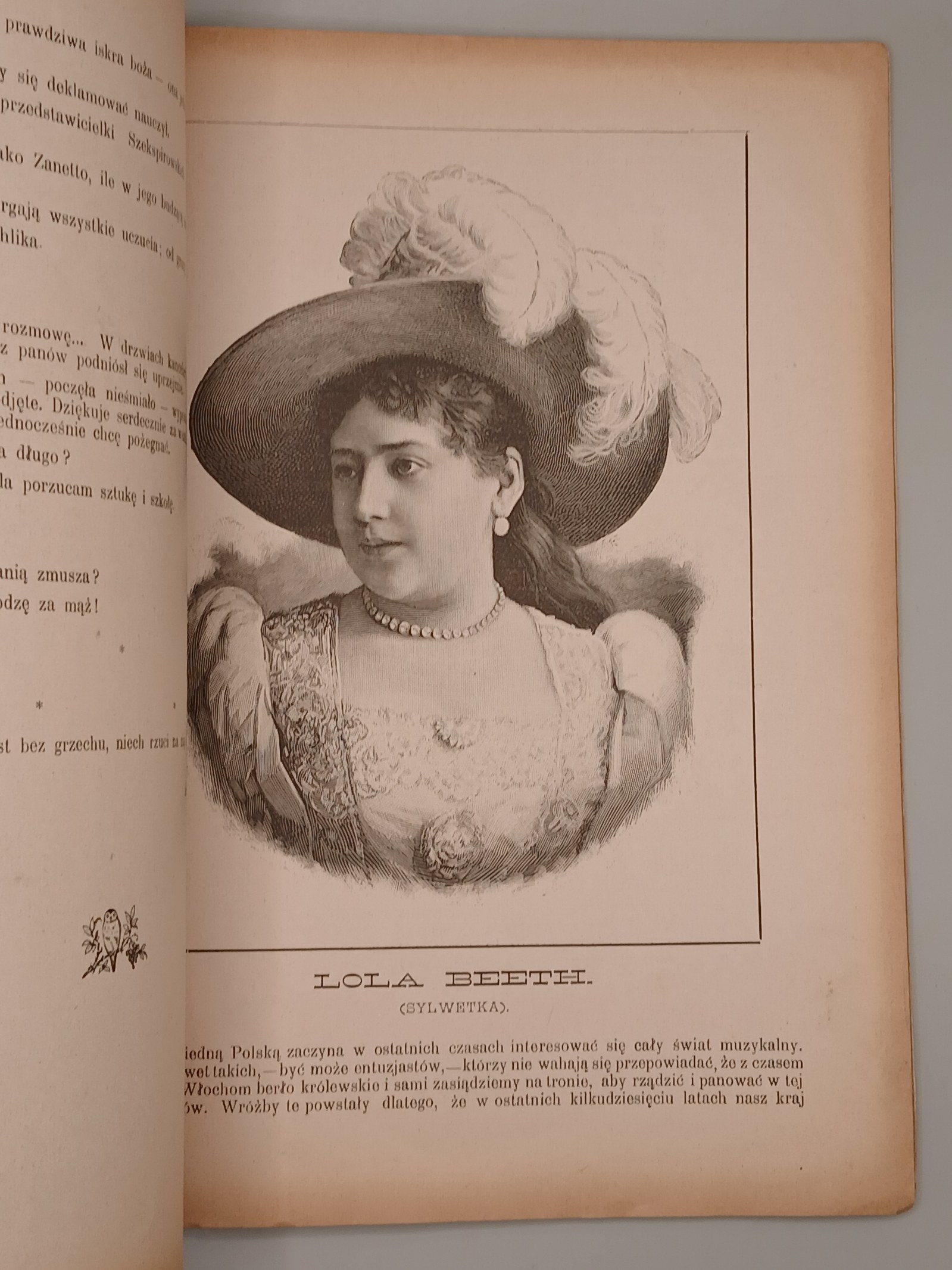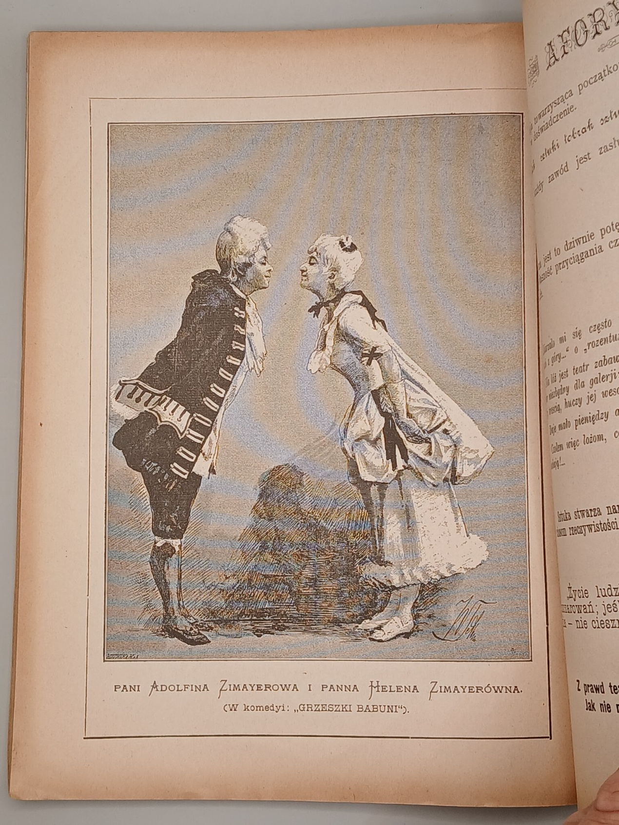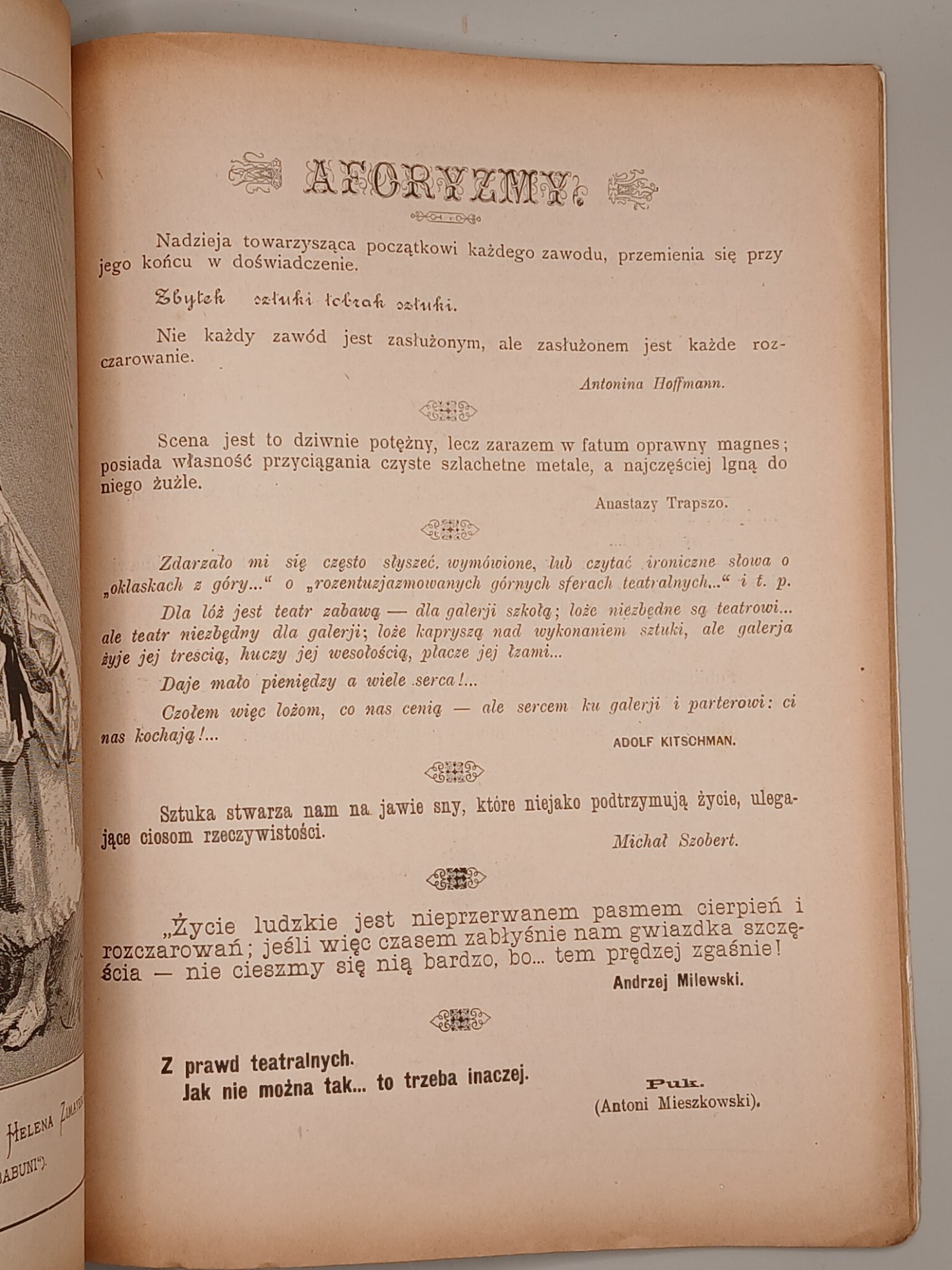 - część literacką, tu np.: biogramy artystów teatralnych, Z przeszłości Wysokiego Zamku (dr. A.C.), Dolcio, obrazek z życia warszawskiego ( Zygmunta Sarneckiego), Od artystów Kazimierza Tetmajera ale i Z teki kobieciarza (anonimowe).