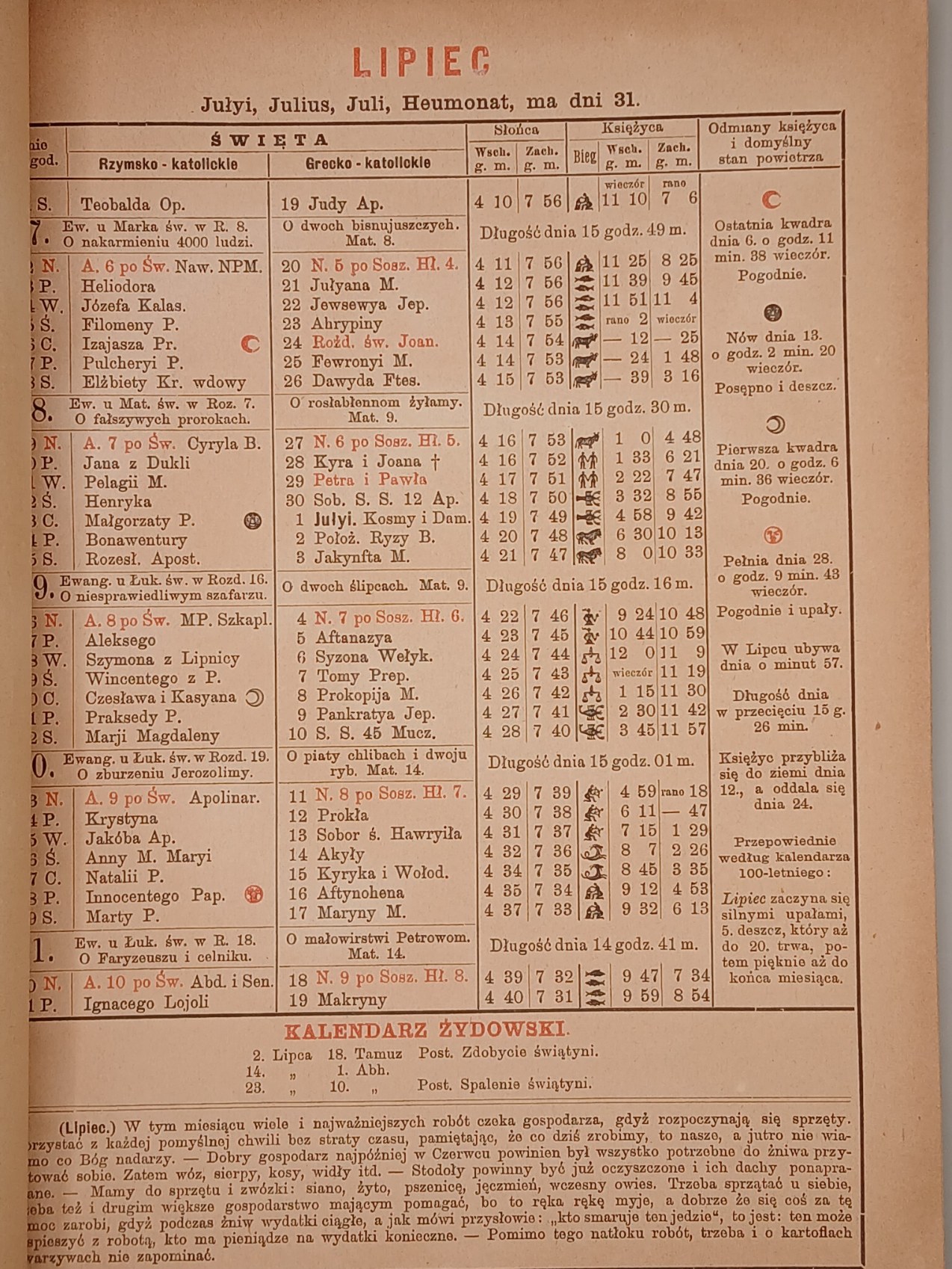 Oprócz kalendarza astronomicznego i kalendarza żydowskiego ( z świętami żydowskimi) wydawnictwo zawiera m.in. :