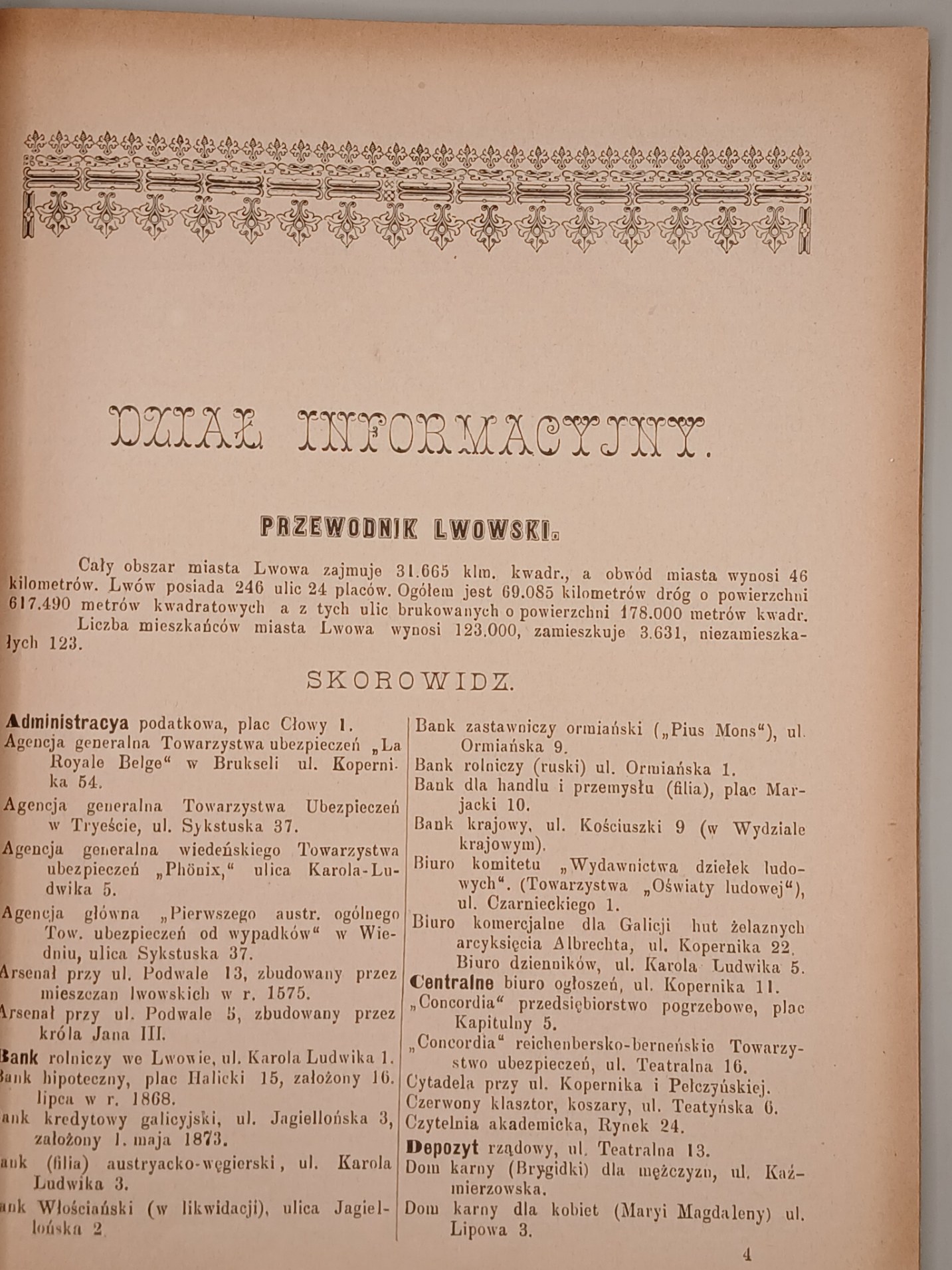 - przewodnik lwowski ( właściwie szerzej, galicyjski) który dostarcza danych o urzędach, instytucjach różnego typu (szkołach, teatrach), sporządzony w porządku alfabetycznym, z podaniem dokładnego adresu. Również adresy hoteli: pierwszo-, drugo-, trzeciorzędnych i spis władz miasta: cesarsko-królewskiego wyższego sądu krajowego we Lwowie i Krakowie, cesarsko-królewskiej Krajowej Rady Szkolnej. Następnie znajdziemy wykaz starostw w Galicji z nazwiskami starostów, a później „doktorowie medycyny we Lwowie, chirurgowie, weterynarze”, zamieszczono również spis aptek we Lwowie, wykaz adwokatów lwowskich i na prowincji, spis notariuszy w Galicjii na Bukowinie (Lwów, Kraków, Przemyśl, Tarnów, Czerniowce).