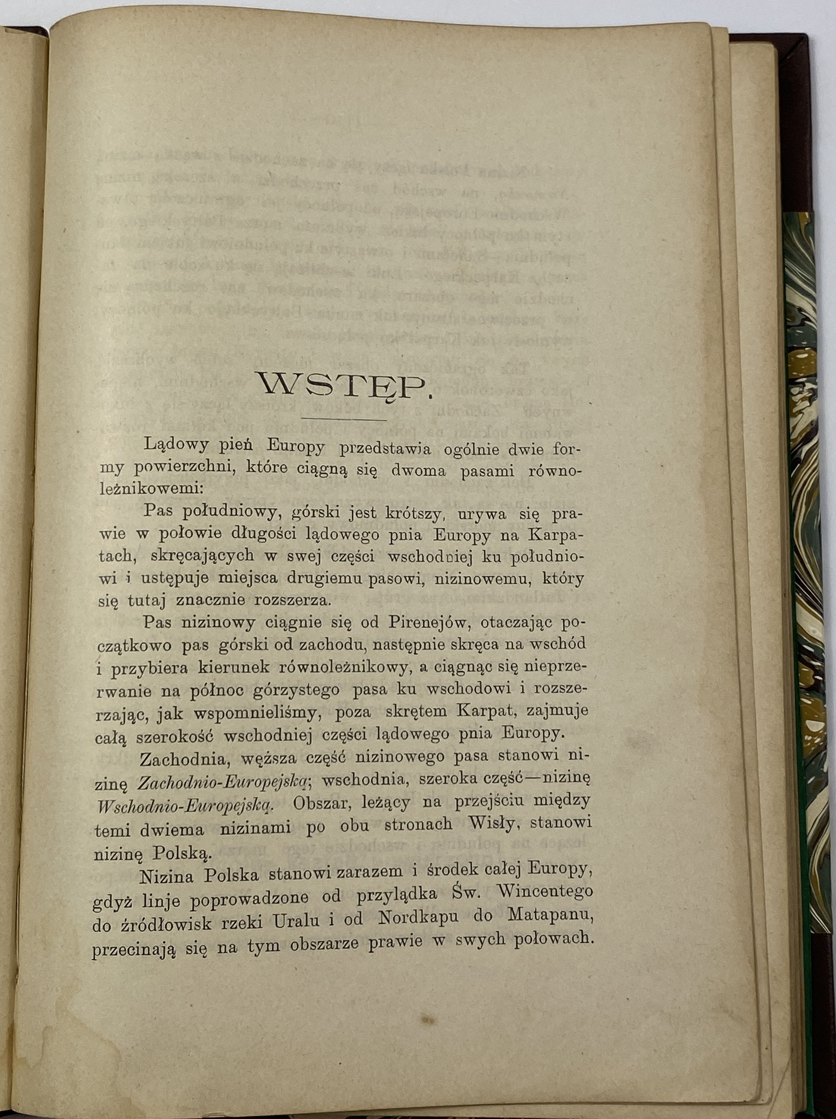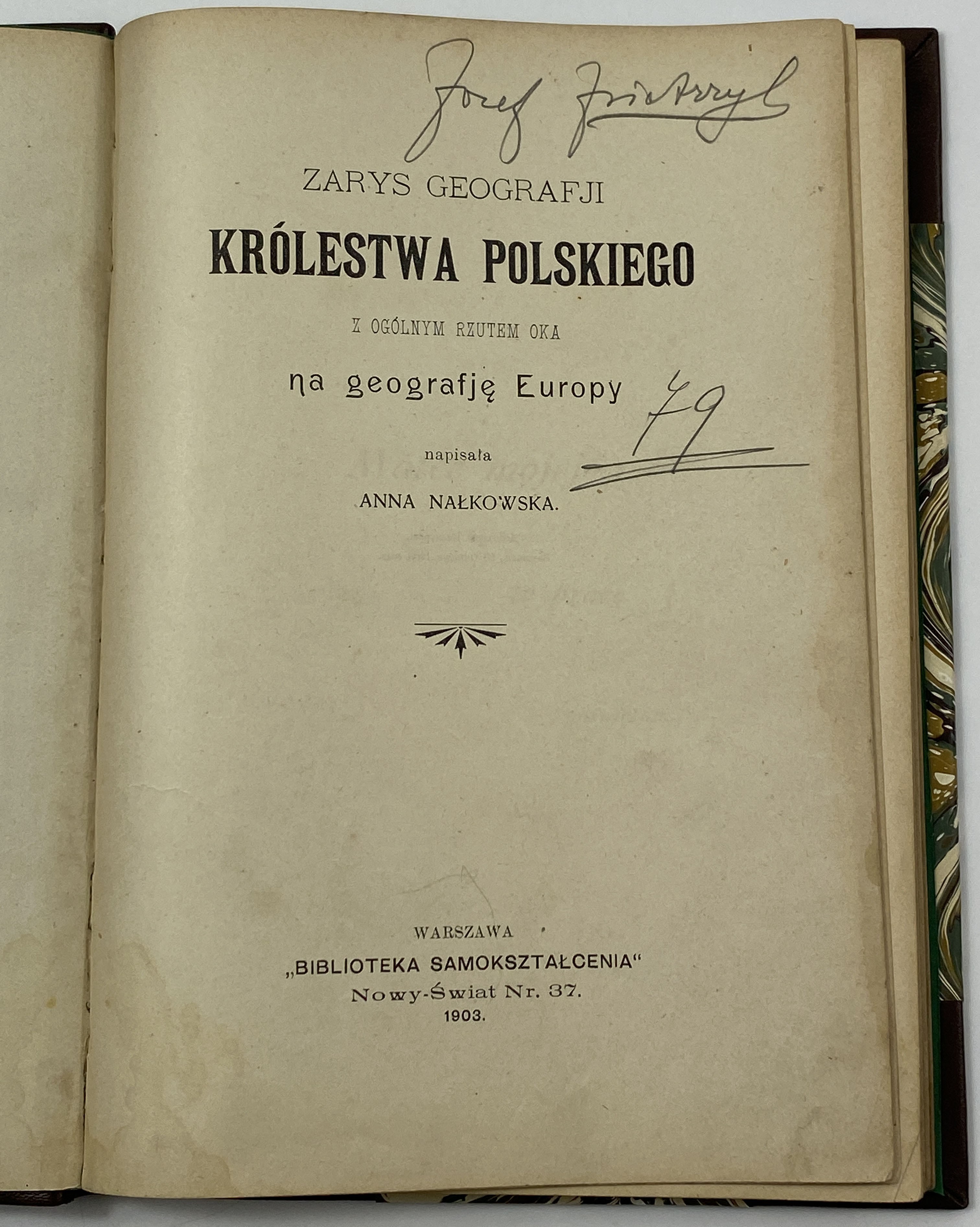 Nałkowska Anna [matka Zofii Nałkowskiej], Zarys geografji Królestwa Polskiego z ogólnym rzutem oka na geografję Europy, wydawnictwo "Biblioteka Samokształcenia", Warszawa 1903, s. 174, wymiary 22,5 x 16 cm. Podpis własnościowy. Zawiera wpisy, podkreślenia, rysunki ołówkiem, przybrudzenia w środku. Półskórek wykonany w pracowni Suszek Books.