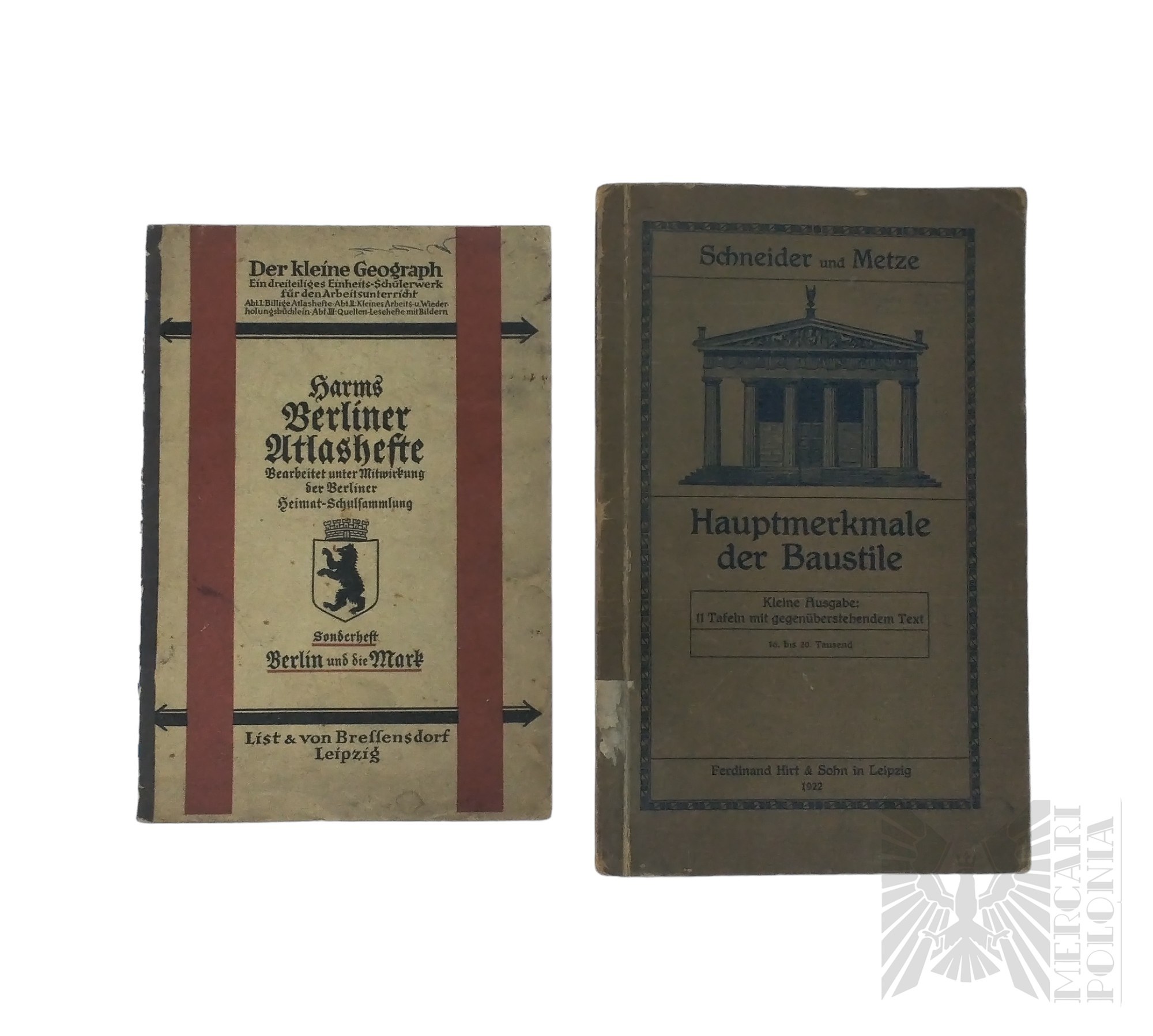 Niemcy, Lipsk (Lepizig) - Mały Geograf: Broszury Atlasu Berlina Harma (Der Kleine Geograph : Harms Berliner Atlashefte) ; Schneider und Metze - Główne Cechy Stylów Architektonicznych (Haupterkmale der Baustile), Ferdinand Hirt & Sohn