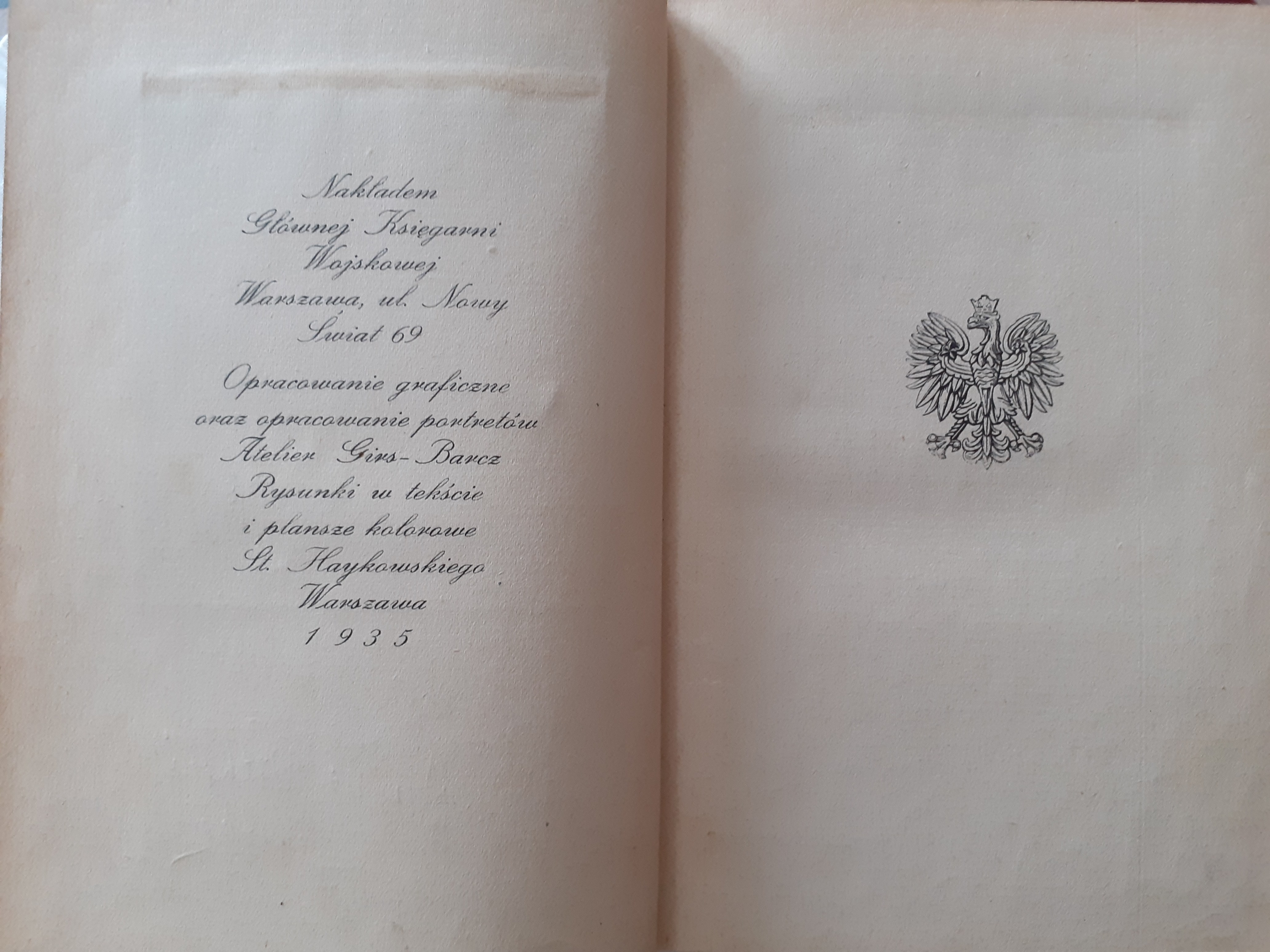 Księgarnia Główna Wojskowa, Warszawa 1935.Czarno-białe ilustracje w tekście oraz czarno-białe i kolorowe na oddzielnych kartach. Opracowanie graficzne oraz opracowanie portretów: Atelier Girs-Barcz. Rysunki w tekście i plansze kolorowe Stanisława Haykowskiego.Wym.20x14,5cm; stron 450.Oprawa twarda(zabrudzenia); przybrudzenia w środku, odręczna dedykacja długopisem.