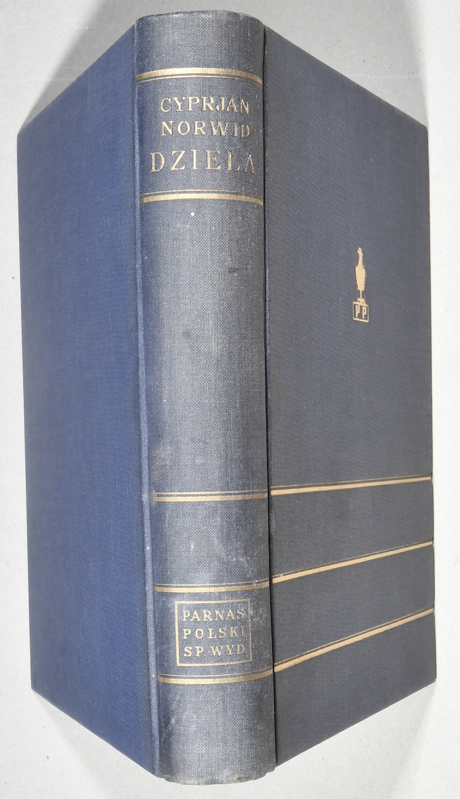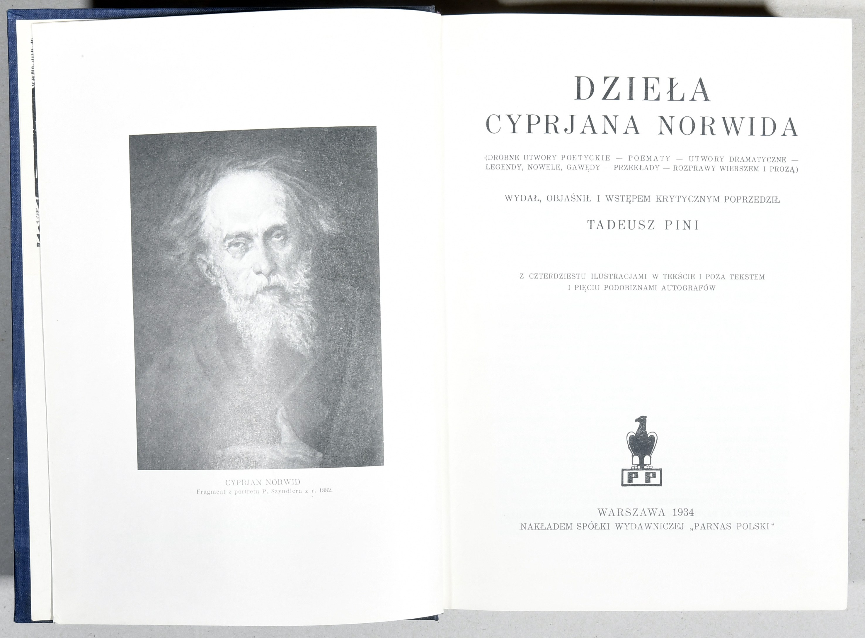 Dzieła Cyprjana Norwida. (Drobne utwory poetyckie - Poematy - Utwory dramatyczne - Legendy, nowele, gawędy - Przekłady - Rozprawy wierszem i prozą). Wydał, objaśnił i wstępem krytycznym poprzedził Tadeusz Pini. Z czterdziestu ilustracjami w tekście i poza tekstem i pięciu podobiznami autografów. Warszawa 1934 Nakł. Sp. Wyd. "Parnas Polski". Druk W. L. Anczyca i Sp. 8, s. XLVIII, 648, ilustr. w tekście i całostronicowe, opr. pł. wyd., exlibris Władysława Siedleckiego. Poza nieznacznie wyblakłym grzbietem stan bardzo dobry. Bibljoteka Poetów Polskich pod red. T. Piniego t. V.