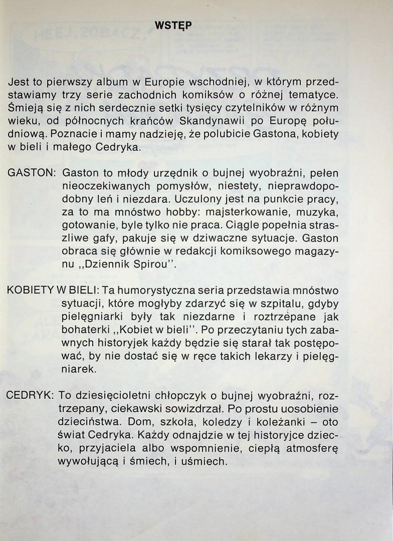 (...)Jest to pierwszy album w Europie Wschodniej, w którym przedstawiamy trzy serie zachodnich komiksów o różnej tematyce. Śmieją się z nich serdecznie setki tysięcy czytelników w różnym wieku, od północnych krańców Skandynawii po Europę południową. Poznacie i mamy nadzieję, że polubicie Gastona, kobiety w bieli i małego Cedryka.(...)