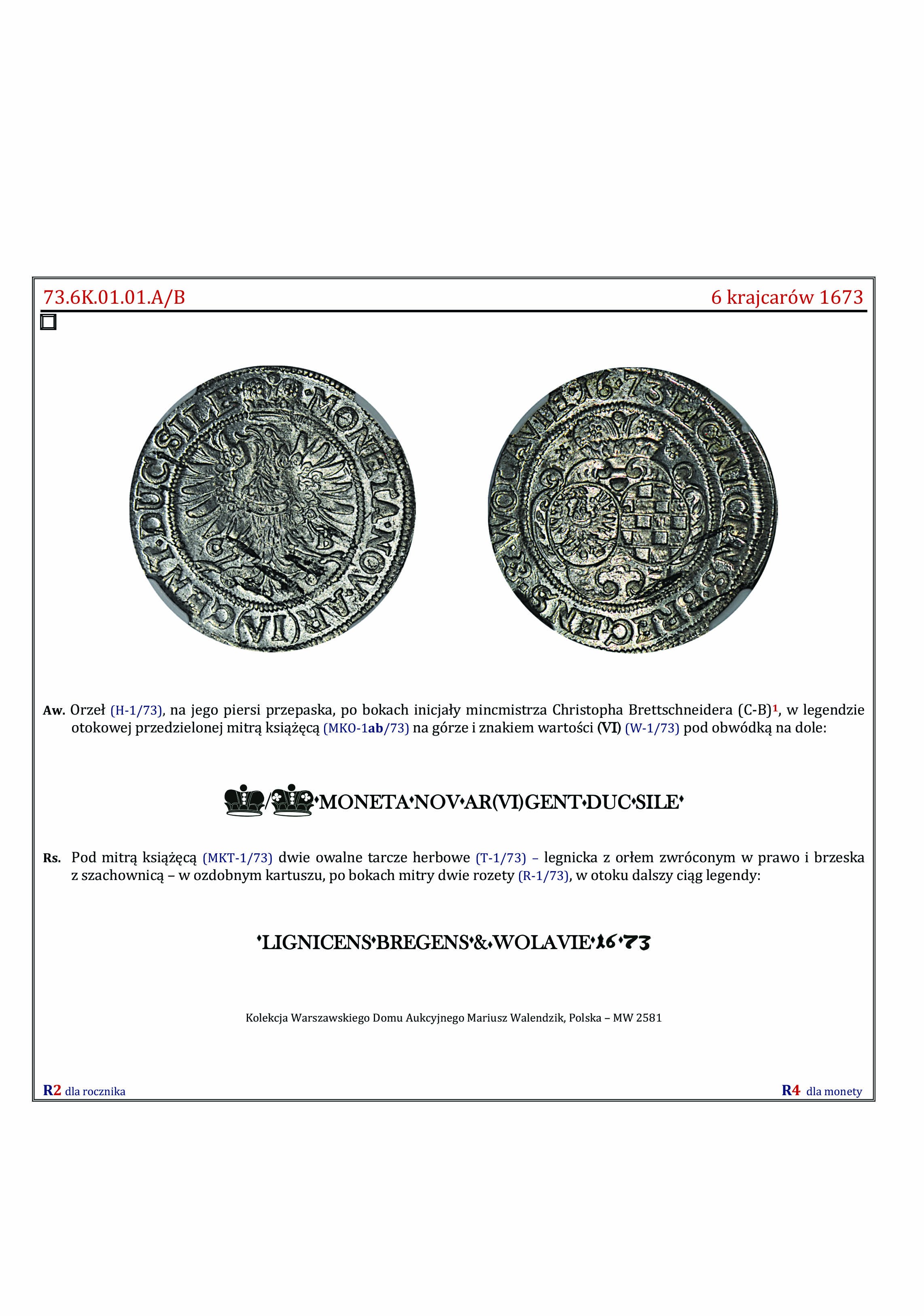 Kontynuacja serii katalogów związanych z mennicami w Brzegu i Legnicy oraz Piastami Śląskimi. Specjalizowany katalog poświęcony monetom i medalom Ludwiki Anhalckiej z lat 1673-1675. Jest to część pierwsza, w której opisano typy i odmiany monet: 3-krajcarowych, 6-krajcarowych, ćwierćdukatów oraz medale. Część druga, zawierająca typy i odmiany greszli będzie przygotowywana przez Jacka Bogulskiego, który pracuje również nad katalogami odrębnego mennictwa Jerzego III., Ludwika IV. i Chrystiana - stanowiącymi kontynuację katalogu Wspólnego Mennictwa Trzech Braci 1651-1662. Katalog Ludwiki Anhalckiej zawiera wizerunki poszczególnych monet i medali, ich proweniencję, stopnie rzadkości – zarówno dla roczników, jak też i dla poszczególnych monet według indywidualnie opracowanej skali rzadkości.