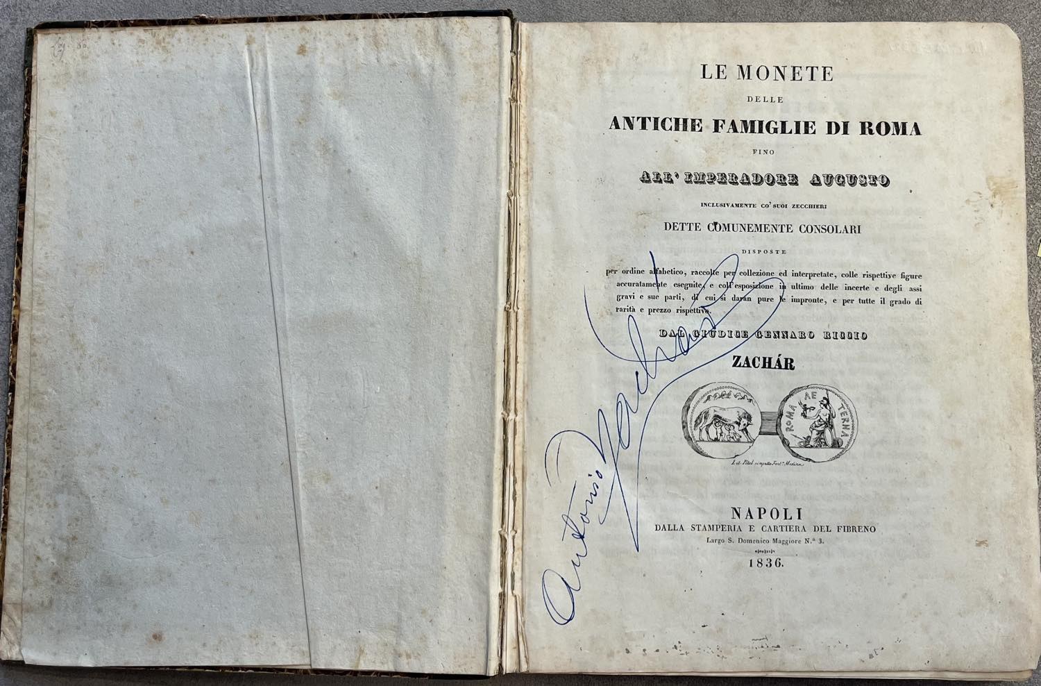 Riccio G., Le monete delle antiche famiglie di Roma fino all'imperadore Augusto inclusivamente co' suoi zecchieri dette comunemente consolari, Napoli 1836, in 8° grande, 223 pp. + 54 tavv. Rilegatura ottocentesca in mezza pelle con titoli al dorso, molto usurata ed allentata. Scritte e timbri sparsi, anche nelle tavole, discreta copia
