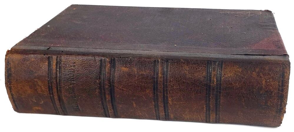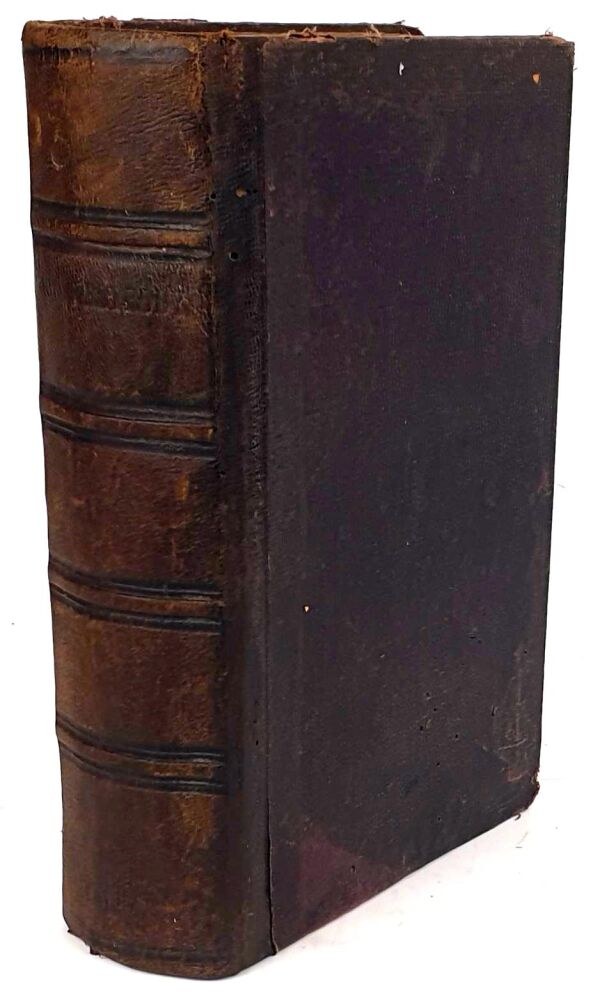 TWARDA OPRAWA PÓŁSKÓREK Z EPOKI, GRZBIET Z WYPUKŁYMI ZWIĘZAMI, TŁOCZENIAMI I ZŁOCONĄ TYTULATURĄ