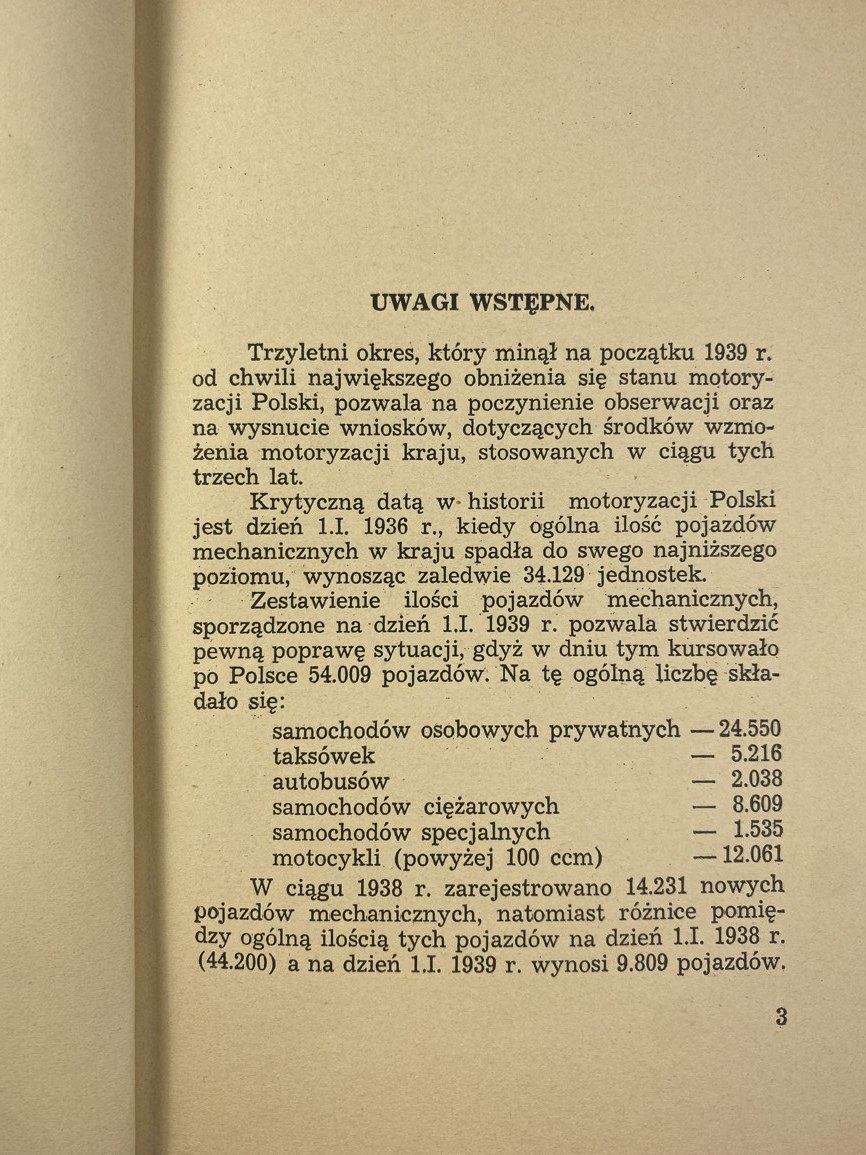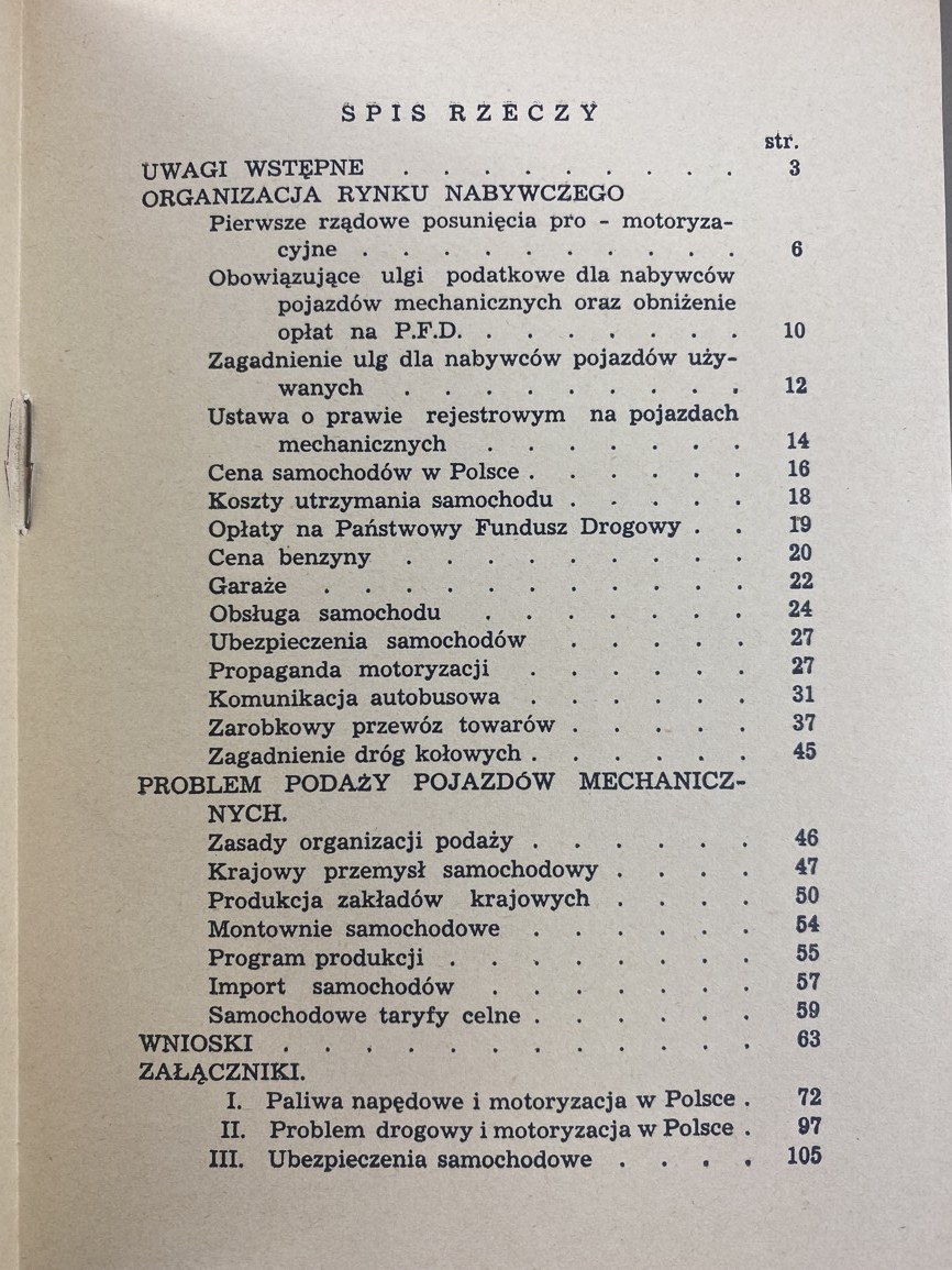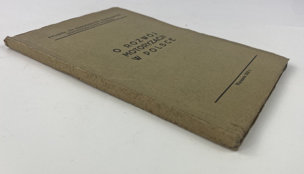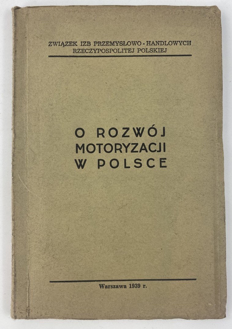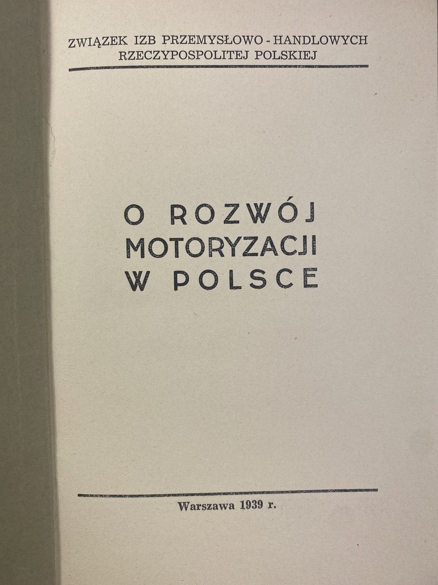 O rozwój motoryzacji w Polsce / Związek Izb Przemysłowo-Handlowych Rzeczypospolitej Polskiej; [przedm. C. Klarner], Warszawa: [s.n.], 1939, s. [2], 116, [1], wymiary 13,5 x 19,5 cm. Okładka broszurowa, wydawnicza. Niewielkie zabrudzenia, otarcia okładki.