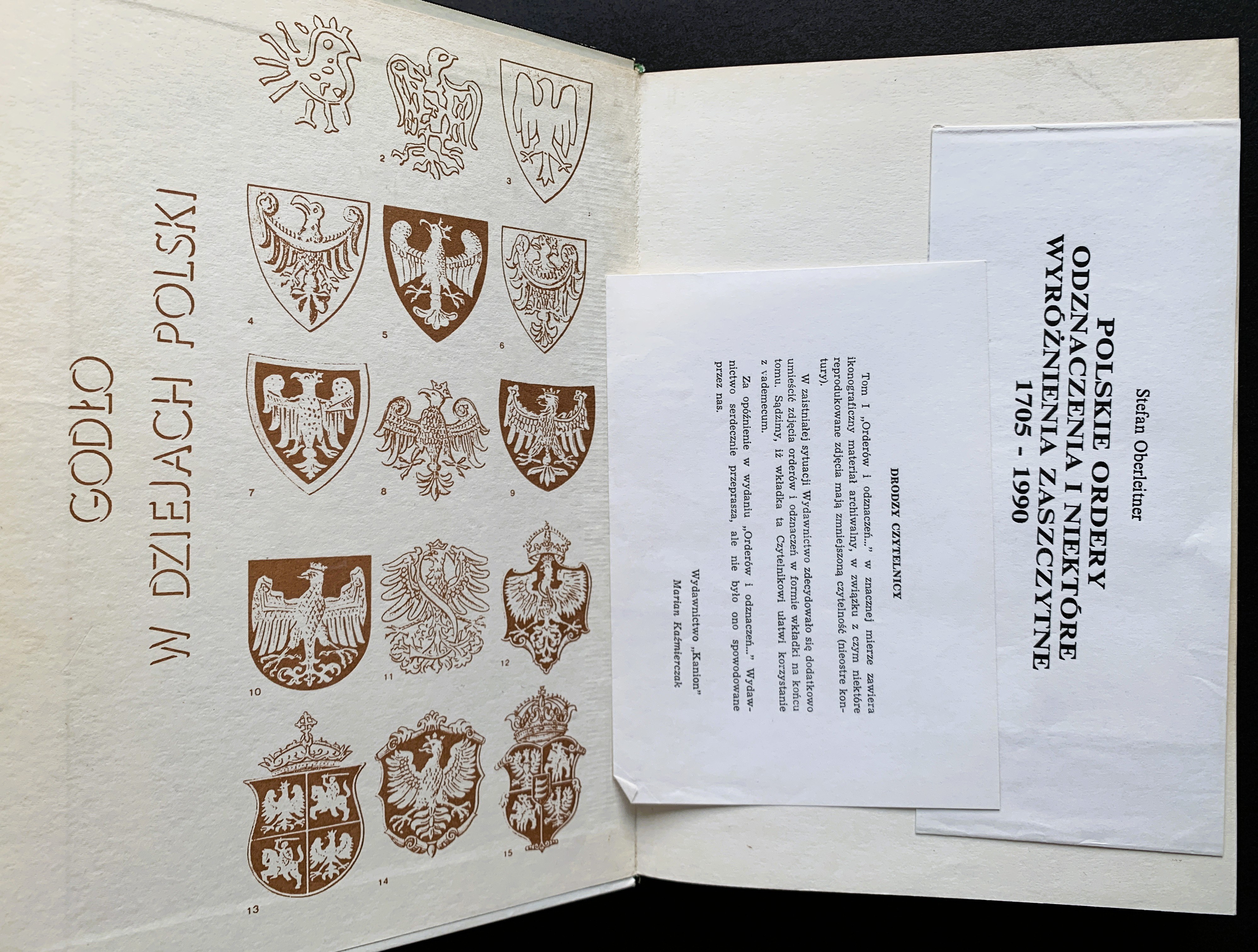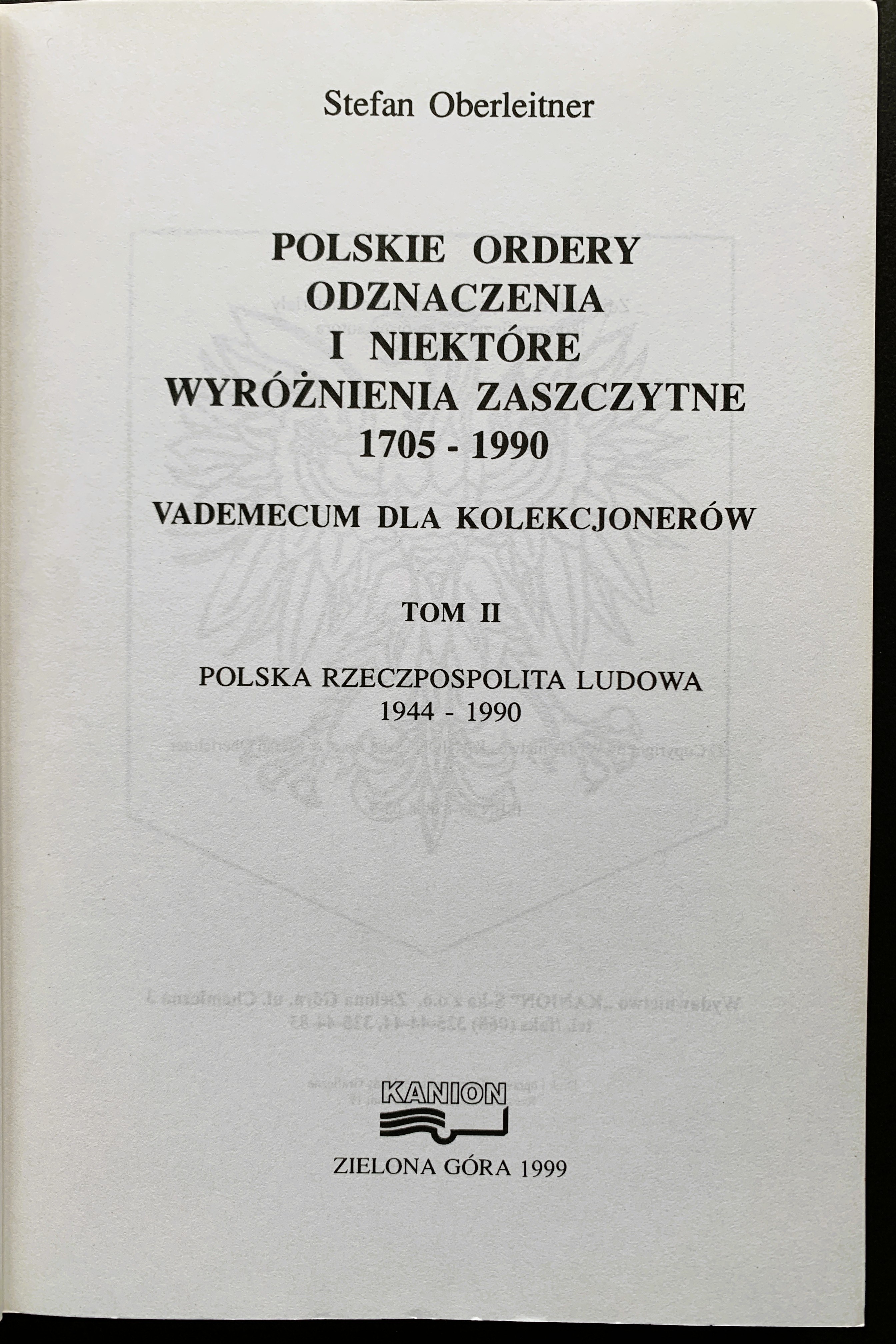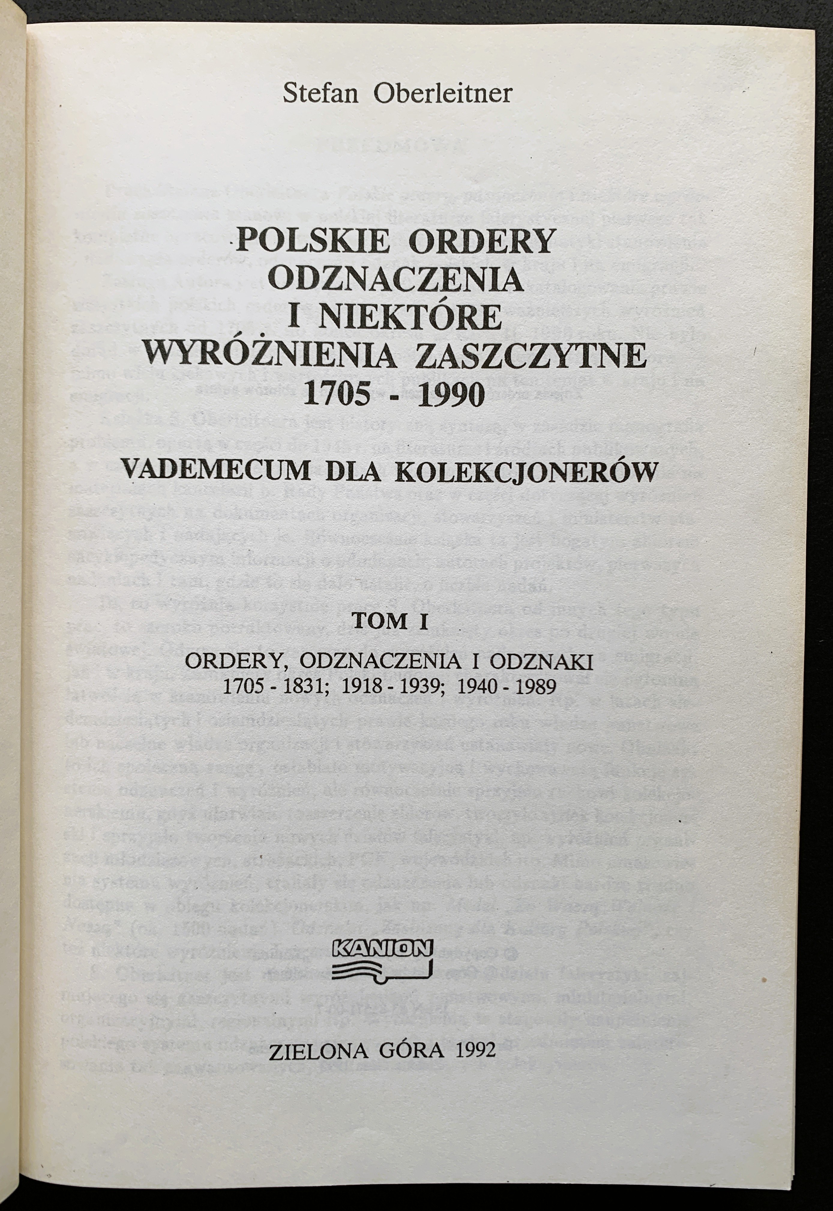 OBERLEITNER Stefan - Polskie ordery, odznaczenia i niektóre wyróżnienia zaszczytne 1705-1990. Tom I/II. Zielona Góra 1992/99. Kanion.