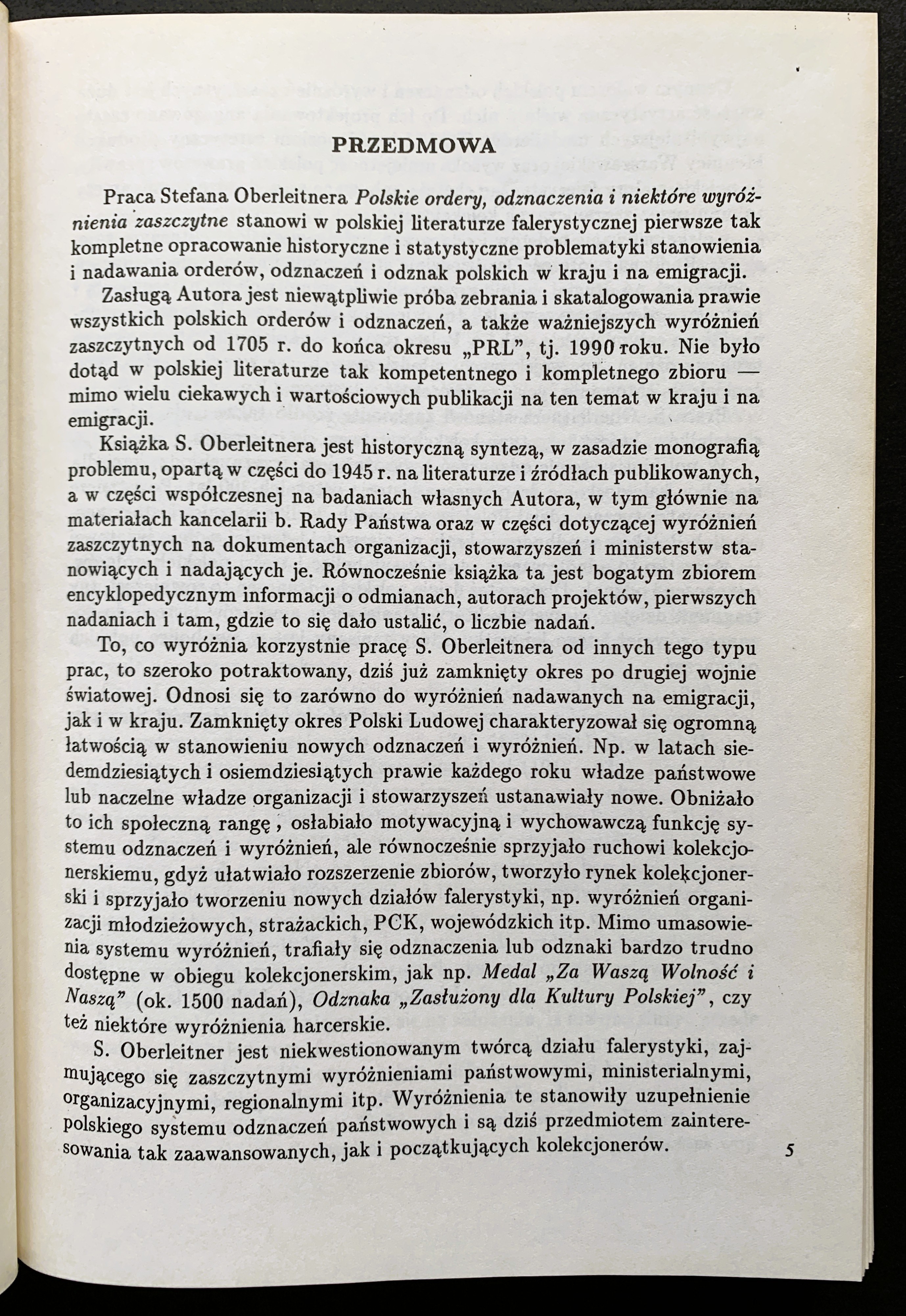 Z wstępu: "Praca Stefana Oberleitnera Polskie ordery, odznaczenia i niektóre wyróżnienia zaszczytne stanowi w polskiej literaturze falerystycznej pierwsze tak kompletne opracowanie historyczne i statystyczne problematyki stanowienia i nadawania orderów, odznaczeń i odznak polskich w kraju i na emigracji. Zasługą Autora jest niewątpliwie próba zebrania i skatalogowania prawie wszystkich polskich orderów i odznaczeń, a także ważniejszych wyróżnień zaszczytnych od 1705 r. do końca okresu „PRL", tj. 1990 roku. Nie było dotąd w polskiej literaturze tak kompetentnego i kompletnego zbioru mimo wielu ciekawych i wartościowych publikacji na ten temat w kraju i na emigracji. Książka S. Oberleitnera jest historyczną syntezą, w zasadzie monografią problemu, opartą w części do 1945 r. na literaturze i źródłach publikowanych, a w części współczesnej na badaniach własnych Autora, w tym głównie na materiałach kancelarii b. Rady Państwa oraz w części dotyczącej wyróżnień zaszczytnych na dokumentach organizacji, stowarzyszeń i ministerstw stanowiących i nadających je. Równocześnie książka ta jest bogatym zbiorem encyklopedycznym informacji o odmianach, autorach projektów, pierwszych nadaniach i tam, gdzie to się dało ustalić, o liczbie nadań...".