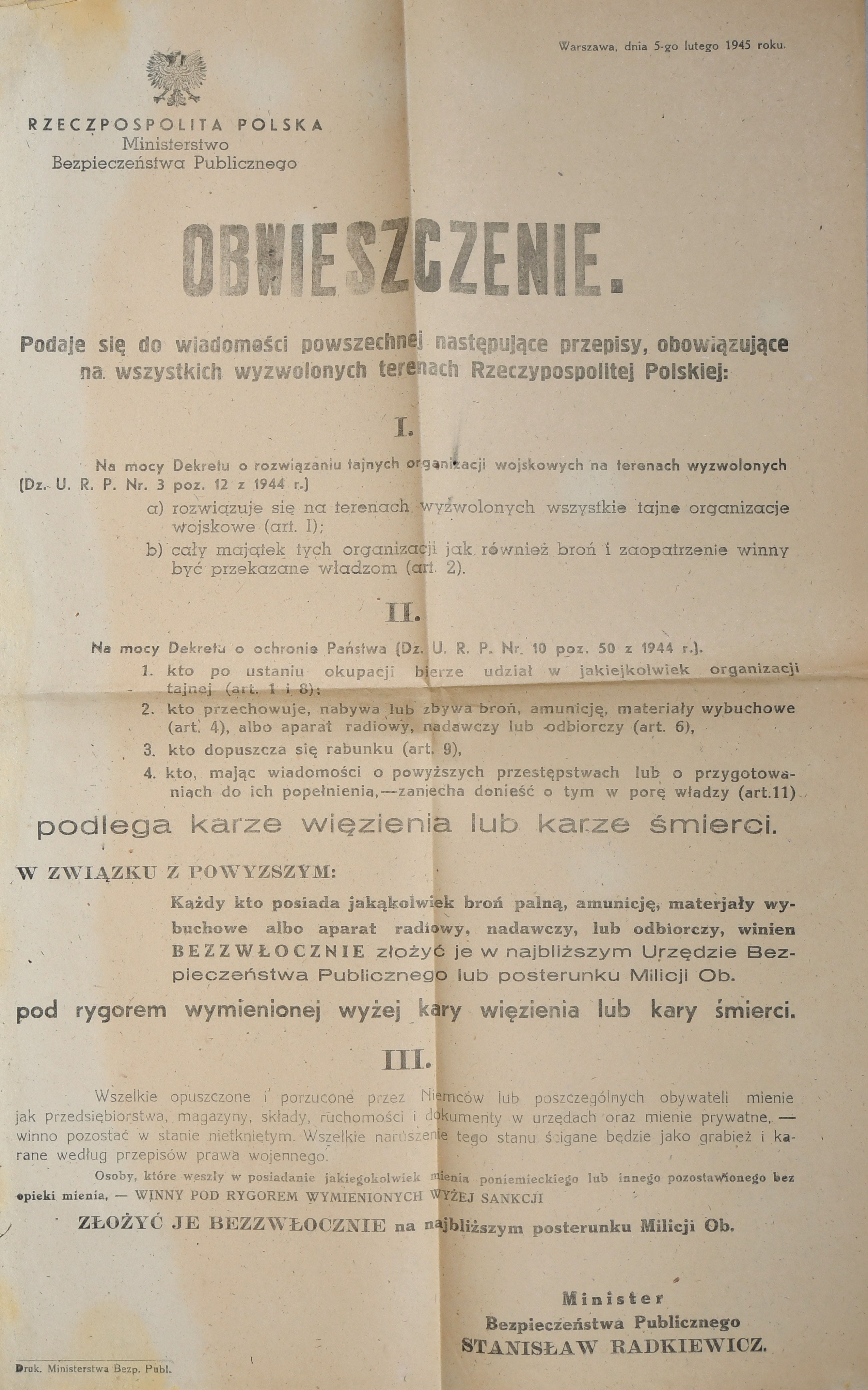 Druk. Ministerstwa Bezp. Publ., Warszawa, dnia 5-go lutego 1945 r. Wym.: 31 x 49 cm. Ślady złożenia, poza tym stan dobry.