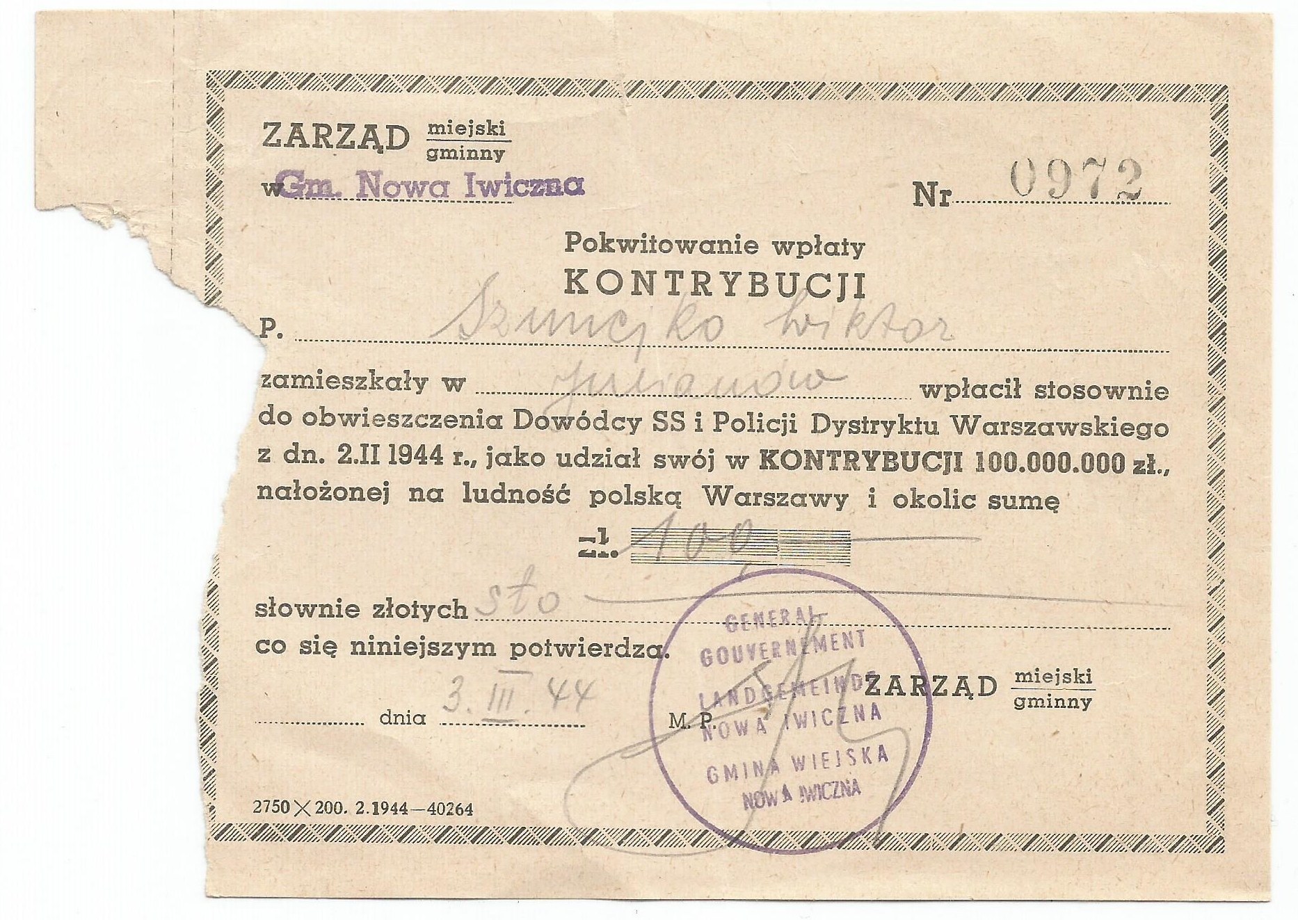 Egzemplarz z wydartym potwierdzeniem, lekko naddarty.