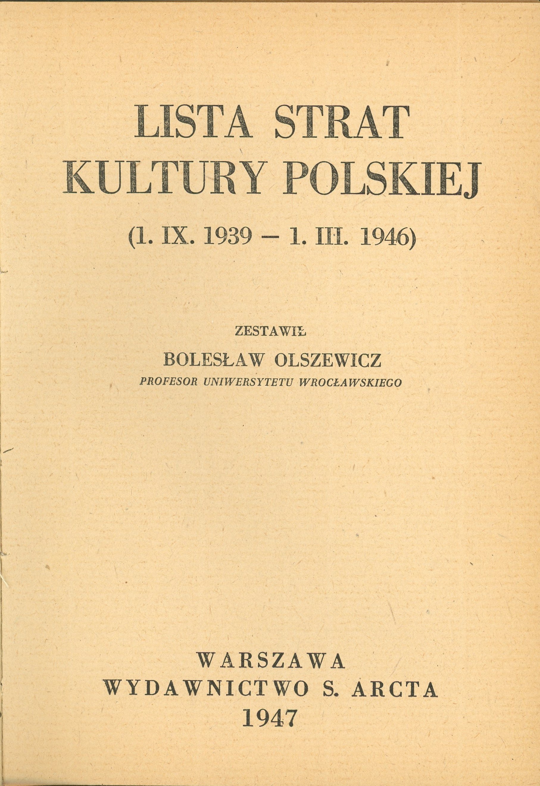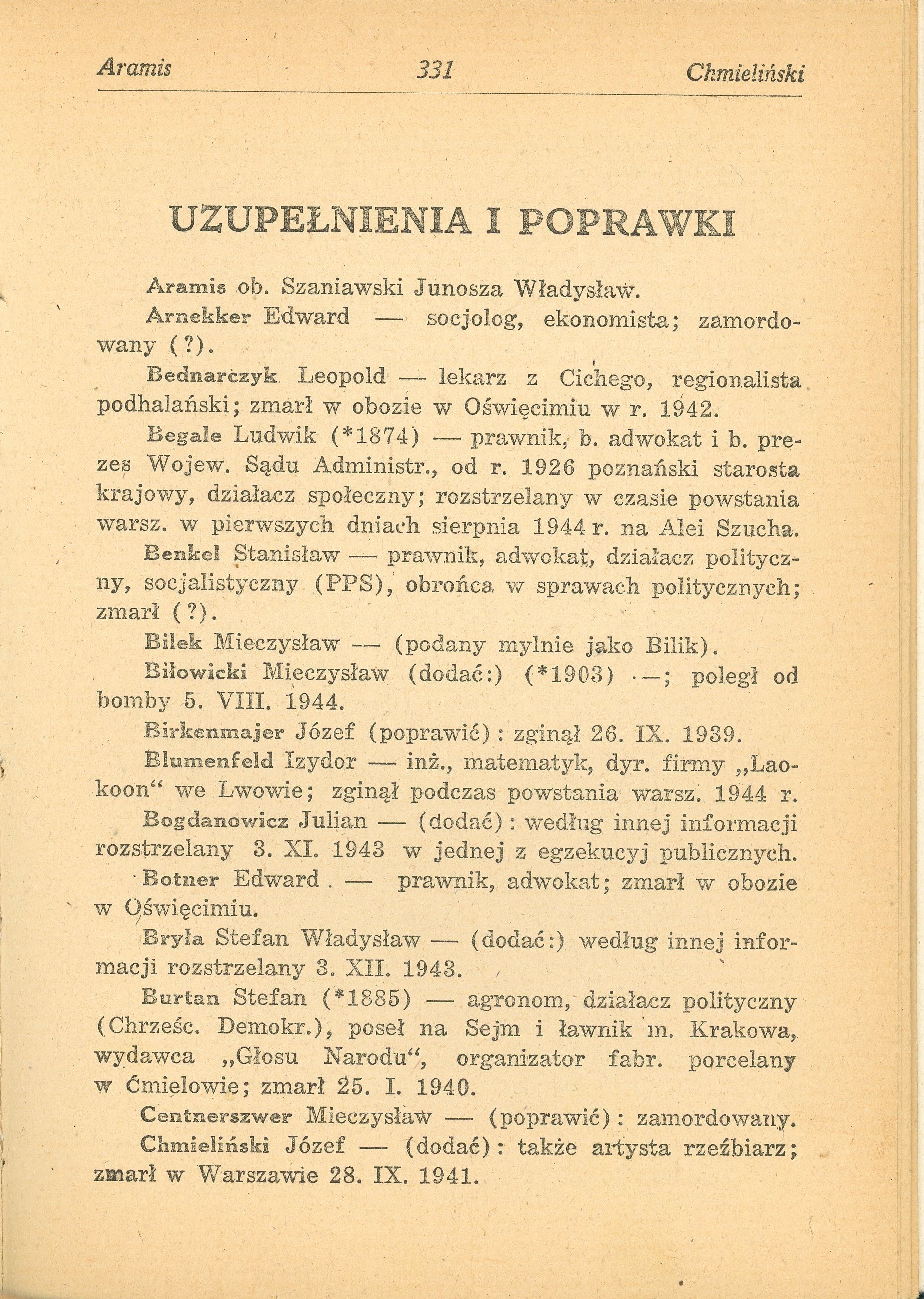 Warszawa, 1947. Wyd. S. Arct. 16, s. XVI, 336, okł. oryg. proj.: M. Bilińska., opr. pł. współczesna, płótno zielone. Stan bardzo dobry. W układzie alfabetycznym nazwiska osób (z krótkim biogramem), które zginęły w okresie okupacji niemieckiej.