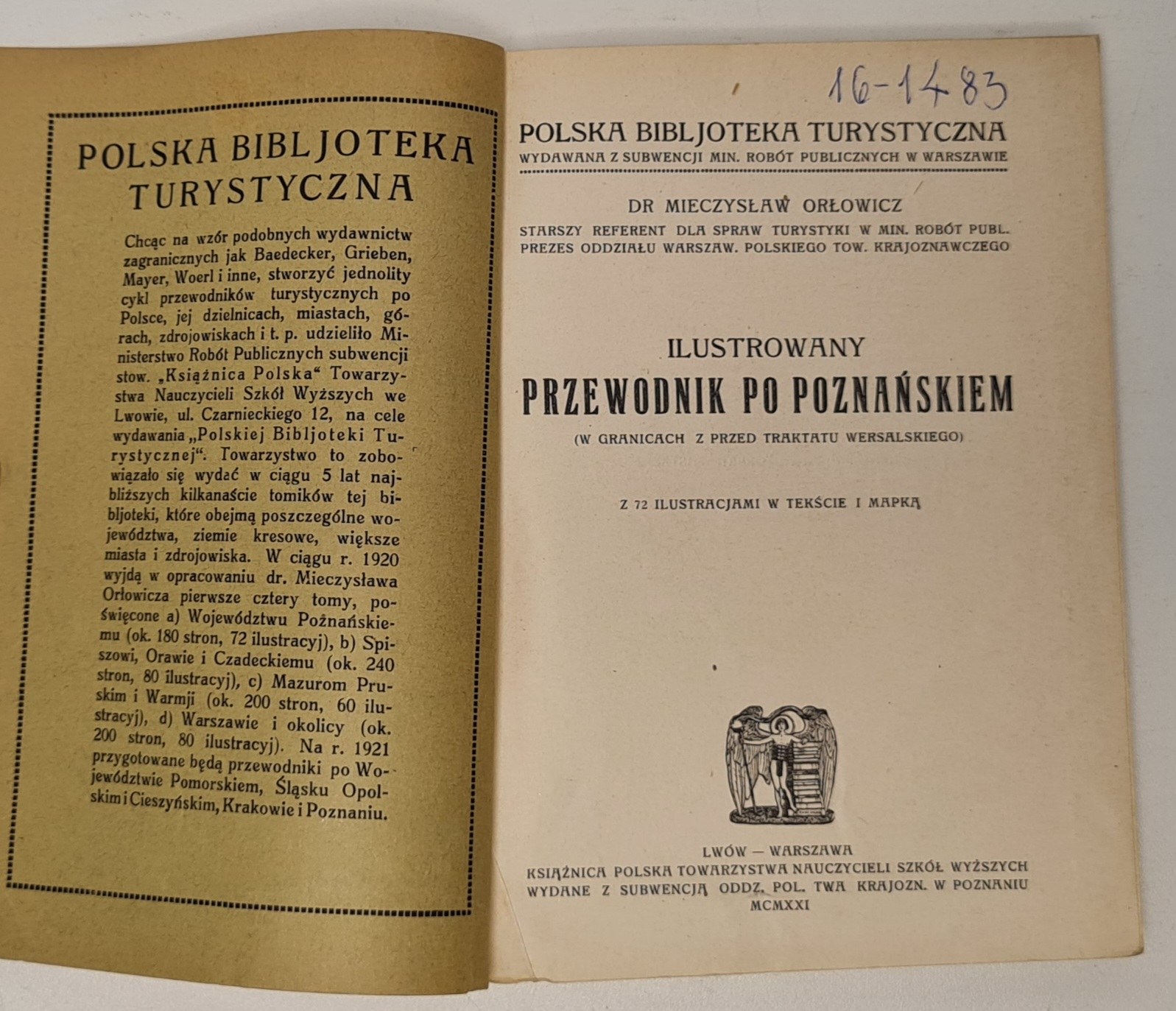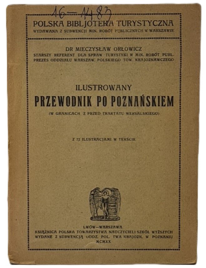 Orłowicz Mieczysław -  Ilustrowany przewodnik po Poznańskiem. (W granicach z przed traktatu wersalskiego). Lwów-Warszawa 1920, Książnica Polska, [4], 189, [2] s., il., [1] mapa rozkł., 12x16,5 cm, opr. pł. z zach oryginalną okładką brosz. Polska Bibljoteka Turystyczna. Na końcu indeks alfabetyczny nazw miejscowości polsko-niemiecki. Grzbiet lekko spłowiały z niewielkim ubytkiem na dole, Odręcznie napisany numer na okładce i str. tyt.  wewnątrz czysty egz.
