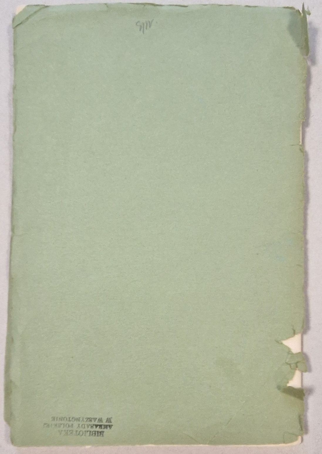 Stan: okładki luzem, przedarte na grzbiecie (tamże niewielkie ubytki papieru), drobne zagniecenia i zabrudzenia, nieliczne pęknięcia na marginesach, w środku zagniecenie prawego górnego narożnika, kilka zaznaczeń w tekście (zwł. str. 41-46 - opisane na okładce).