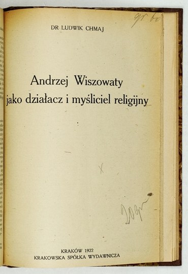 [oraz] CHMAJ Ludwik – Andrzej Wiszowaty jako działacz i myśliciel religijny. Kraków 1922. Krakowska Spółka Wydawnicza. 8, s. 46, [1]. razem opr. późn. ppł.
