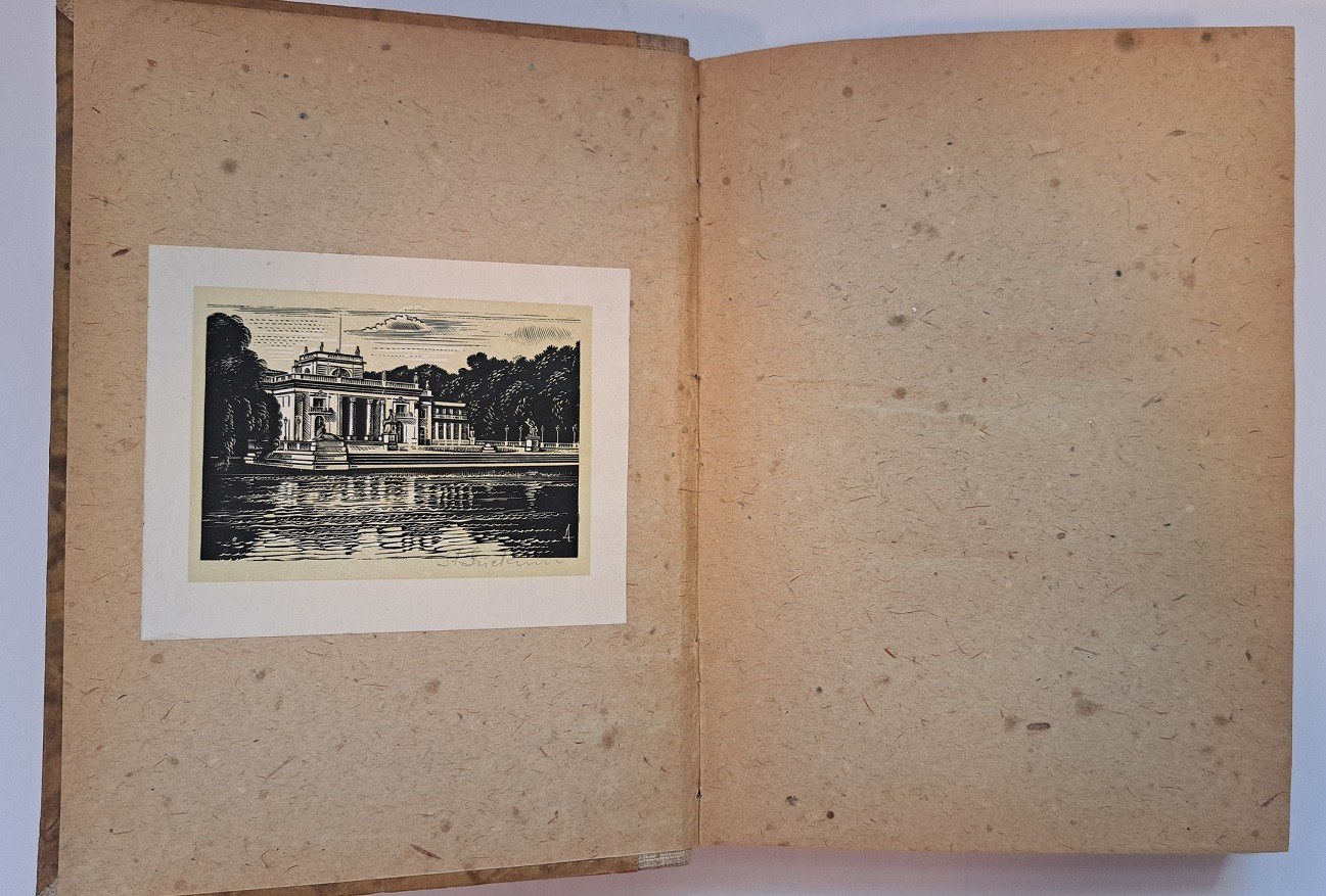 Na wyklejce wklejony drzeworyt przedstawiający warszawski Pałac na wodzie [drzeworyt sygnowany podpisem ochronnym St. Łuckiewicza]