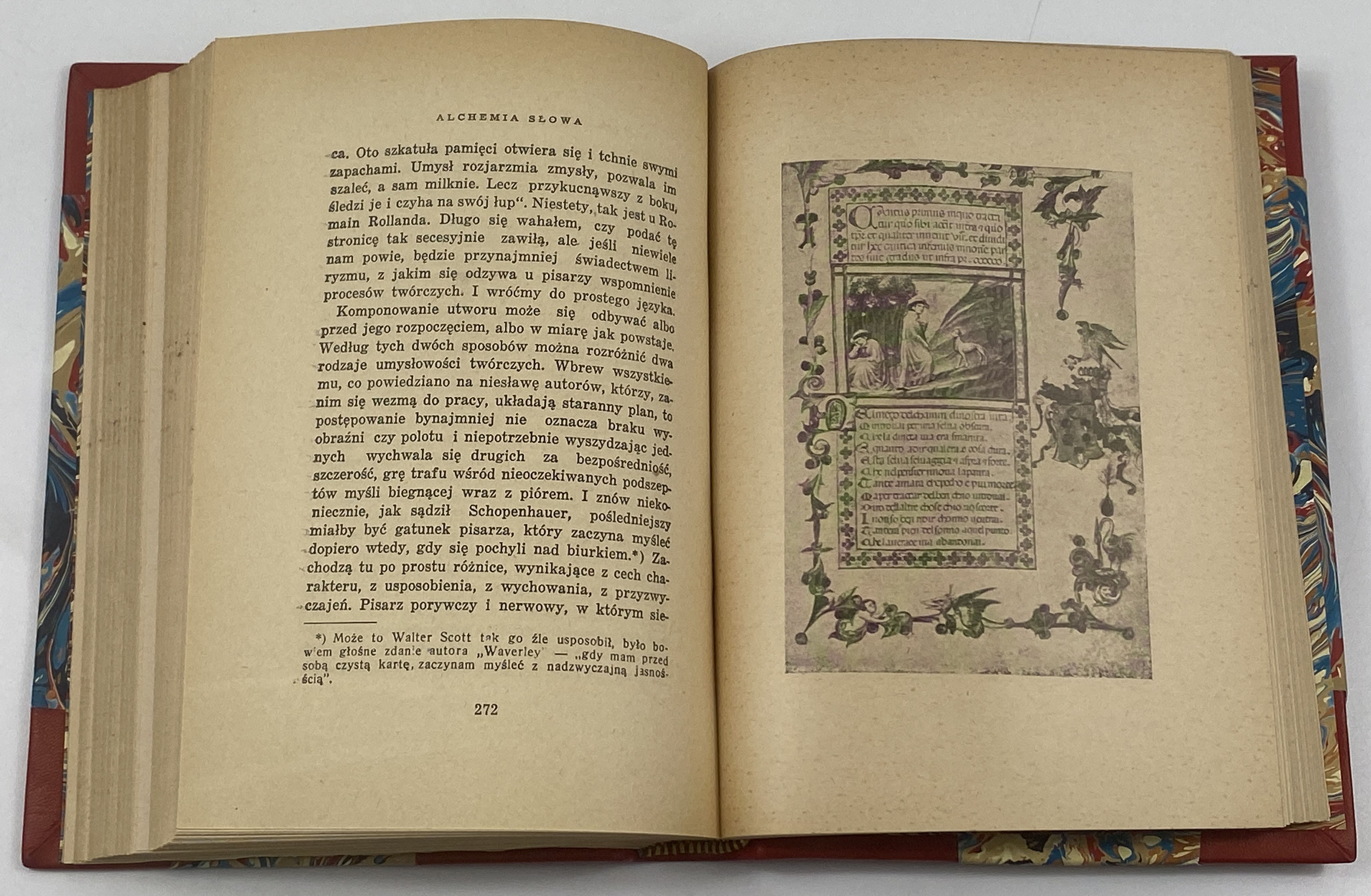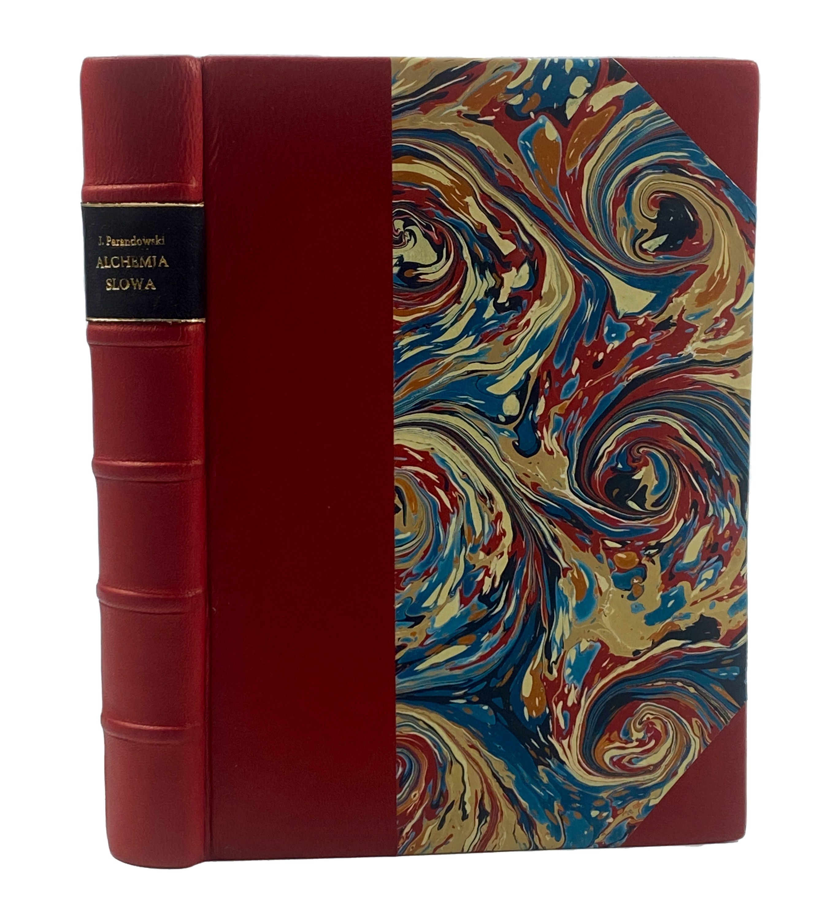 Parandowski Jan, Alchemia słowa, nakł. Gebethner i Wolff, druk Praska Spółdzielnia Pracy Drukarzy i Introligatorów, Warszawa 1951 [1950], wydanie I, s. 365, wymiary 15 x 21 cm. Projekt obwoluty i okładki Kazimierz Holewiński. Obca dedykacja na stronie tytułowej. Półskórek współczesny wykonany ręcznie w pracowni Suszek Books.