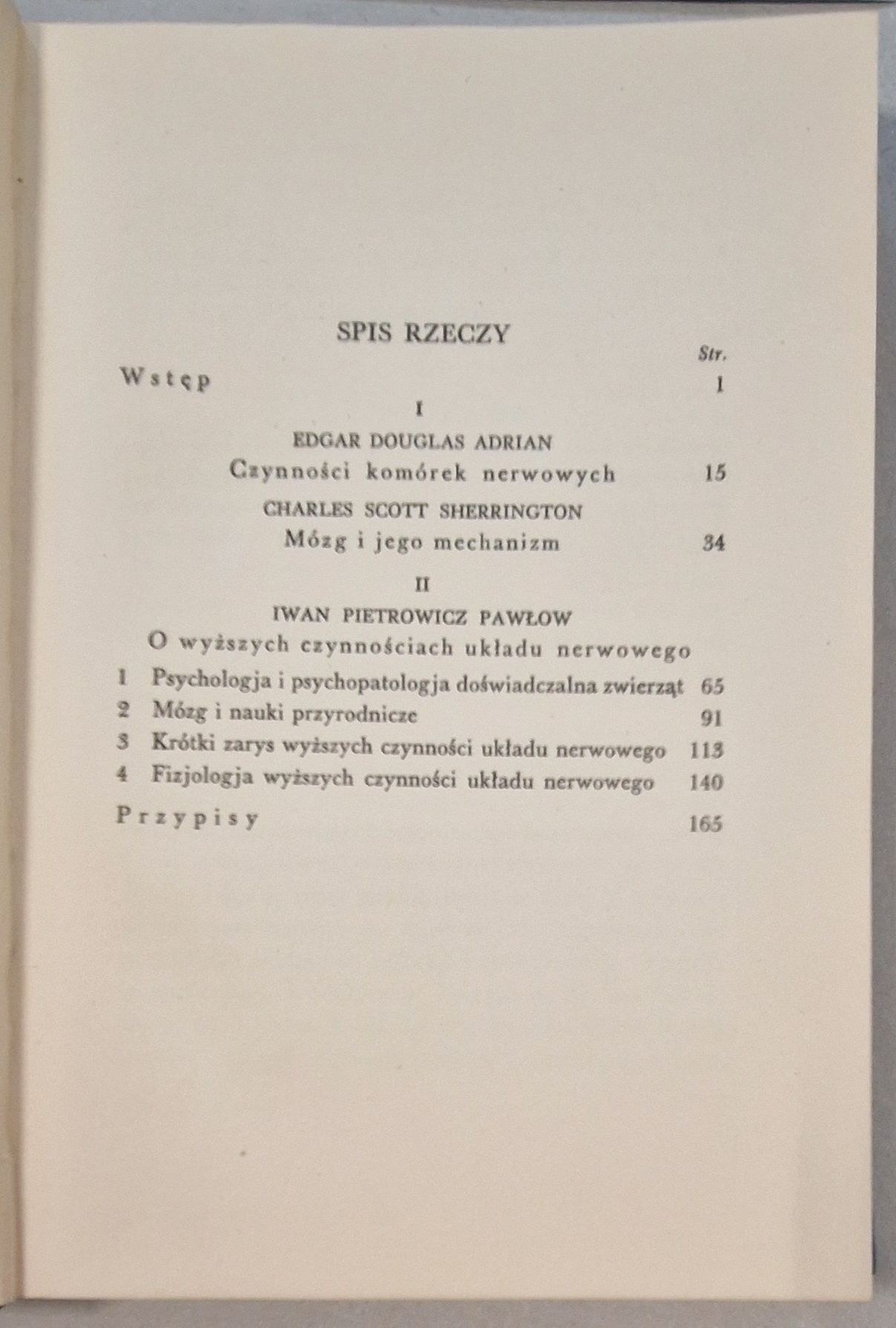 Zbiór artykułów trzech wybitnych fizjologów, laureatów nagrody Nobla. Wśród publikacji: Charles Scott Sherrington „Mózg i jego mechanizm”; Edgar Douglas Adrian „ Czynności komórek nerwowych”; Iwan Pietrowicz Pawłow „O wyższych czynnościach układu nerwowego” (Psychologia i psychopatologia doświadczalna zwierząt; Mózg i nauki przyrodnicze; Krótki zarys wyższych czynności układu nerwowego; Fizjologia wyższych czynności układu nerwowego).