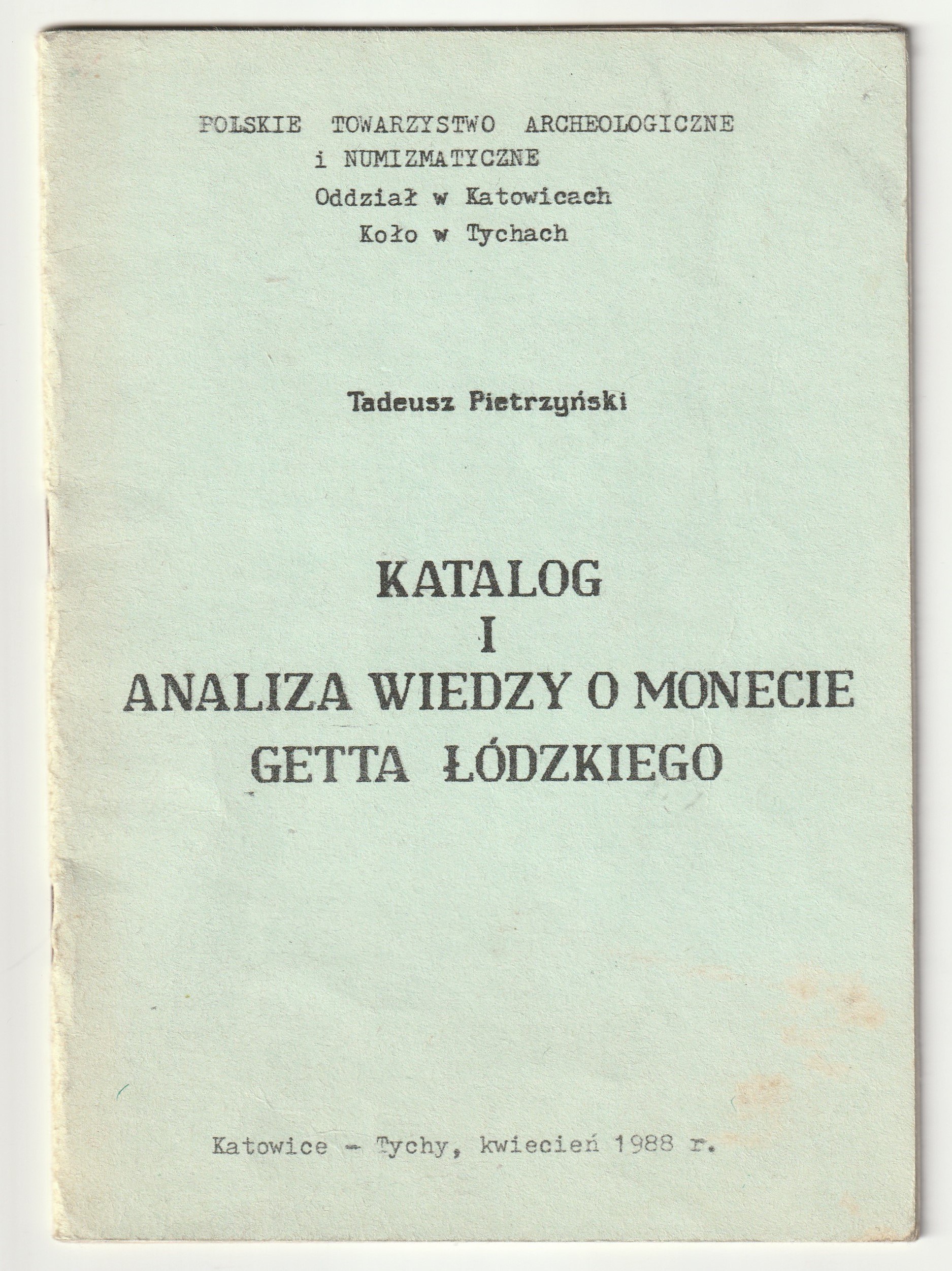 PIETRZYŃSKI Tadeusz. Katalog i analiza wiedzy o monecie getta łódzkiego, Katowice -Tychy, 1988, str. 23; oprawa miękka, st. bdb.; wym. ok. 140x200 mm.