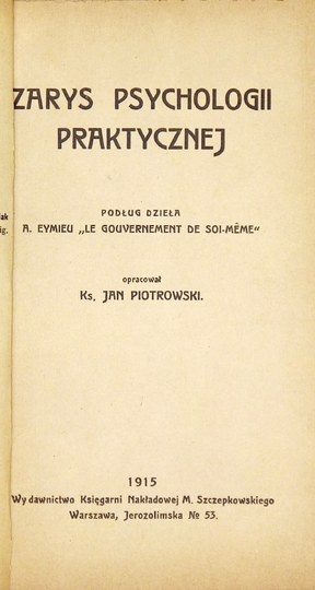 PIOTROWSKI Jan - Zarys psychologii praktycznej. Podłud dzieła A. Eymieu "Le Gouvernement de soi meme". Warszawa 1915. Wyd. Księgarni Nakładowej M. Szczepkowskiego. 8, s. 141, [3]. brosz. Wiedza i Prawda.