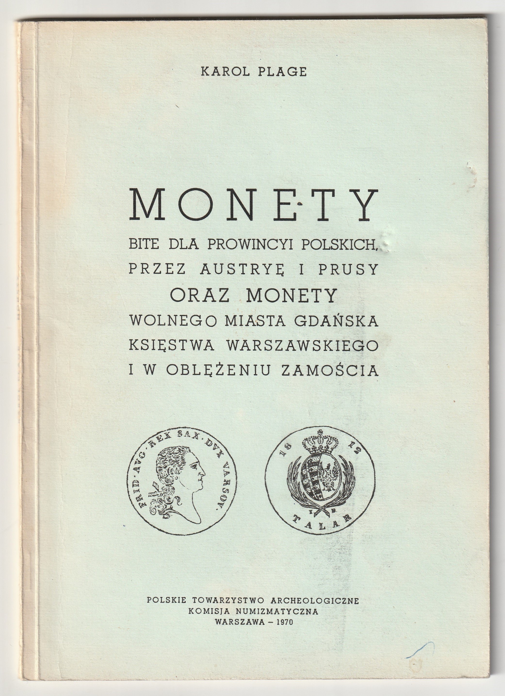 PLAGE Karol. Monety bite dla prownicyj polskich, przez Austryę i Prusy oraz monety Wolnego Miasta Gdańska Księstwa Warszawskiego i w oblężeniu Zamościa, wyd. PTAiN, Warszawa 1970, str. 32+8 nn z 127 rys. cz.-b.; oprawa miękka z drobnymi zabrudzeniami i zagnieceniami, zagięcie górnego rogu tylnej okładki, poza tym st. bdb.; wym. ok. 163x230 mm.