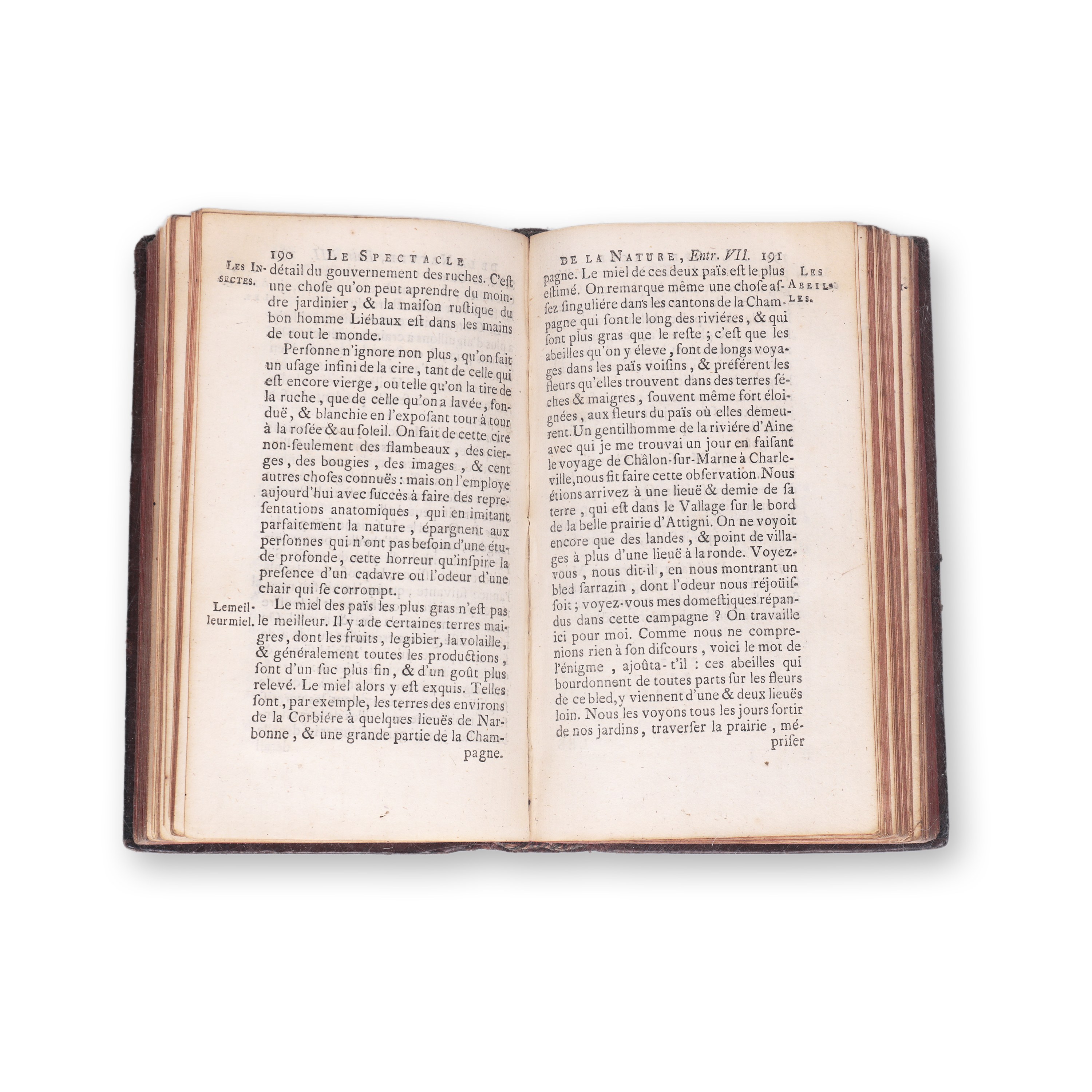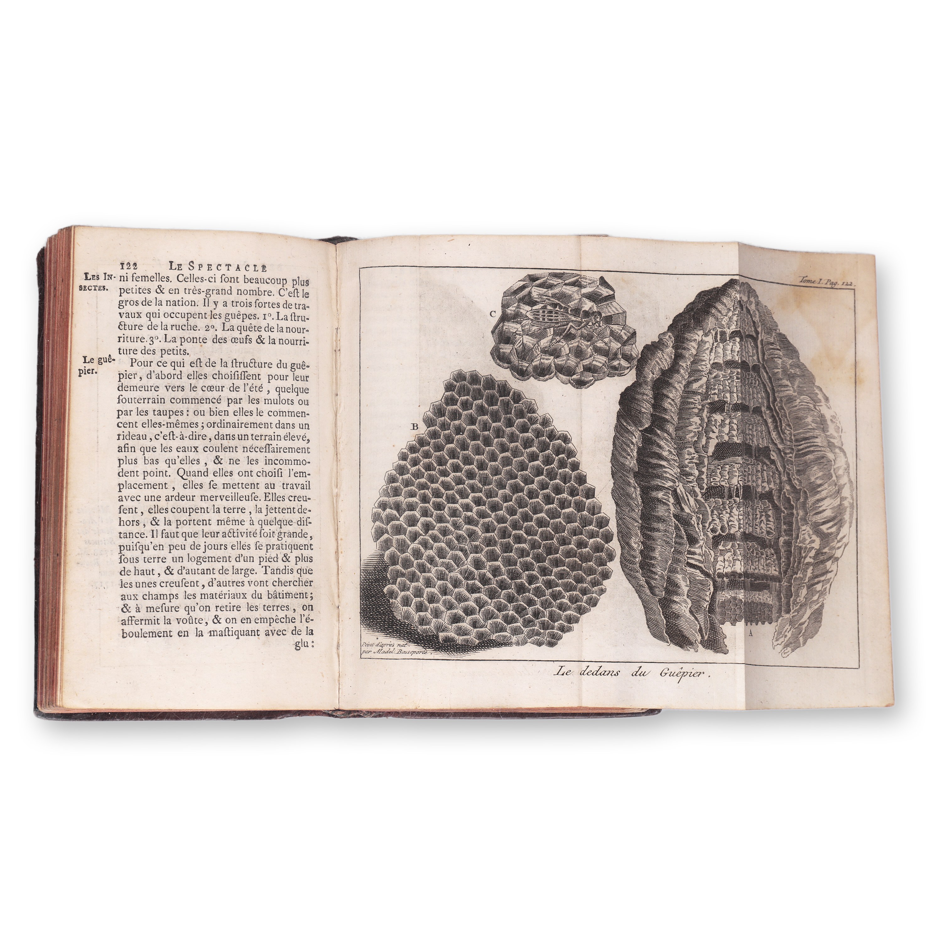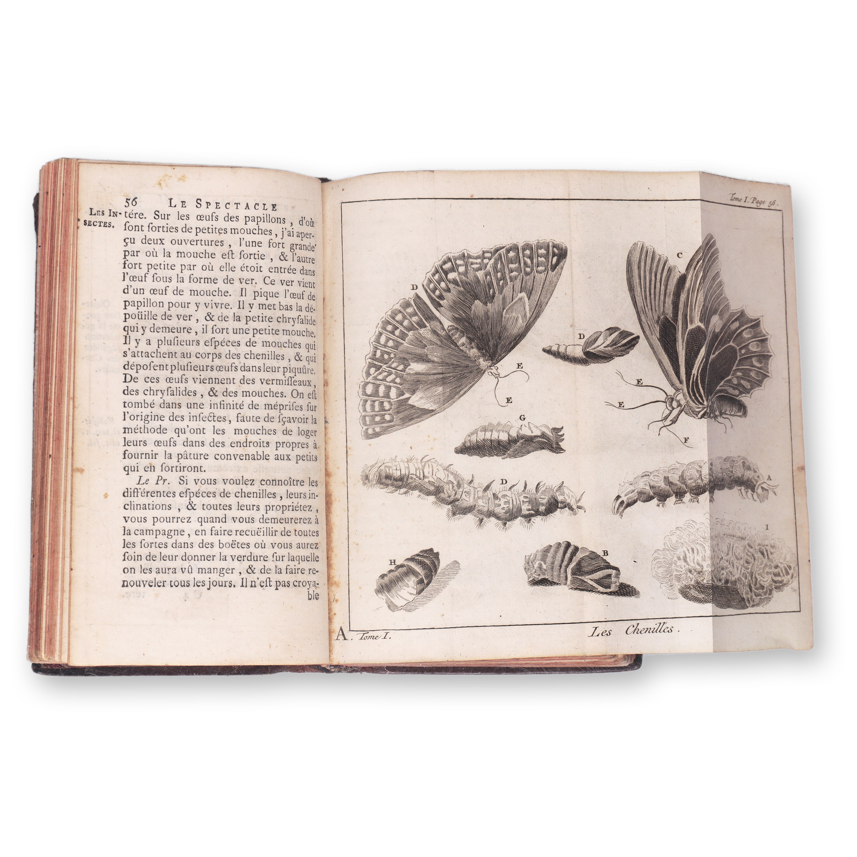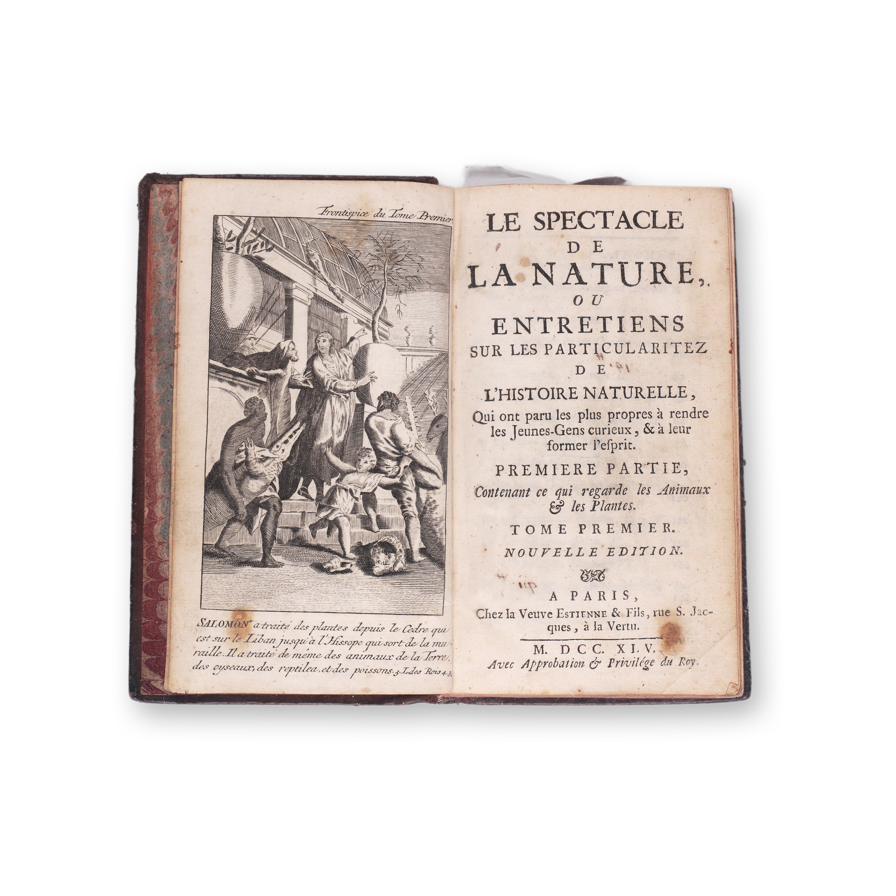 1745 | PUBLISHER: Paris, Veuve Estienne | NUMBER OF PAGES: 560 | LANGUAGE: French | DIMENSIONS: 167 x 101 mm | THE FULL TITLE OF THE WORK: Le spectacle de la nature, ou Entretiens sur les particularites de l'Histoire naturelle, qui ont paru les plus propres a rendre les jeunes - gens curieux, et a leur former l'esprit. Premiere partie, contenant ce qui regarde les animaux et les plantes. Tome premier. | NOTE: copperplate engravings, folding illustrations | CONDITION: spots, inscriptions on the endpaper