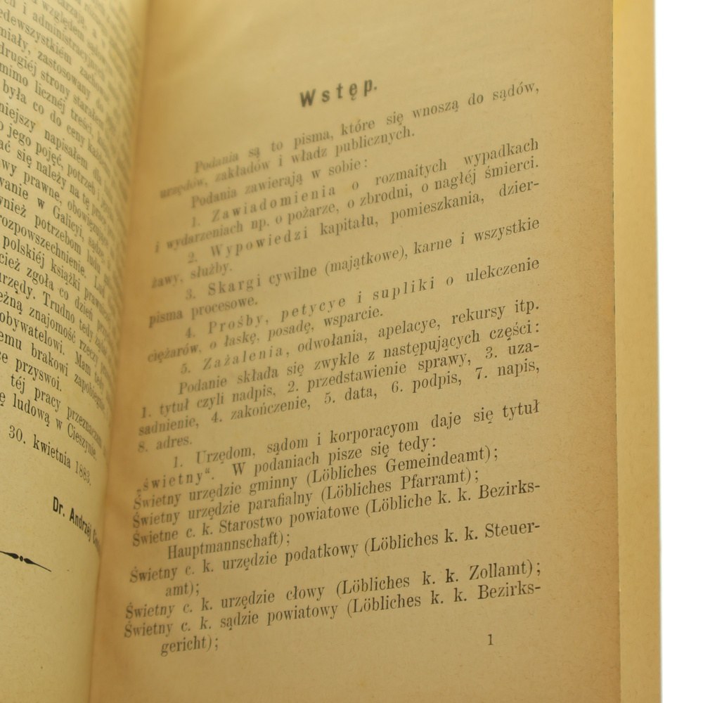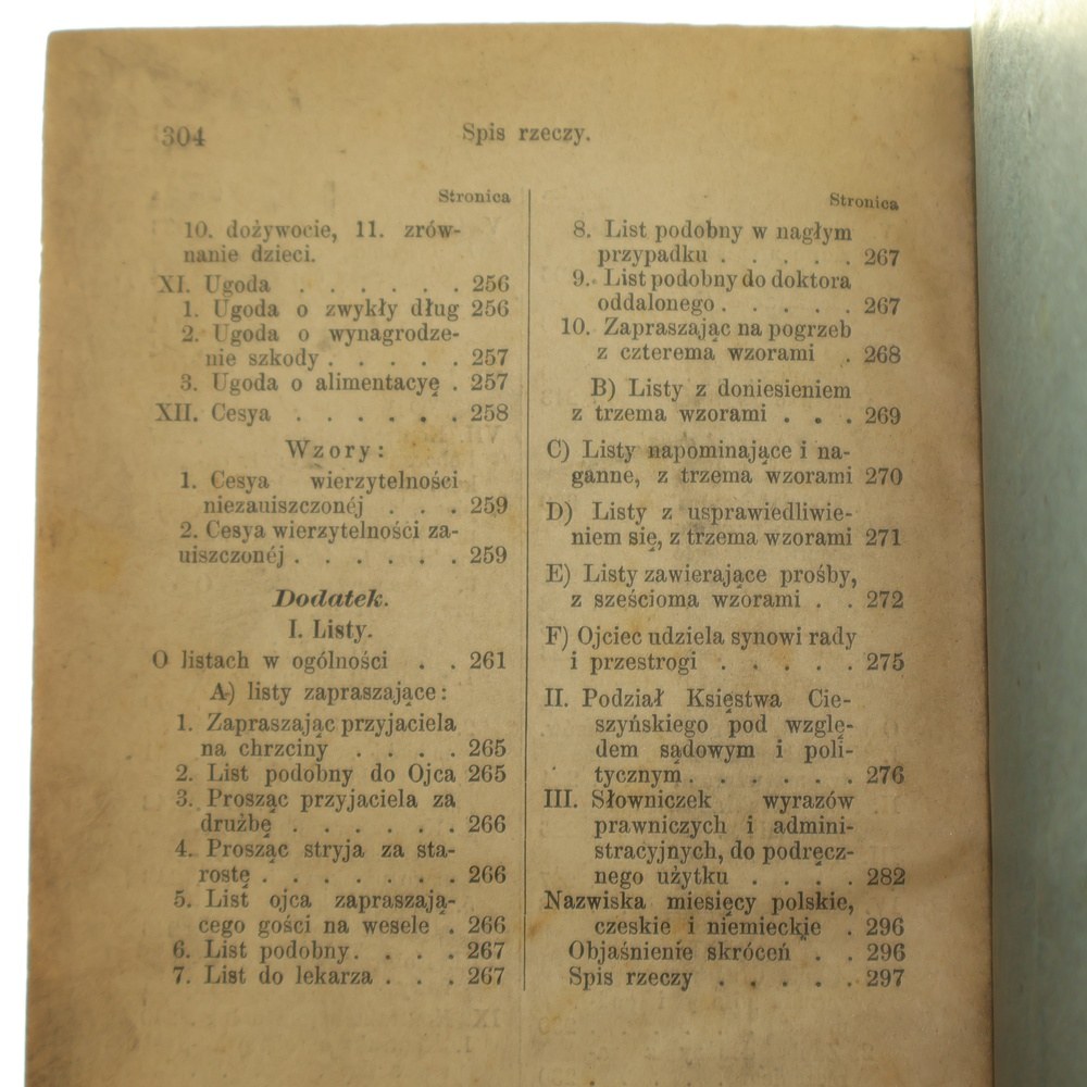 tytuł | Podręcznik prawniczy Książka dla ludu, zawierająca przykłady próśb, podań i skarg w sprawach niespornych, spornych i karnych, nareszcie dodatek obejmujący listy, spis wiosek w Księstwie Cieszyńskim |